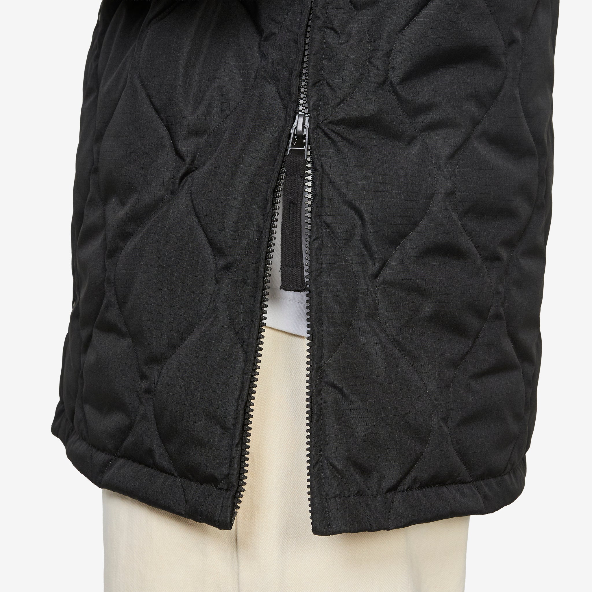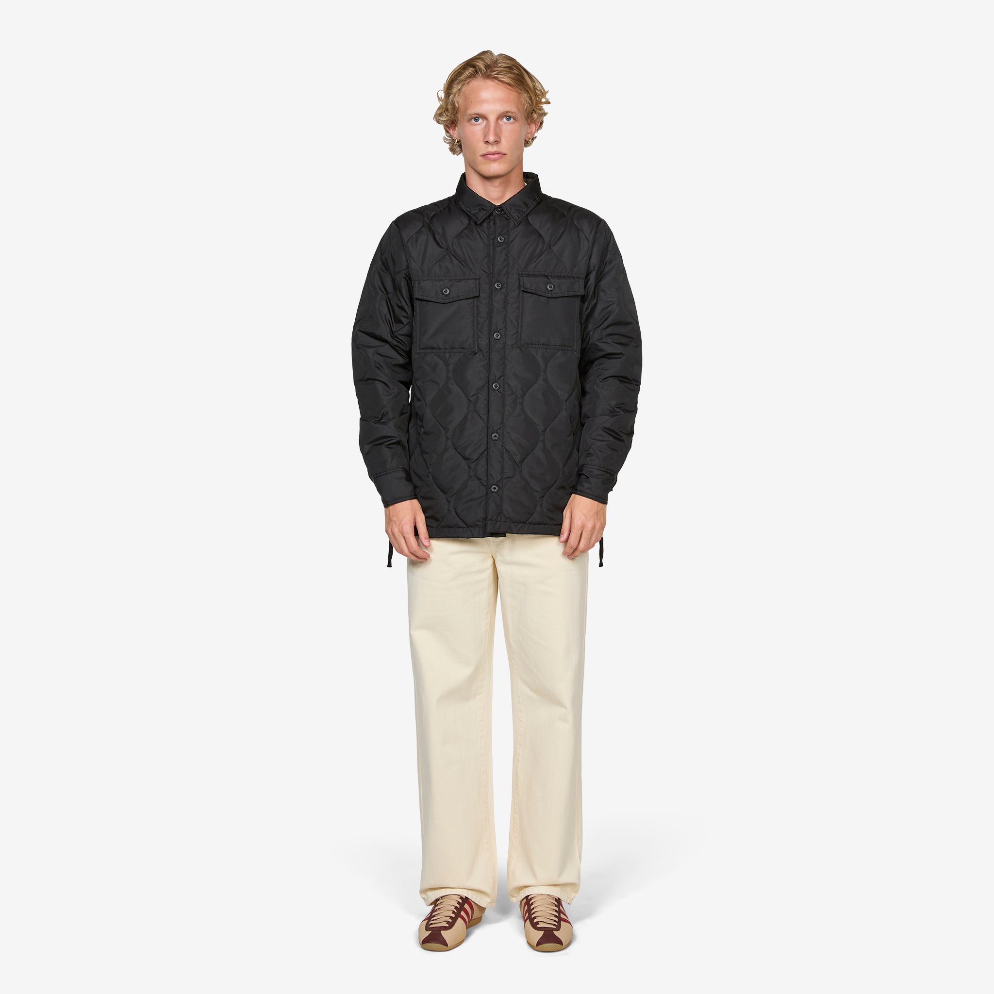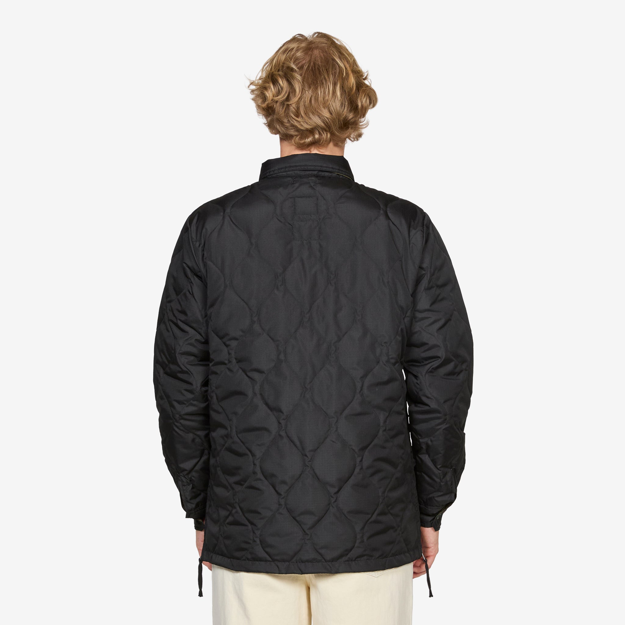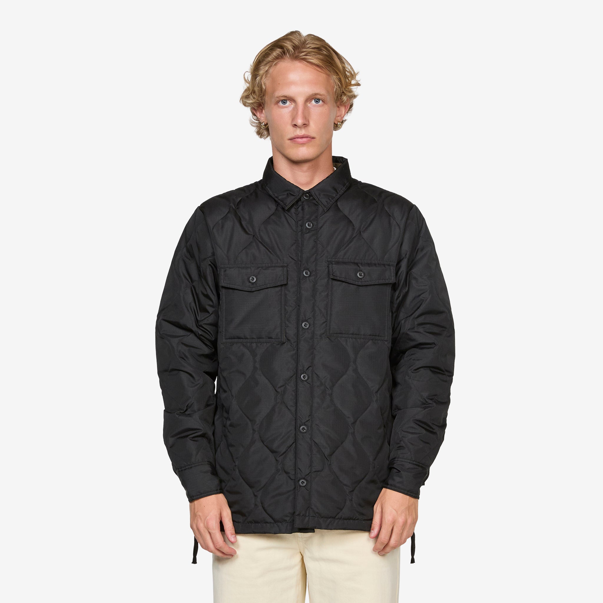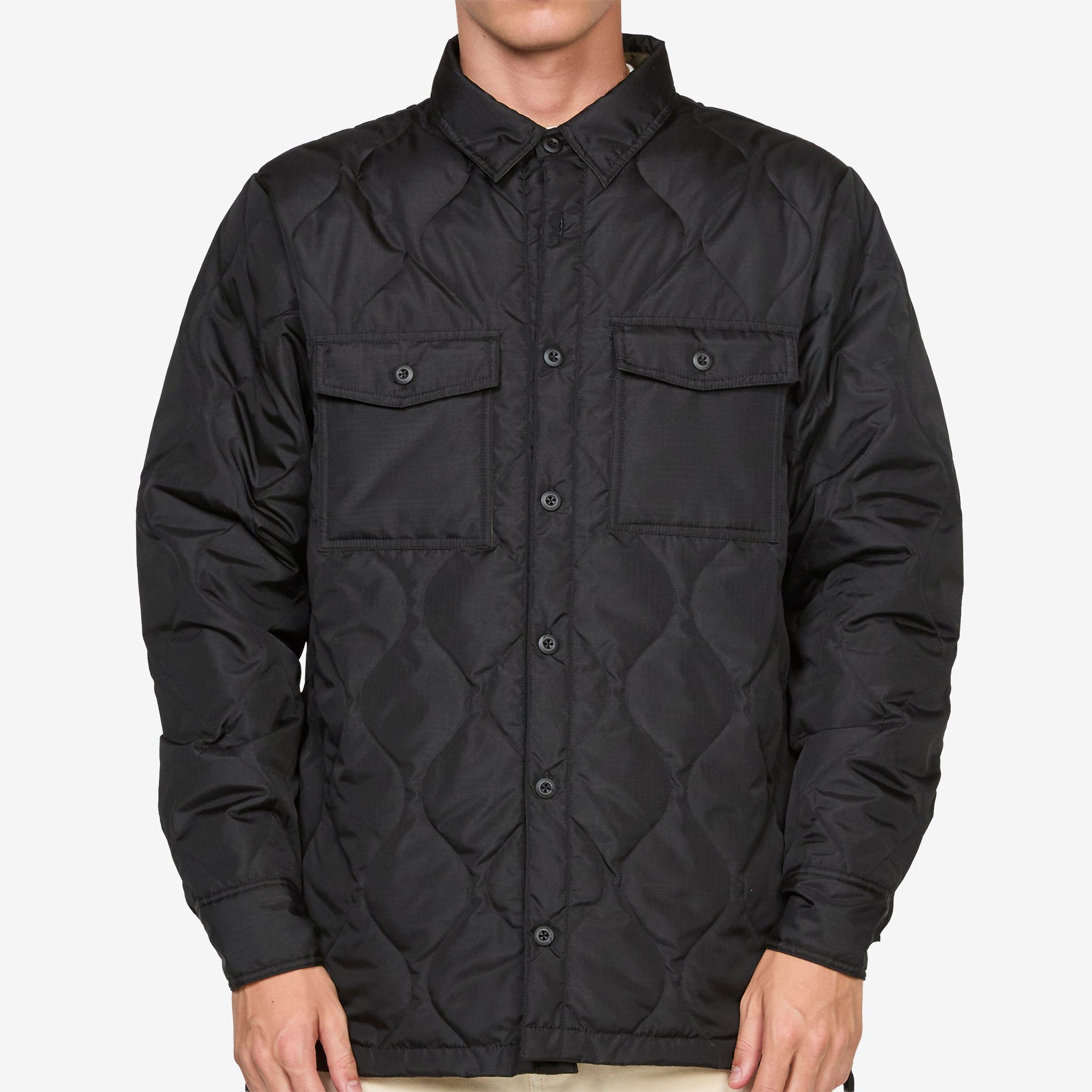 Military Down Shirt in Black from Taion. Regular fit shirt jacket with full button closure, a classic collar and flap-closure chest pockets. Crafted from durable polyester with a lightweight 800FP down filling and zippers on the sides for freedom of movement and styling options. Finished with a storage bag it can be packed into.