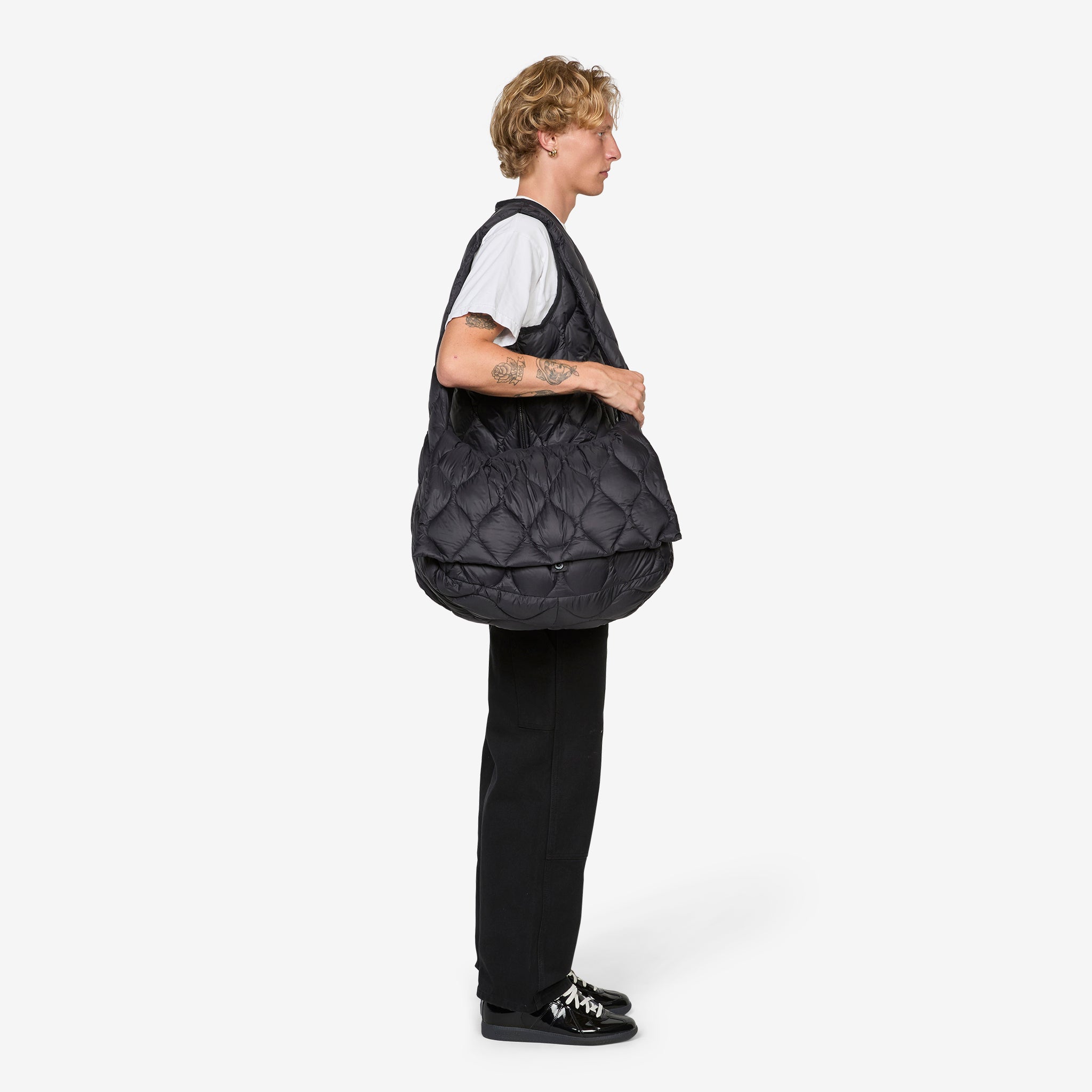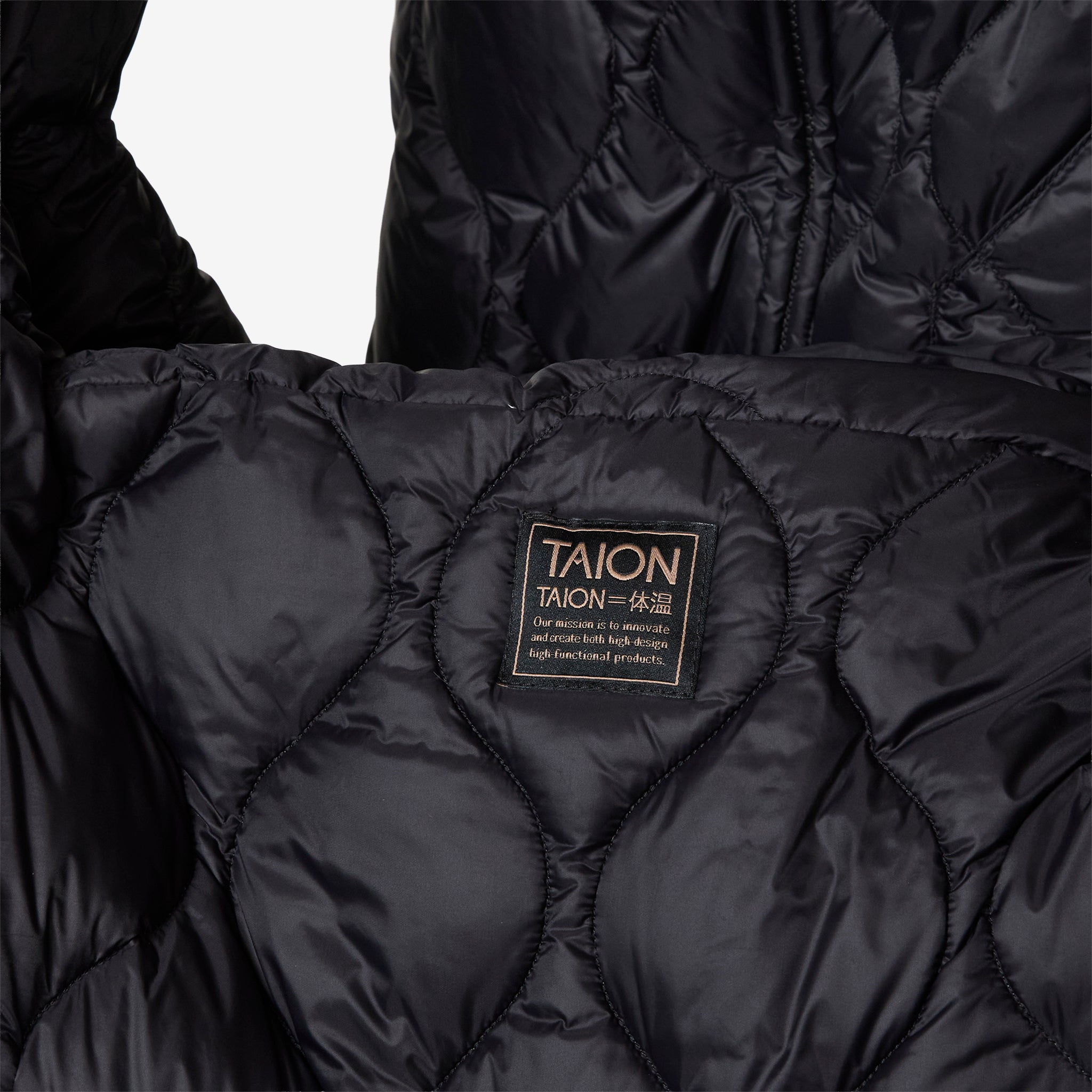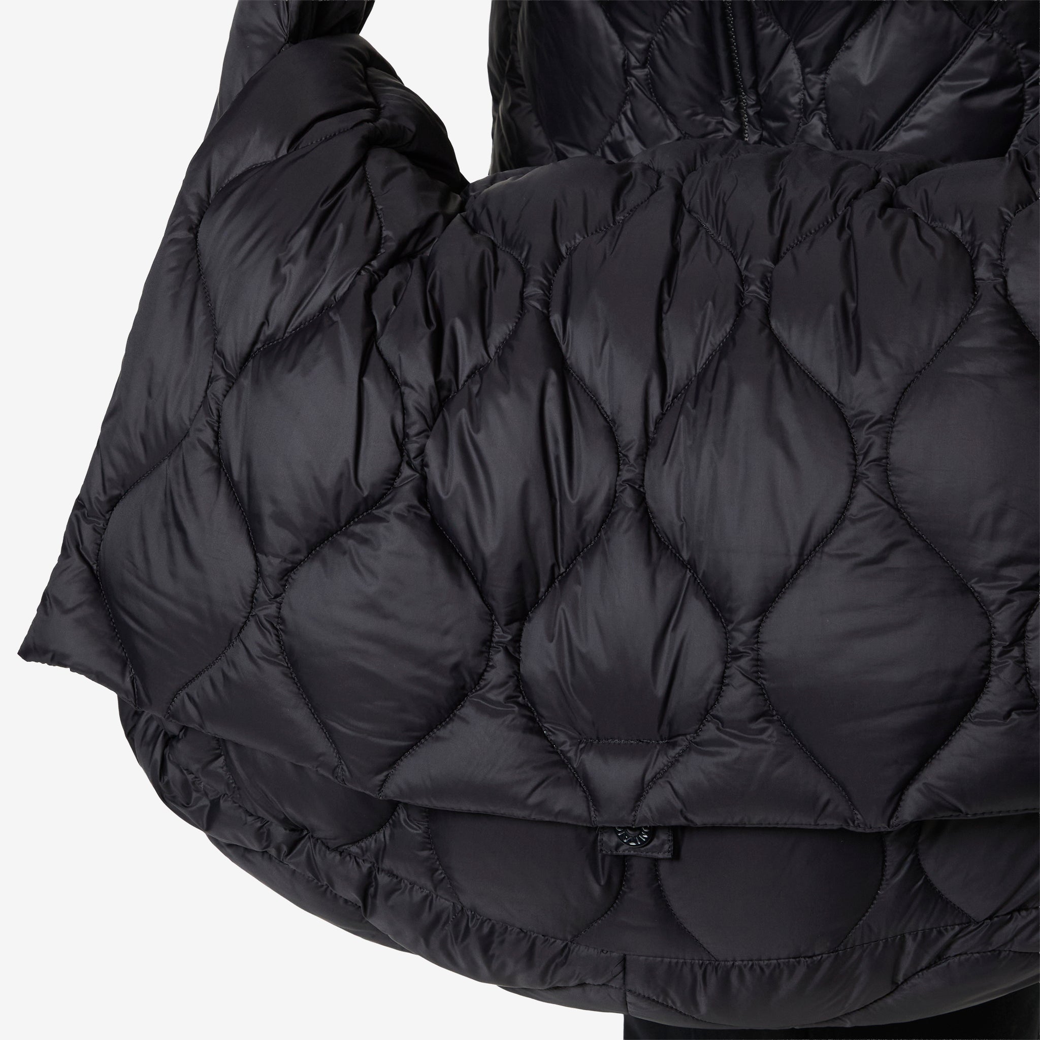 Military Messenger Down Bag (L) in Black from Taion. Medium-sized messenger bag with a fixed crossbody strap, hidden zip closure and a padded central flap-closure. Crafted from a lightweight high density fabric and filled with premium 800 fill-power down. Finished with additional interior zip compartment and small brand patch beneath the central flap-closure.