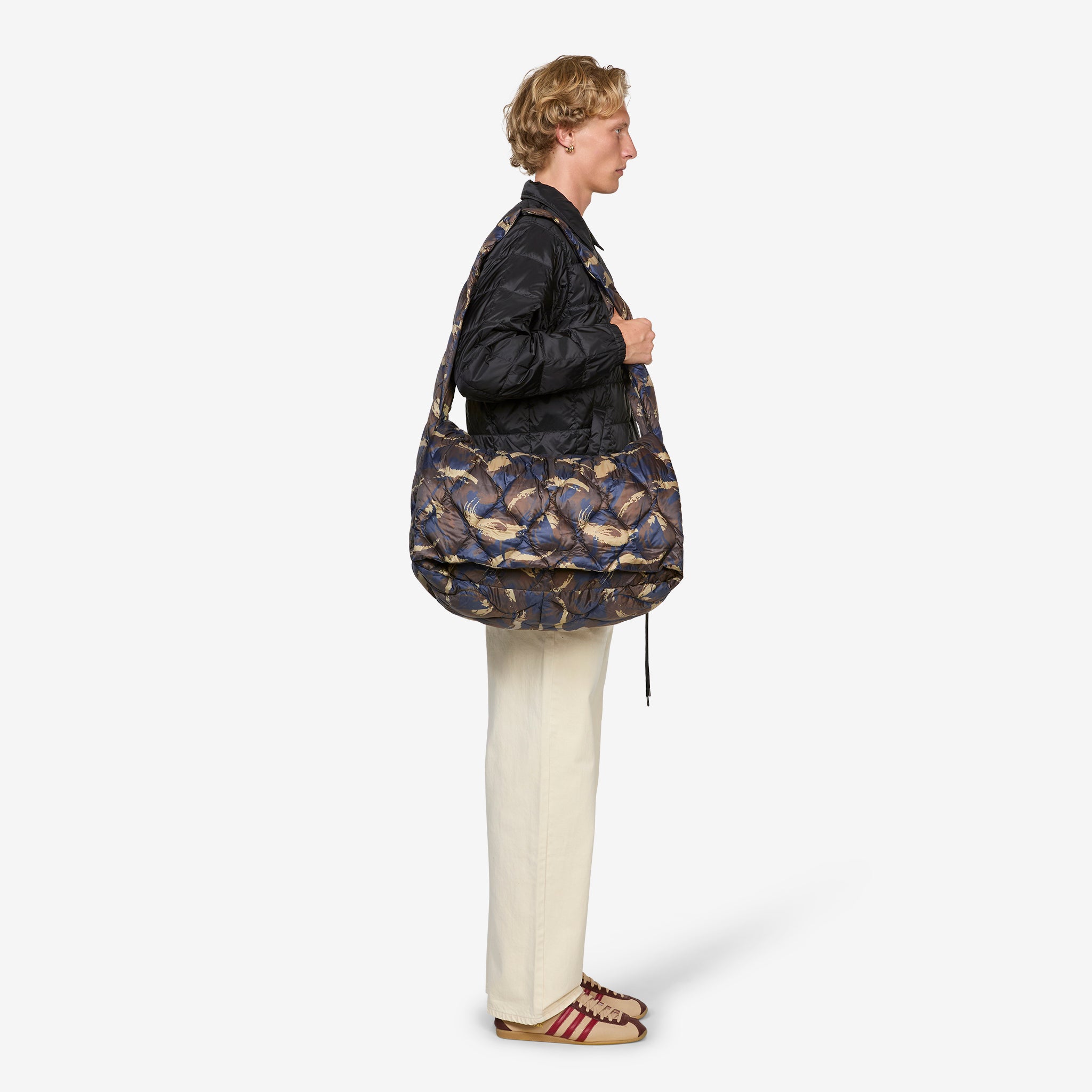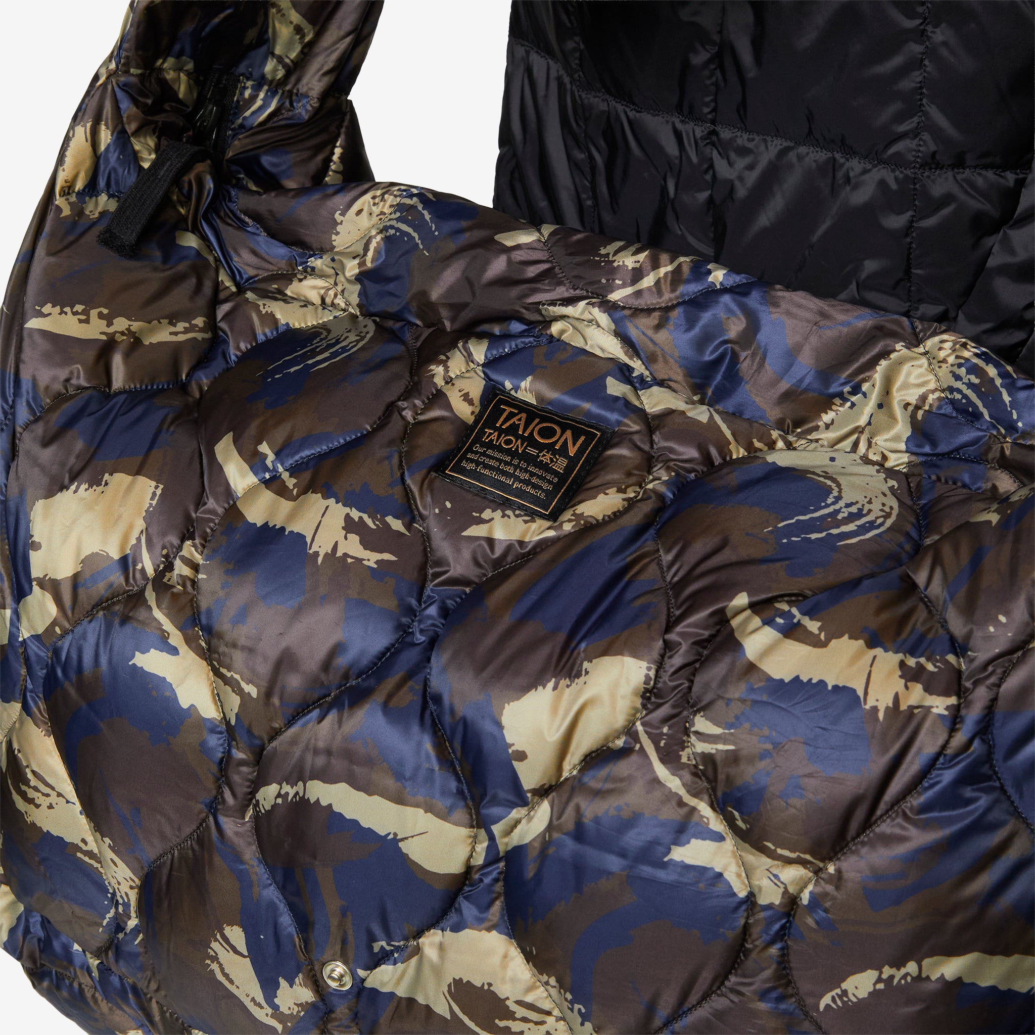 Military Messenger Down Bag (L) in Paint Camo from Taion. Medium-sized messenger bag with a fixed crossbody strap, hidden zip closure and a padded central flap-closure. Crafted from a lightweight high density fabric and filled with premium 800 fill-power down. Finished with additional interior zip compartment and small brand patch beneath the central flap-closure.