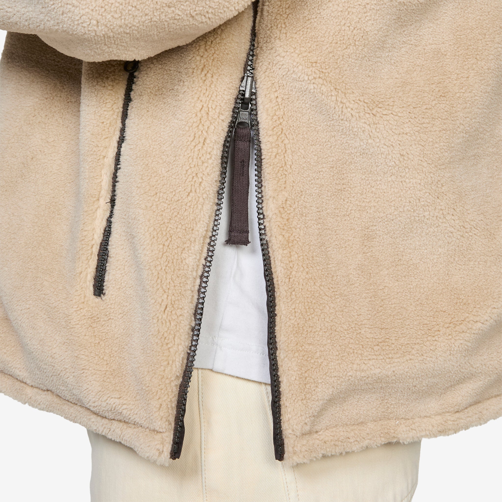 Military Reversible Down Boa Hi Neck Jacket in Dark Choco | Beige from Taion. Reversible jacket with full zip closure, high neck collar featuring a soft boa fleece interior and a 800 FP down-filled nylon exterior, with the w-layered down and boa offering excellent protection against cold wind and varied weather conditions. Constructed with side zippered slits for enhanced mobility and varied layering. Finished with top entry (outer side) front pockets, side entry zip pockets (inner side) and hanging loop behind the neck.