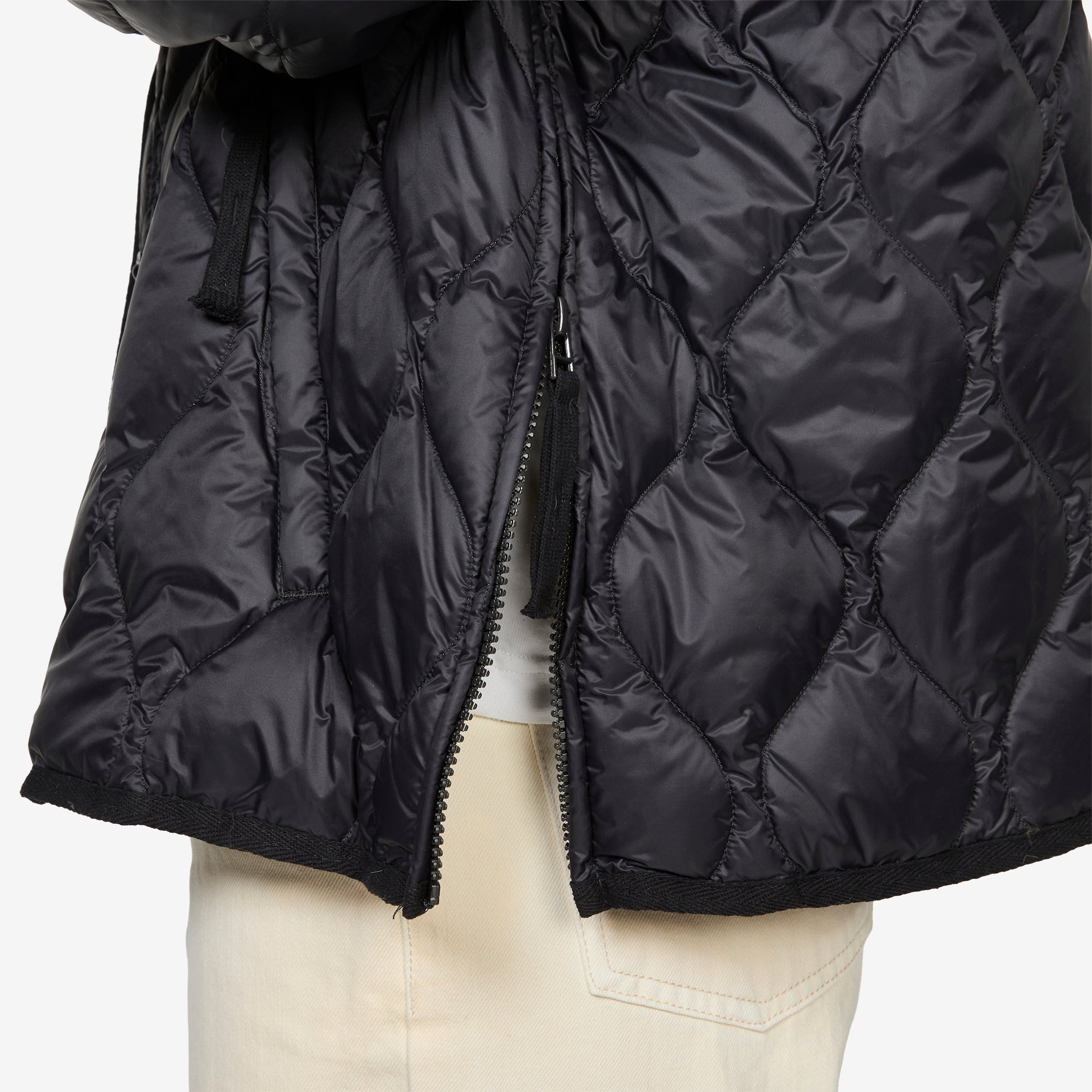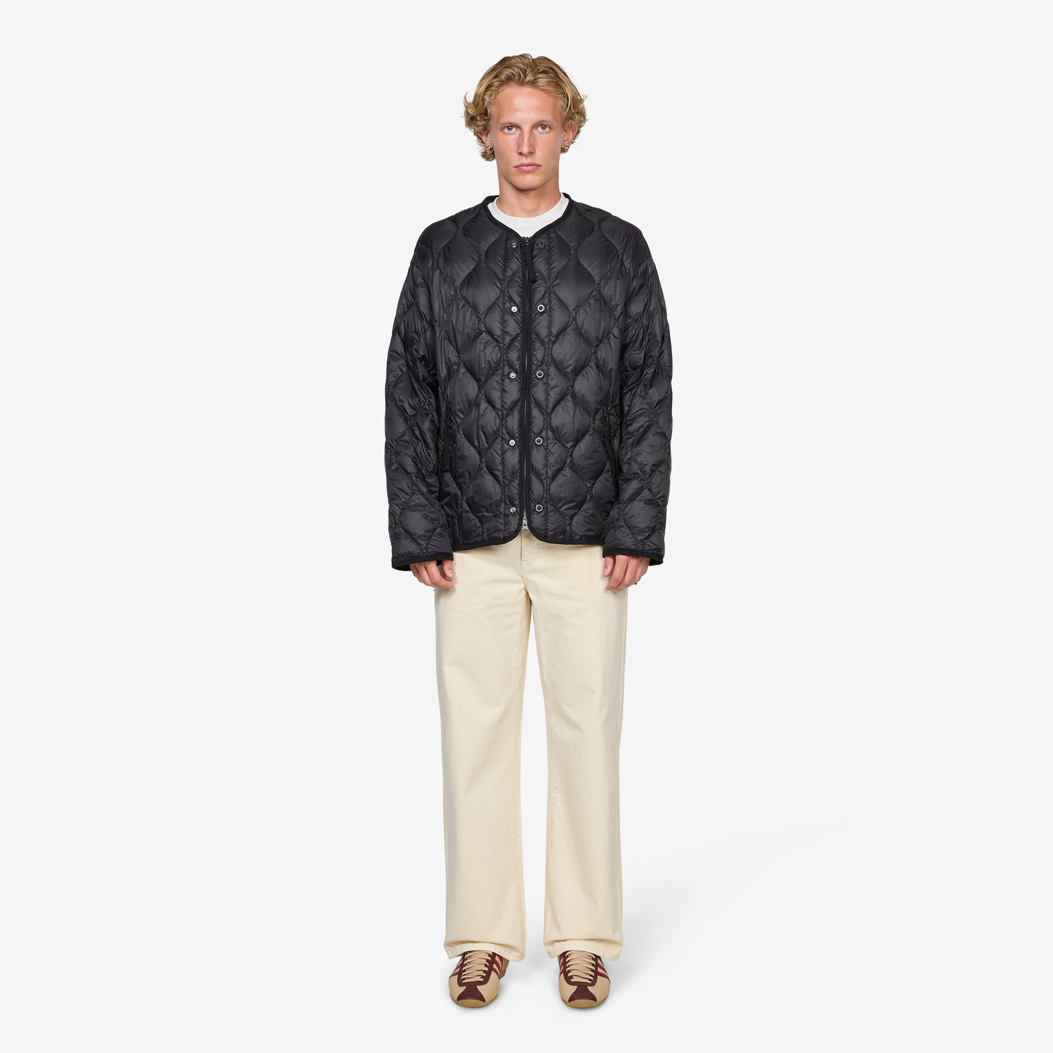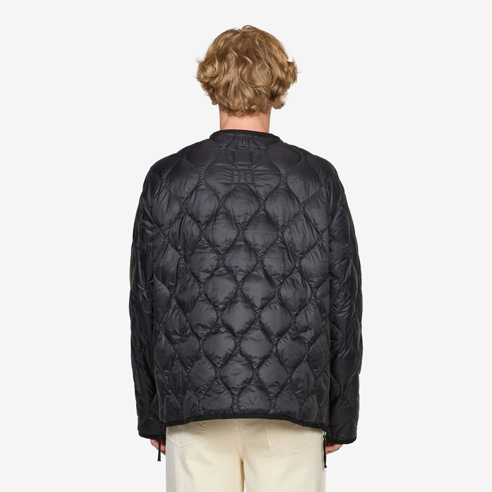 Military W-Zip M65 Liner Short Soft Shell Down Jacket in Black from Taion. Regular fit, packable longsleeve military style liner with a deep crewneck, full zip closure, side-entry zip pockets, snap button patch pockets and additional snap buttons at the placket for an optional slimmer fit. Crafted from a lightweight nylon fabric and filled with 800 FP down for excellent heat retention. Finished with side slit zippers for mobility and layering capabilities.