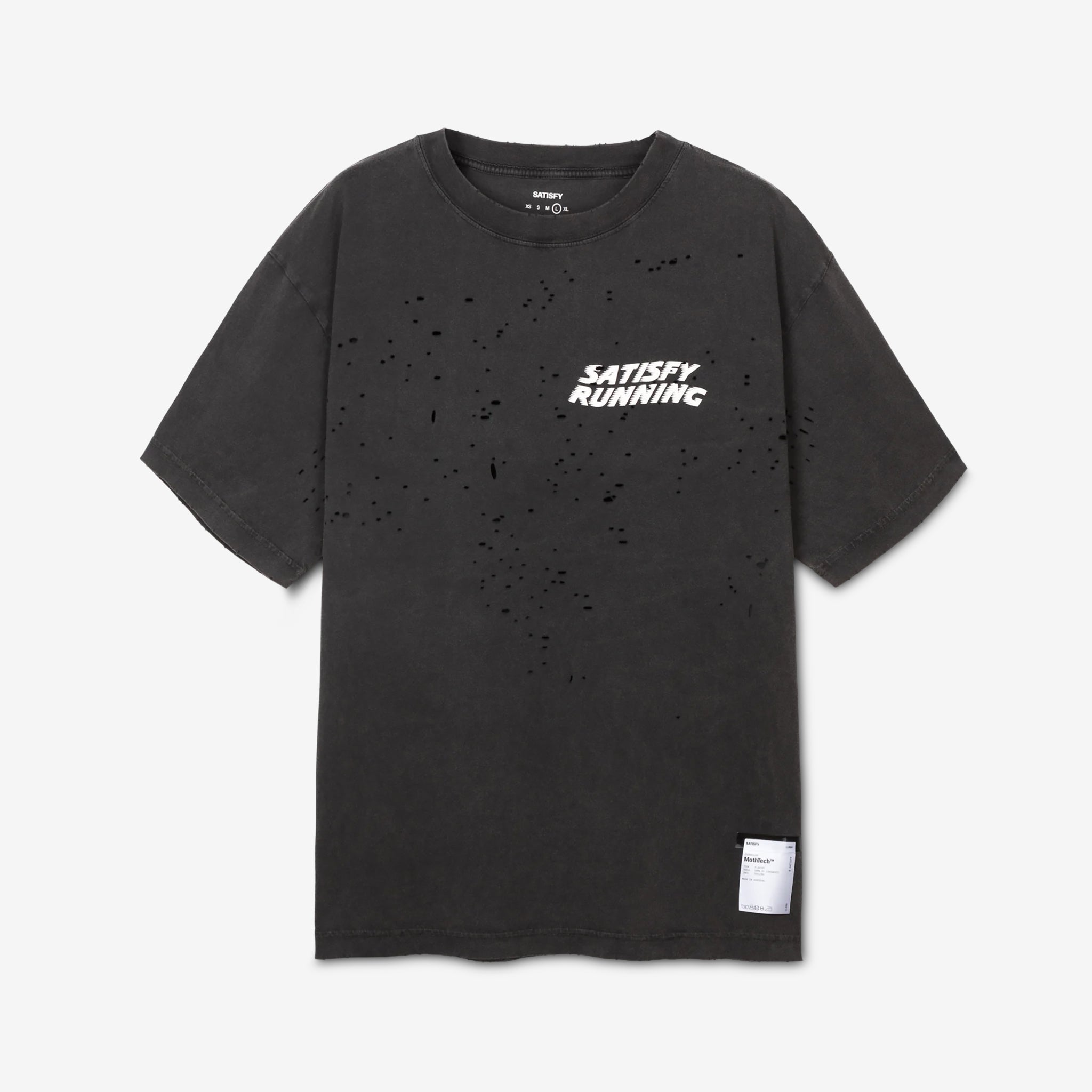 MothTech™ Logo T-Shirt in Aged Black from Satisfy. MothTech™ features strategically placed holes, body-mapped to provide a unique ventilation system. Regular fit t-shirt with a ribbed crew neckline, crafted from combed organic cotton jersey. Finished with printed branding at the chest and a detachable exterior care label so nothing rubs against your skin.