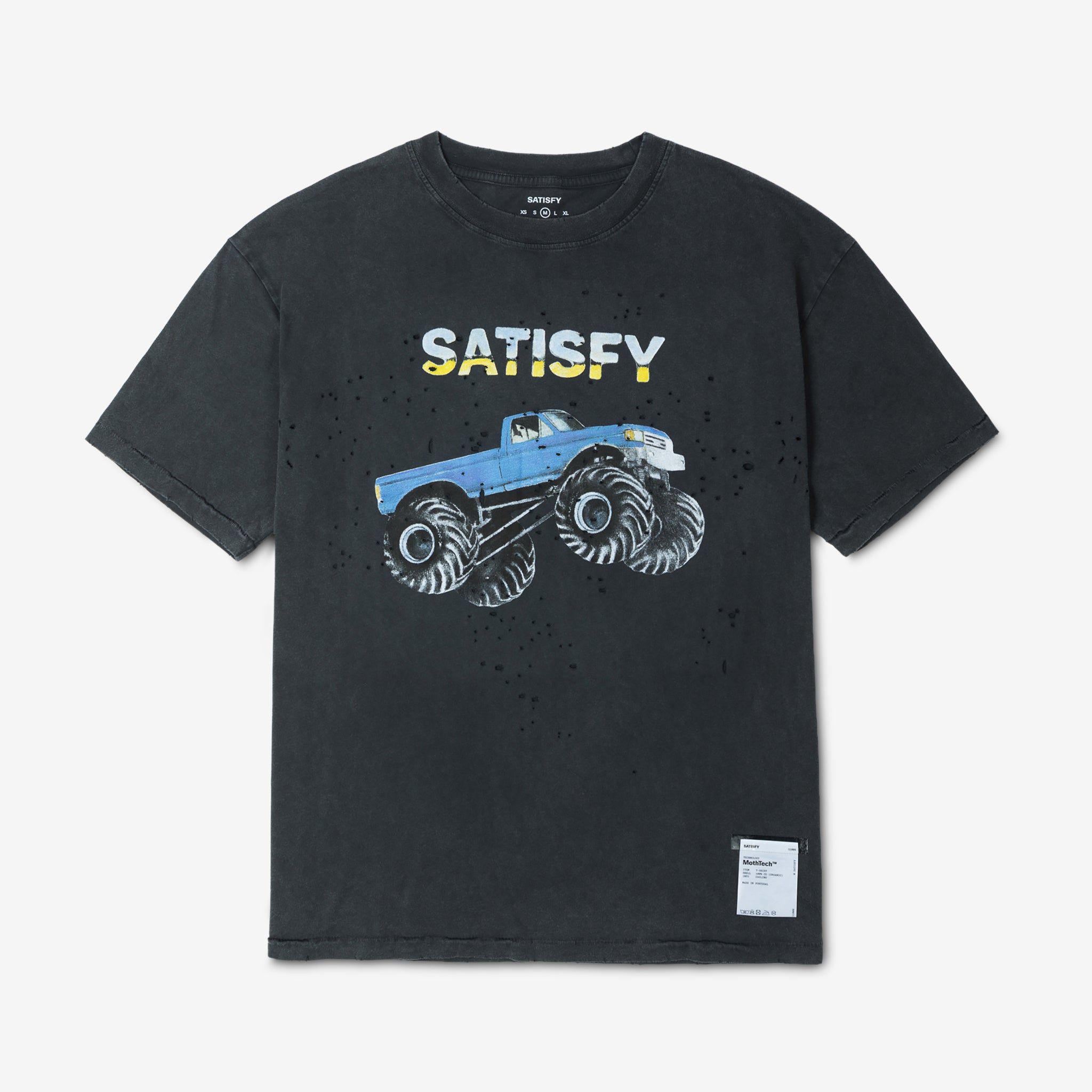 MothTech™ Monster Truck T-Shirt in Aged Black from Satisfy. MothTech™ features strategically placed holes, body-mapped to provide a unique ventilation system. Regular fit t-shirt with a ribbed crew neckline, crafted from combed organic cotton jersey. Finished with printed graphics at the chest and back and a detachable exterior care label so nothing rubs against your skin.