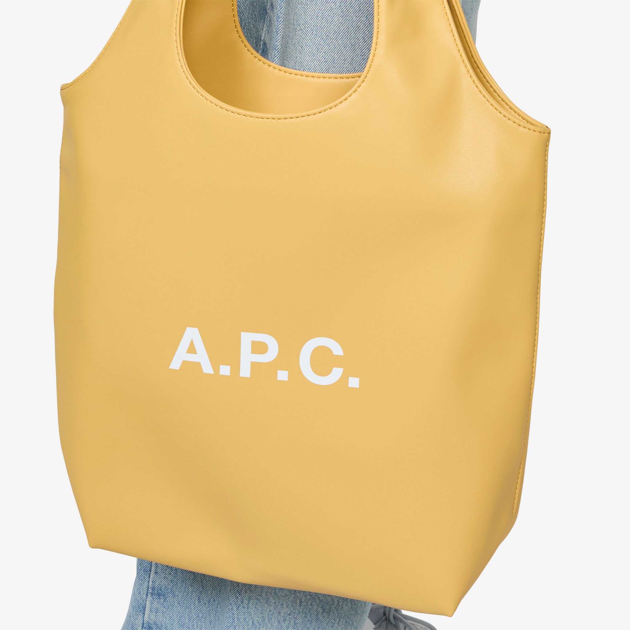 Ninon Tote Small in Beige from A.P.C. Unisex tote bag with an interior pocket and two carry handles for hand or shoulder carry. Crafted from a recycled faux leather and finished with printed branding on the front.