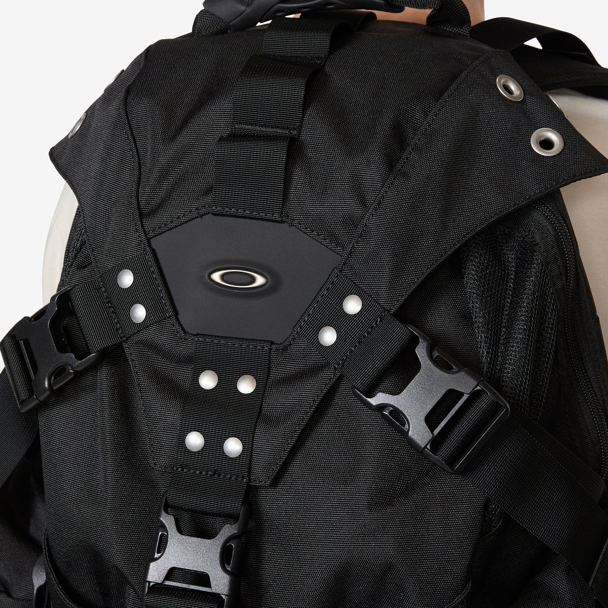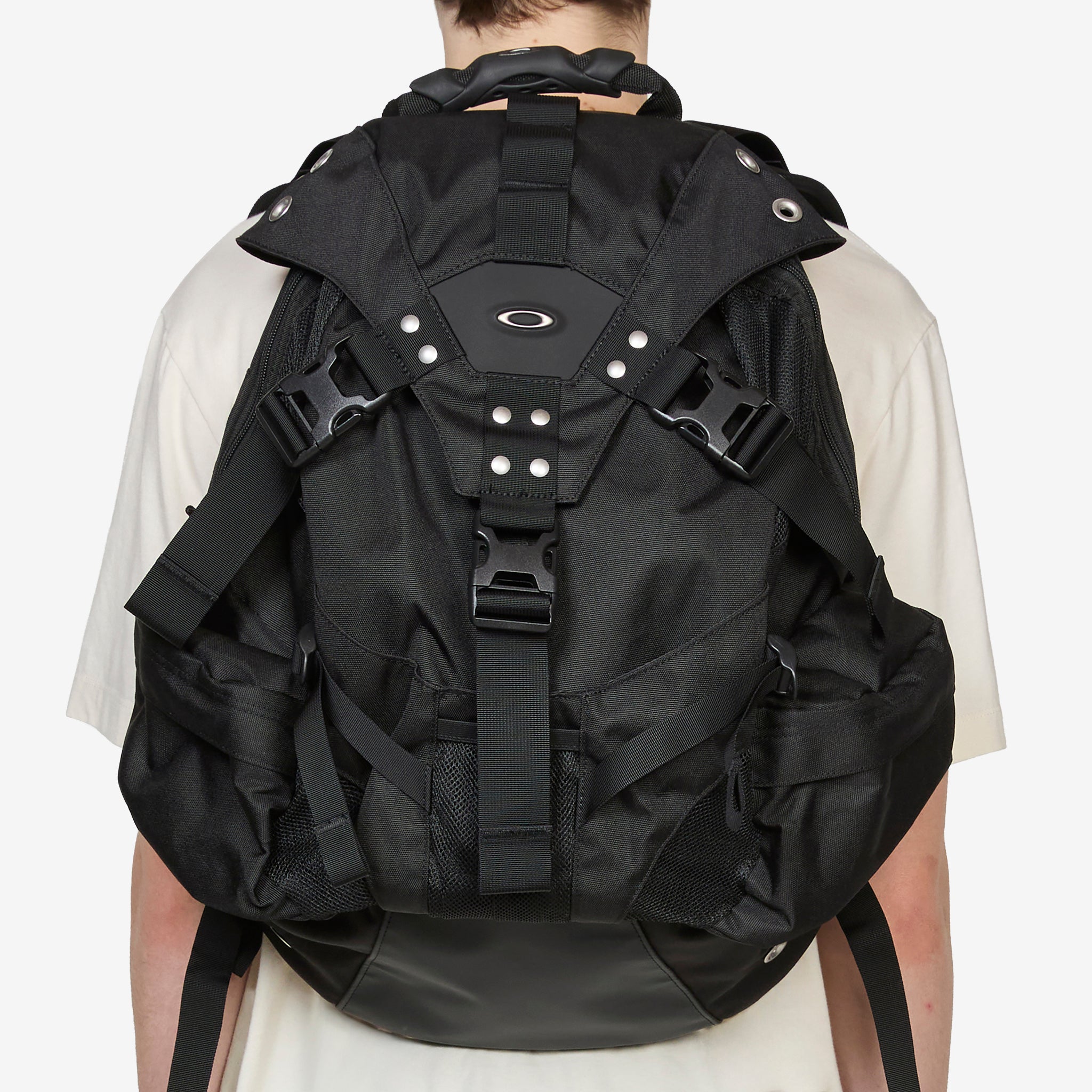Oakley Icon RC Backpack in Blackout from Oakley. A re-issue of a durable fan-favourite, this backpack features a roomy zip-closure main compartment with a protective lid secured in place by triple-buckle closure. Built with a multitude of specialised pockets, including an interior compression-moulded organiser panel at the front and open and zip-closure exterior pockets. Crafted from a water-repellant lightweight recycled polyester with a compression-moulded back and adjustable brushed shoulder straps. Finished with an easy access hard media–player compartment within the protective lid.