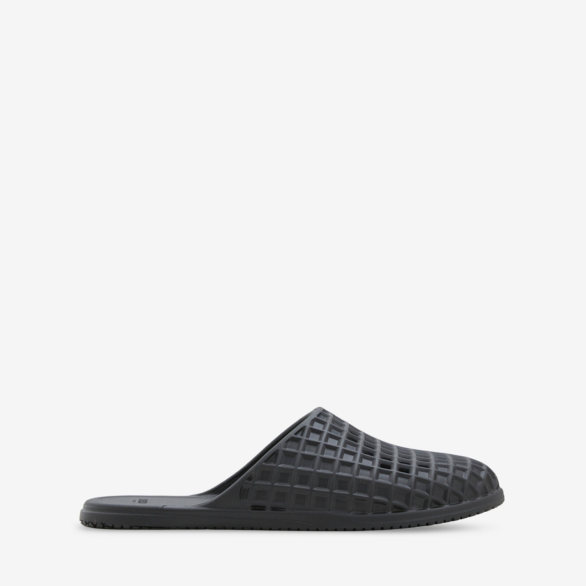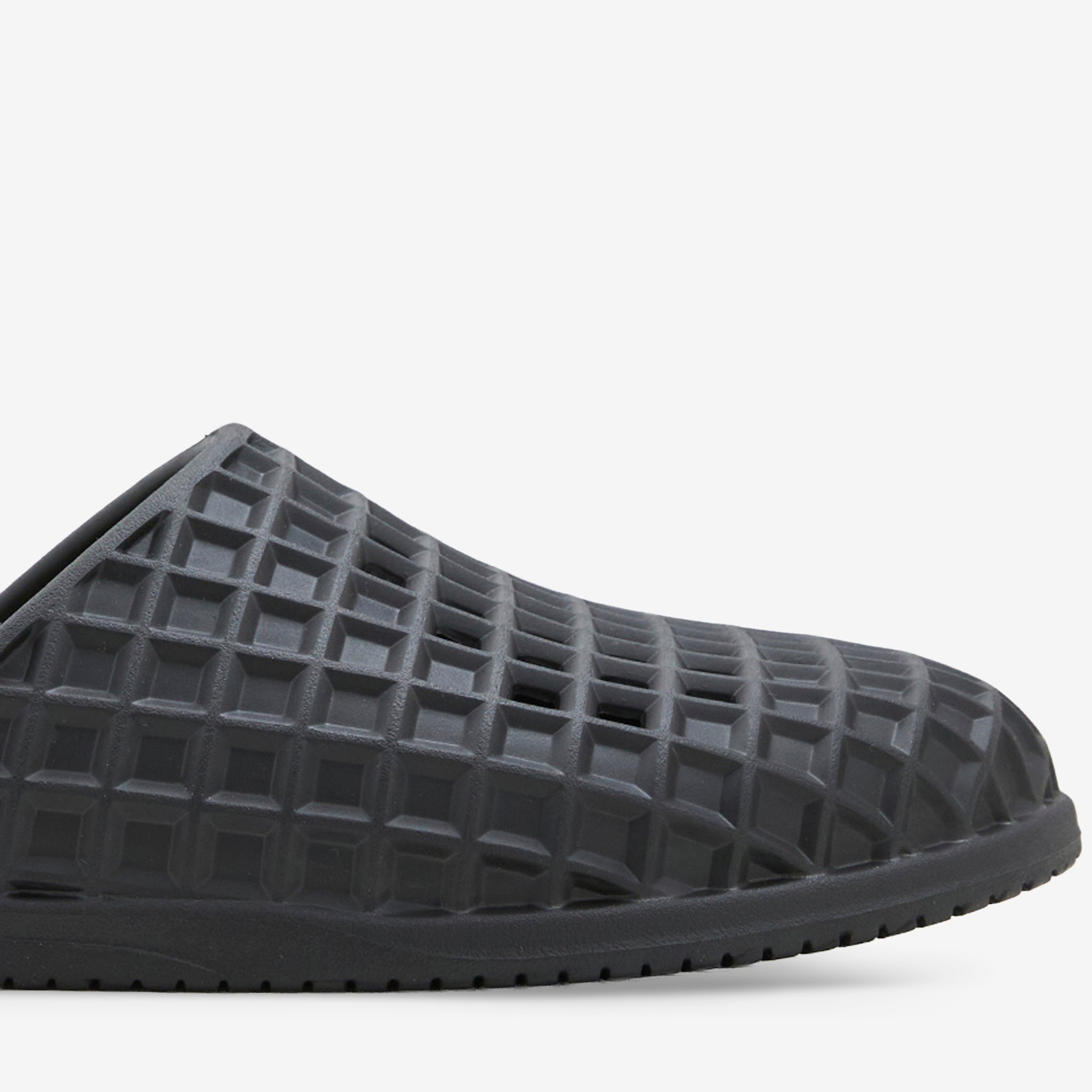 Unisex Rosa Slide in Jet Black from Lusso Cloud. Low profile silhouette with built-in arch support and patented square perforation for maximum airflow. Crafted from EVA with water friendly construction and internal texturing to reduce hot spots. Finished with embossed branding at the footbed.