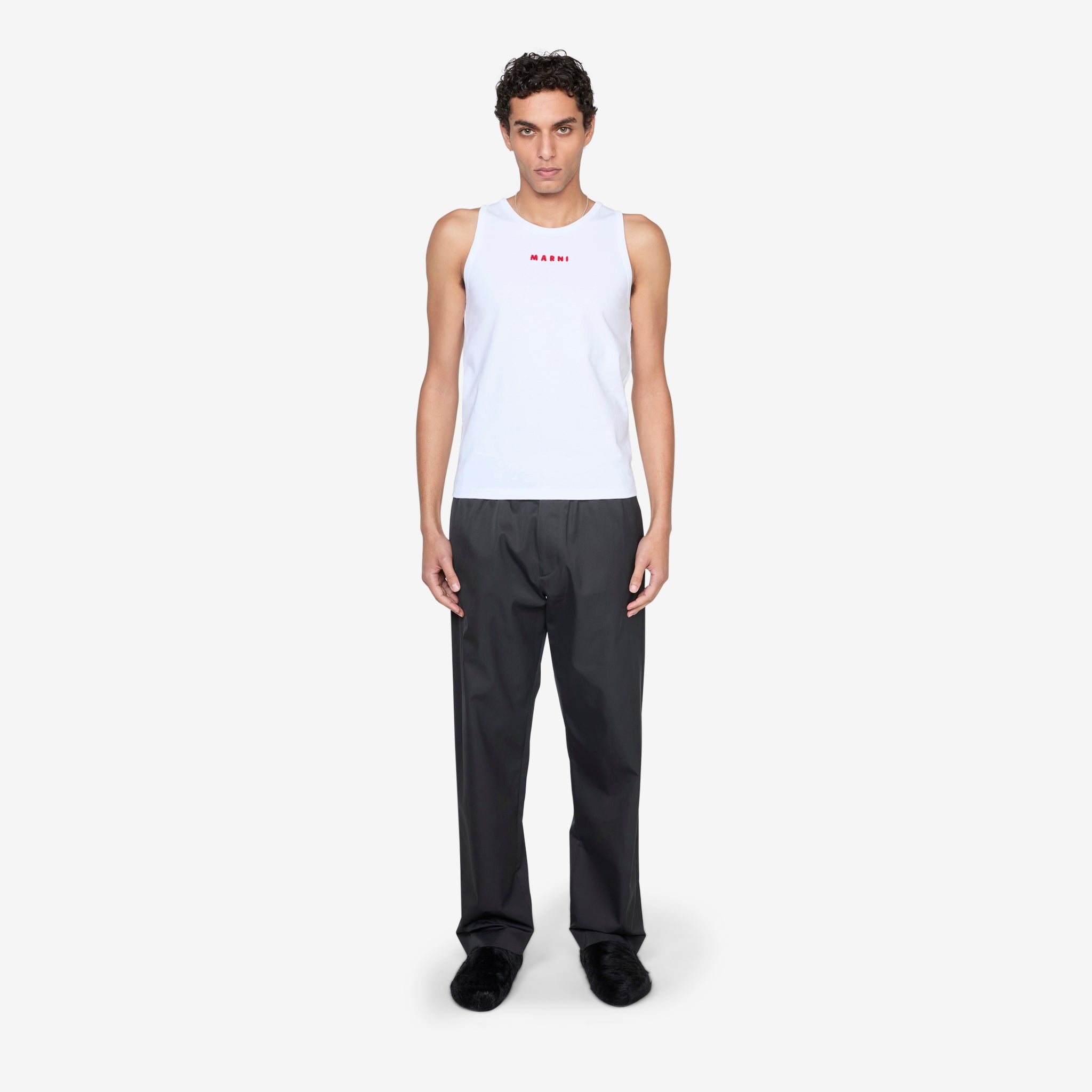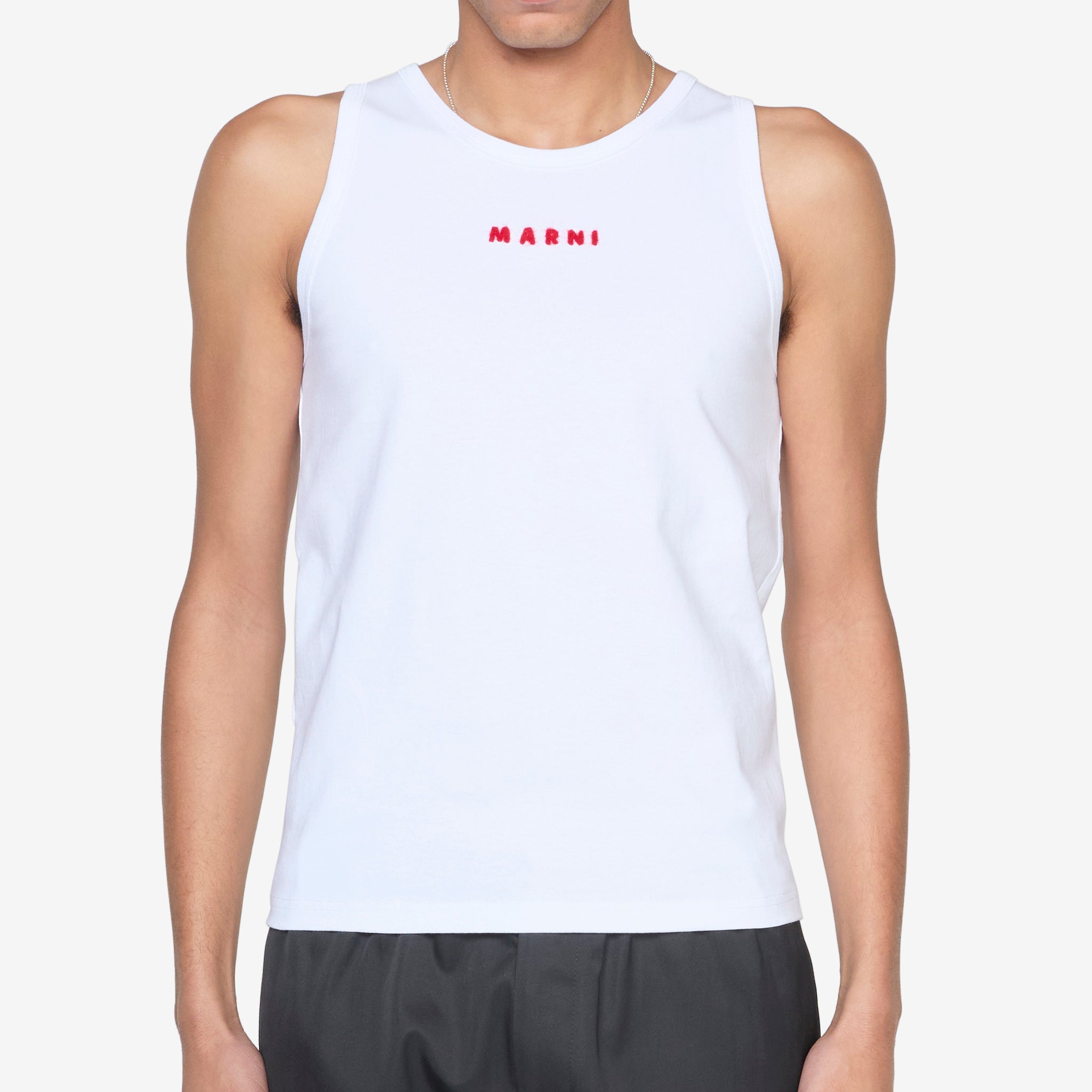 Mohair Embroidered Tank in Lily White from Marni. Cut in a relaxed fit with dropped armholes and a ribbed hem, the tank features tonal embroidered accents across the chest. Crafted in Italy from a mohair-wool blend, the piece carries a delicate semi-sheer texture with subtle hand-feel variation throughout.