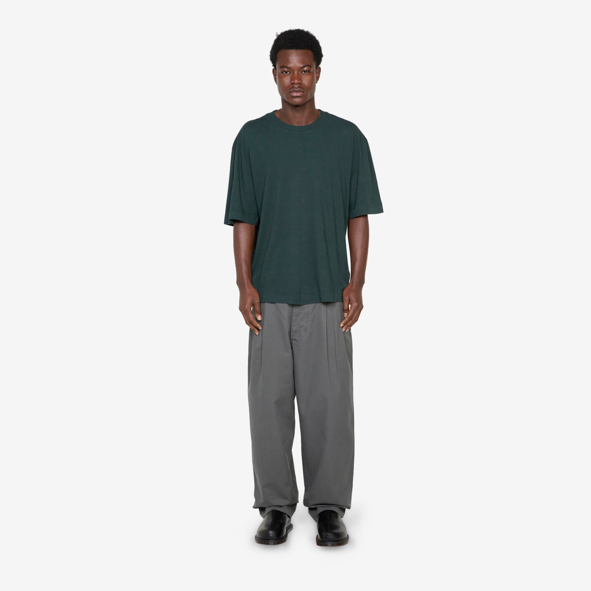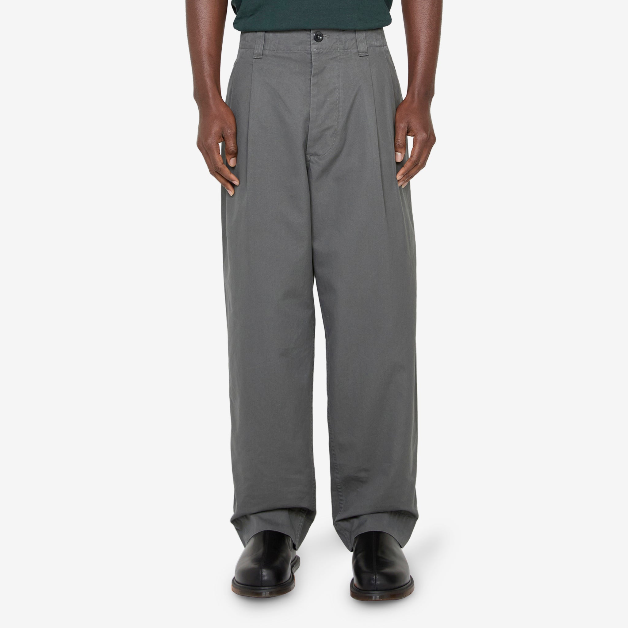 Stitch Pleat Trousers in Charcoal from MHL. by Margaret Howell. Relaxed cut trouser in dense cotton canvas. Double front pleats. Stitch-through waistband with button fastening. Stitch-through back pocket with concealed zip.