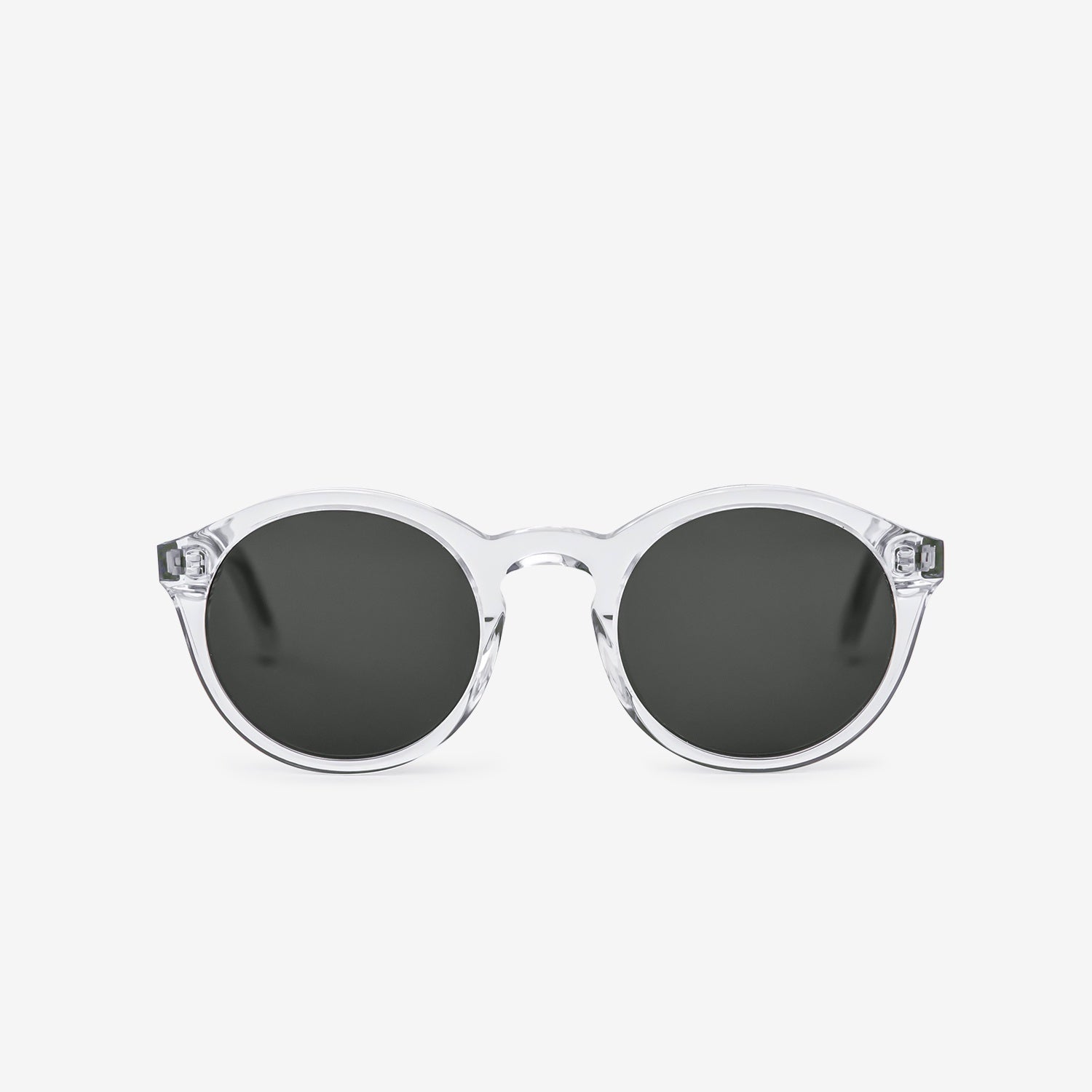 Barstow in Crystal Frame and Grey Solid Lens from Monokel Eyewear. Handcrafted sunglasses with organic and biodegradable acetate frames and 100% UV protective Carl Zeiss Vision CR39 lenses. Constructed with 5-Barrel OBE Stainless steel hinges, teflon covered hinge screws and a keyhole nose bridge.