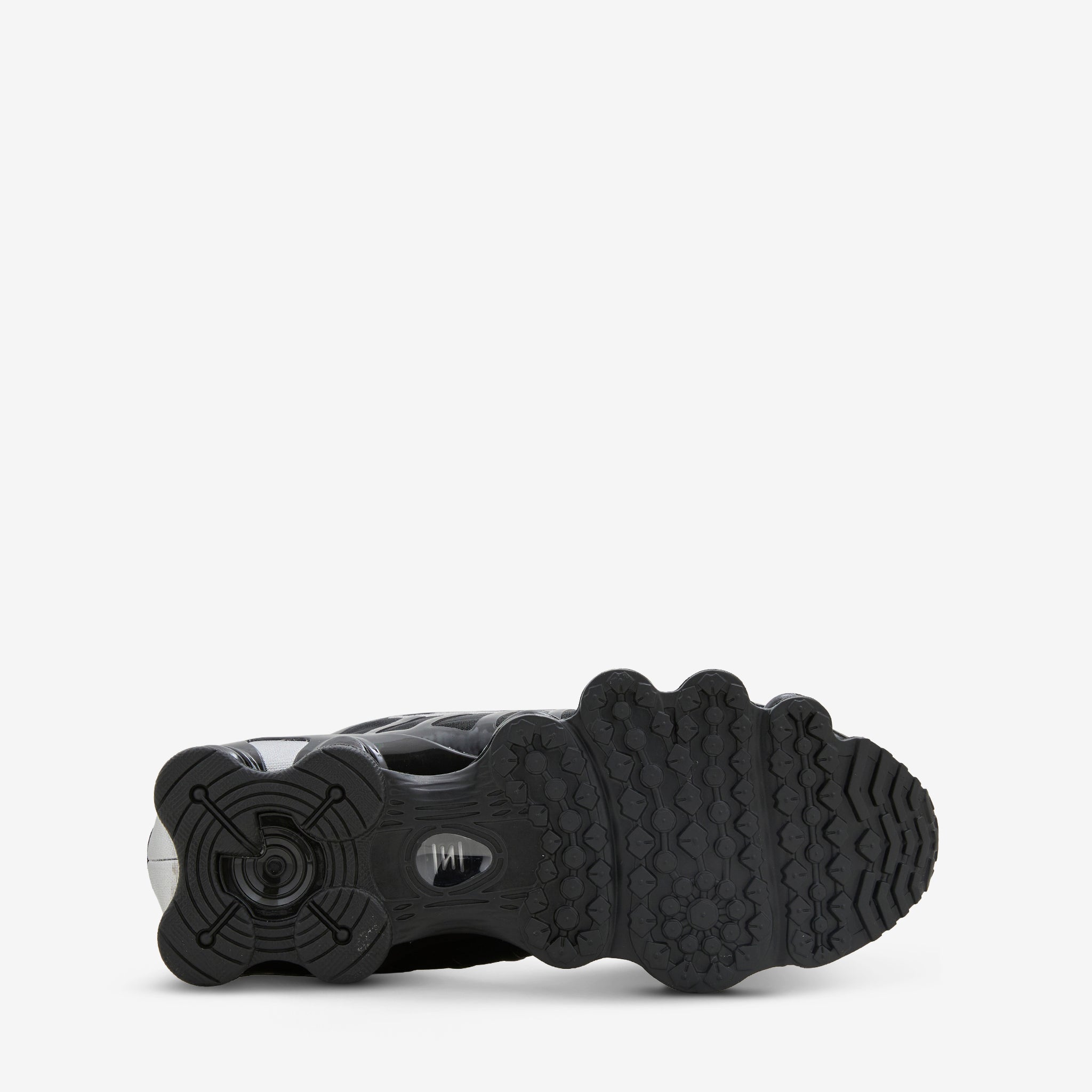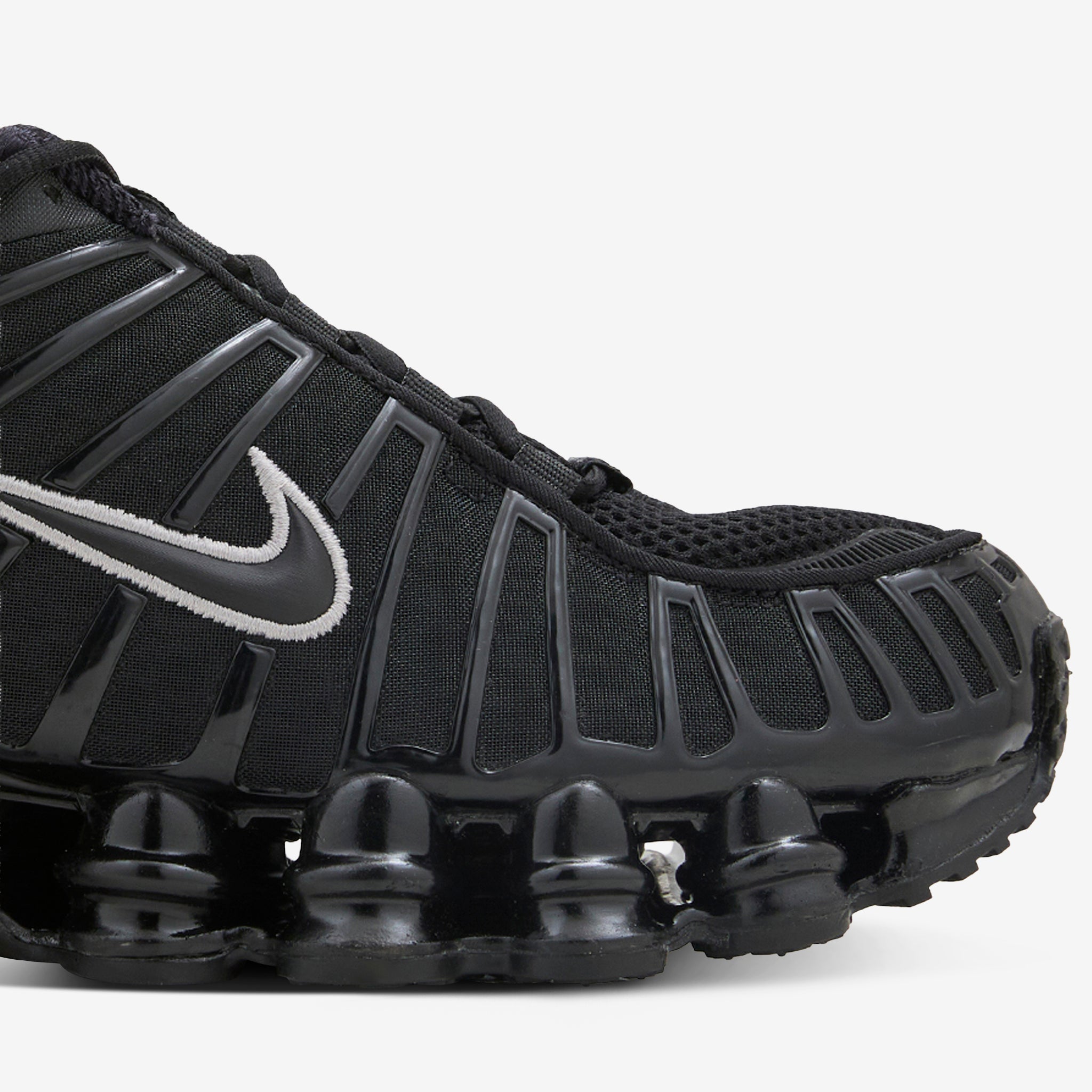 Women's Shox TL in Black and Metallic Silver from Nike. A reworked version of the 2003 Shox TL featuring a breathable mesh upper with moulded TPU cage overlays throughout the midfoot for support. Full-length Nike Shox technology uses flexible columns and moderator plates for cushioning. Finished with a modified rubber Waffle outsole for traction and TPU heel plate for lateral stability and support.