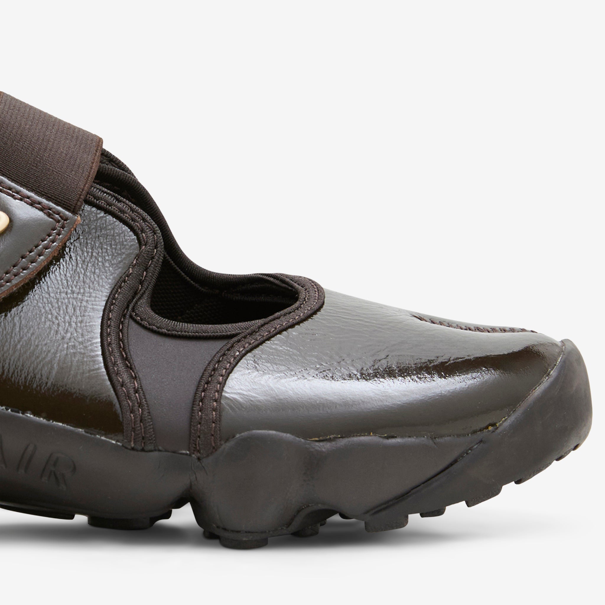 Women's Nike Air Rift in Velvet Brown and Metallic Gold from Nike. Barefoot-style shoe based on the '96 original featuring a shiny leather and textile upper, hook-and-loop straps at the midfoot and heel and a split-toe design for ultimate comfort. Plush foam midsole with a Nike Air unit heel provides a cushioned wear whilst the rubber detailed outsole offers rugged tread for added traction.