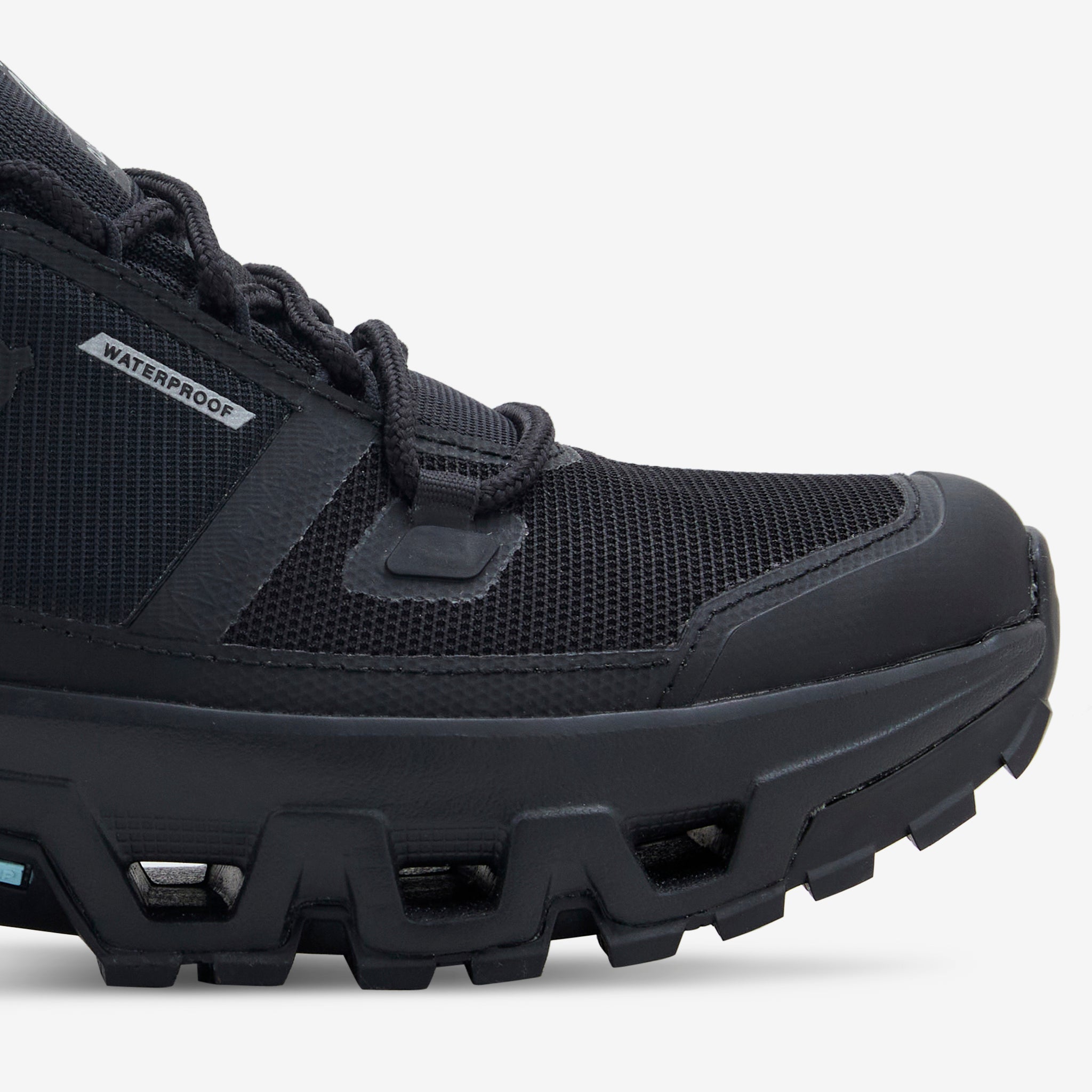Men's Cloudrock Low Waterproof in Black from On. Waterproof all-terain upper featuring a protective toe cap and TPU mudguard. Helion™ superfoam midsole provides cushioning for every step while the X-shaped Speedboard® offers flexibility and stability. Finished with an upgraded Missiongrip™ outsole for reliable grip and traction