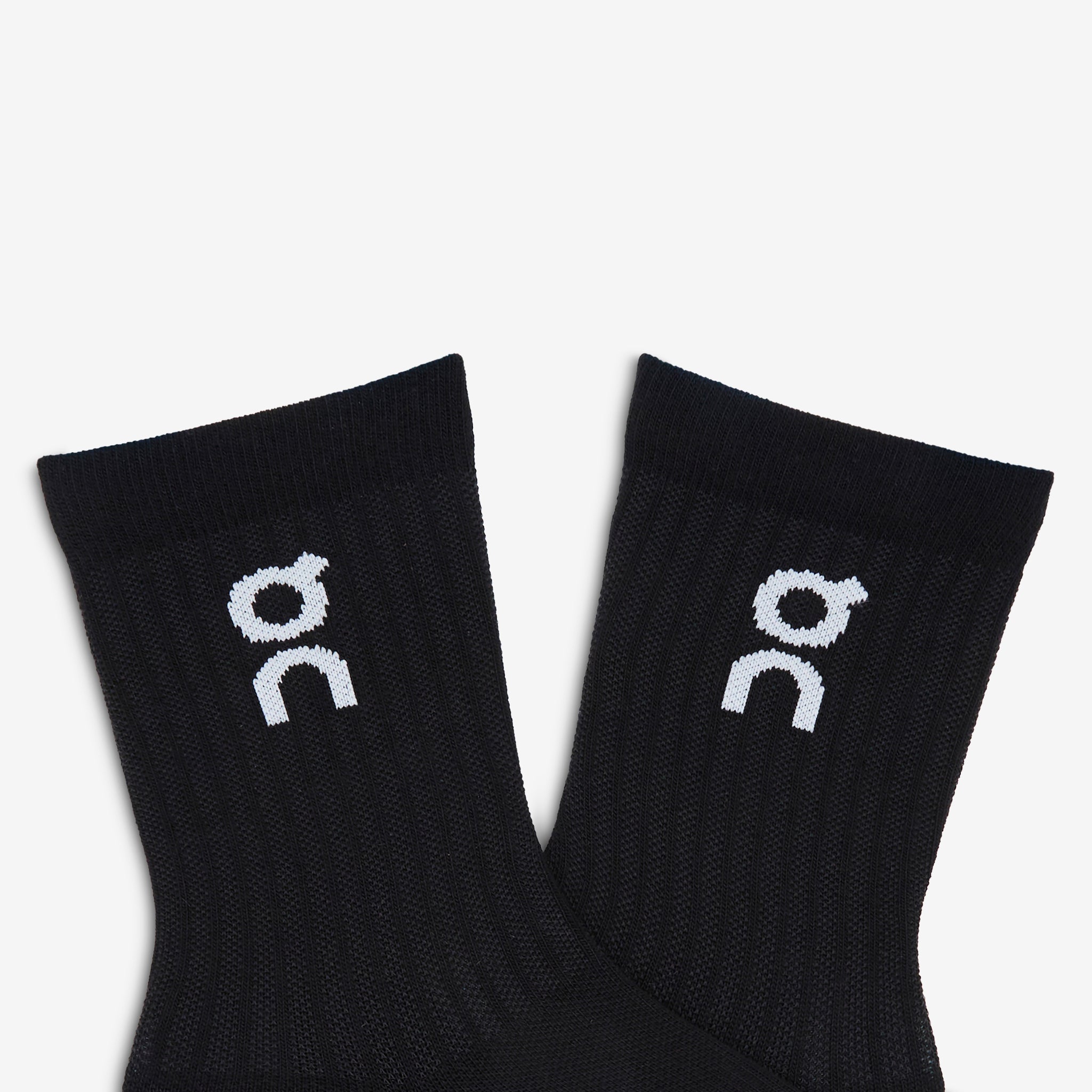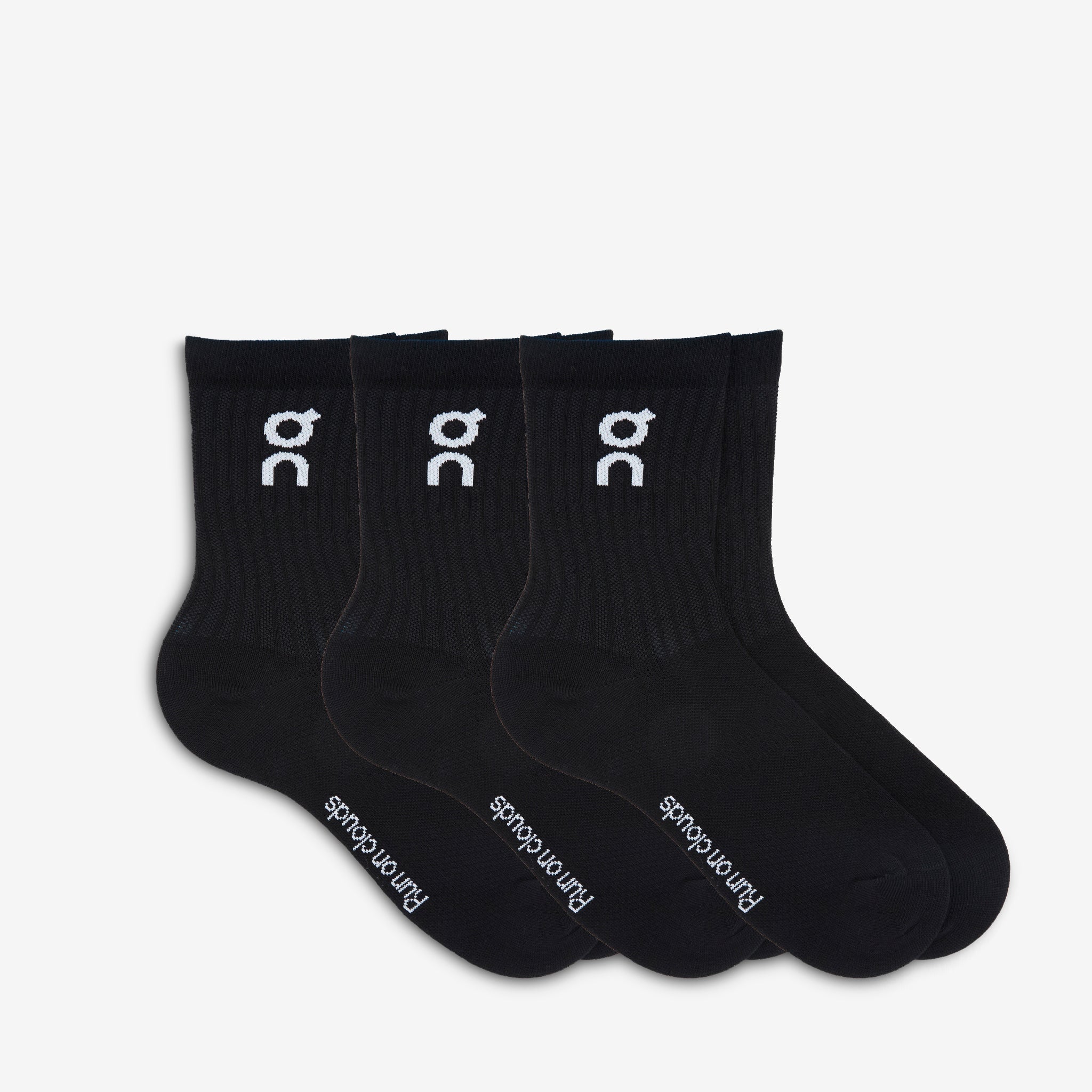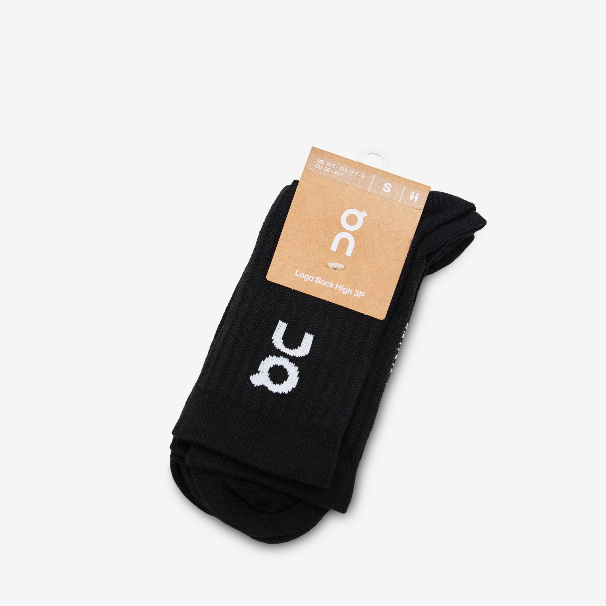 Logo Sock High 3-Pack in Black from On. Crew-length socks with arch support and ribbed structure at the cuff. Crafted from a blend of organic cotton and partially recycled materials for soft construction and medium ventilation. Finished with double logo jacquard detailing.