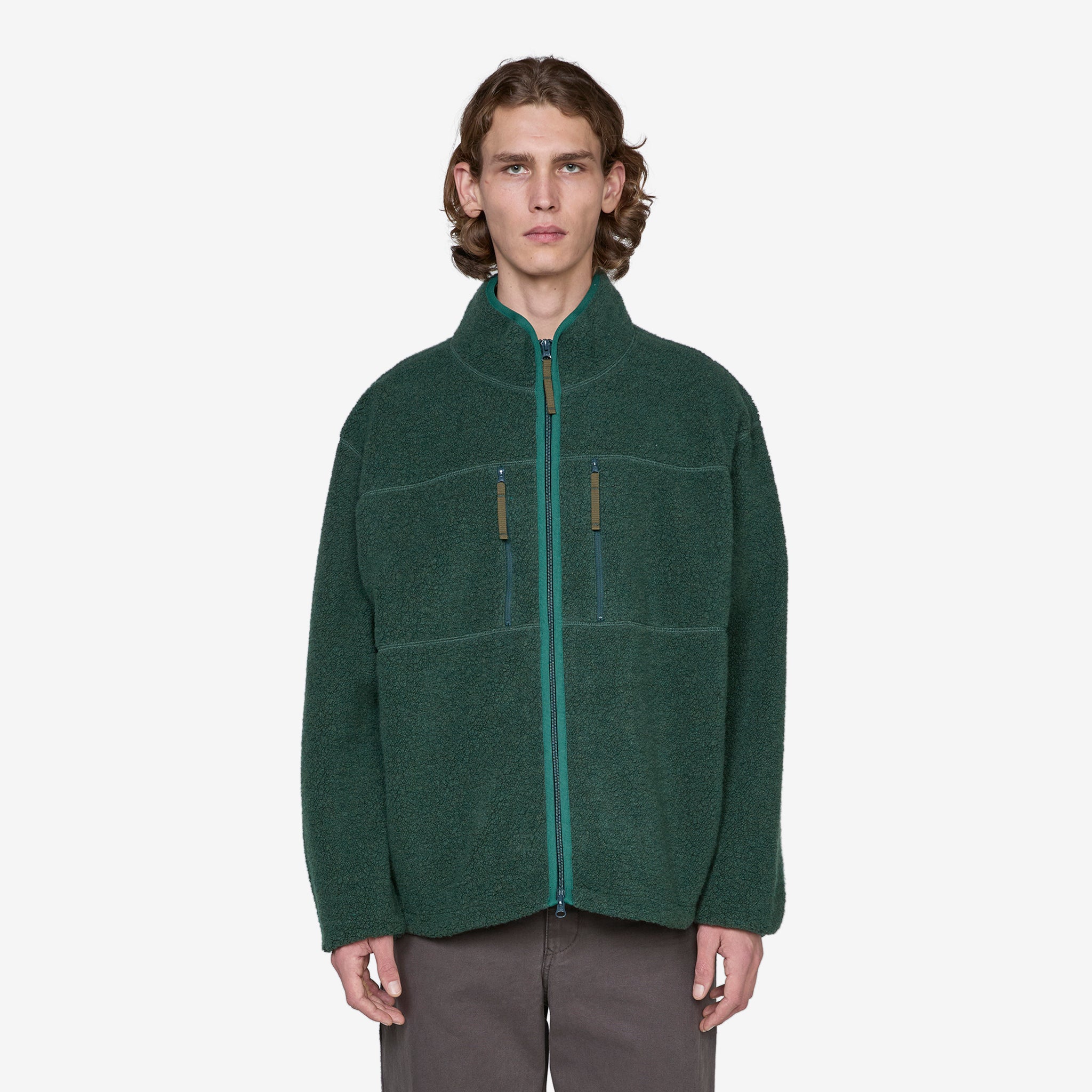 Antonio Wool Zip Up in Green from Pilgrim Surf Supply. Relaxed fit cardigan with a stand collar, full-zip closure, side seam pockets and zip-closure chest pockets. Crafted from a wool-blend fleece with contrast piping details at the cuffs and closures.