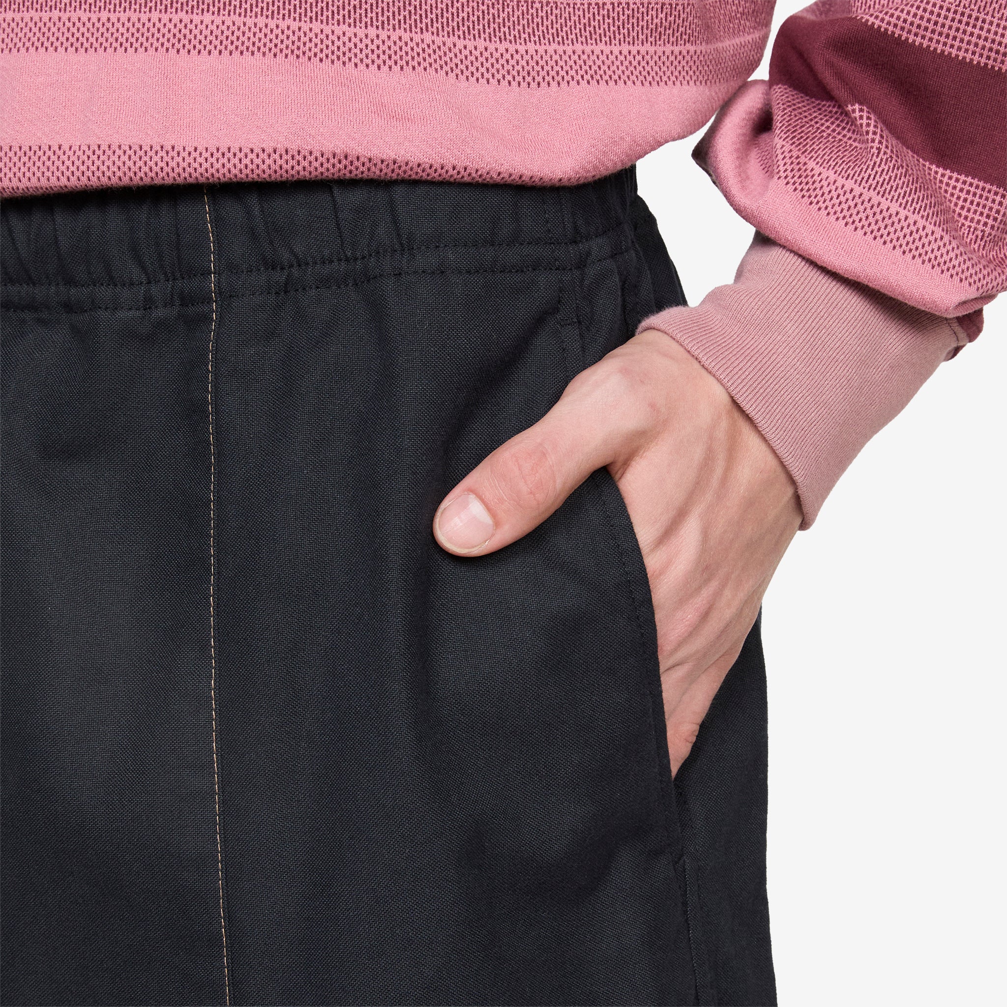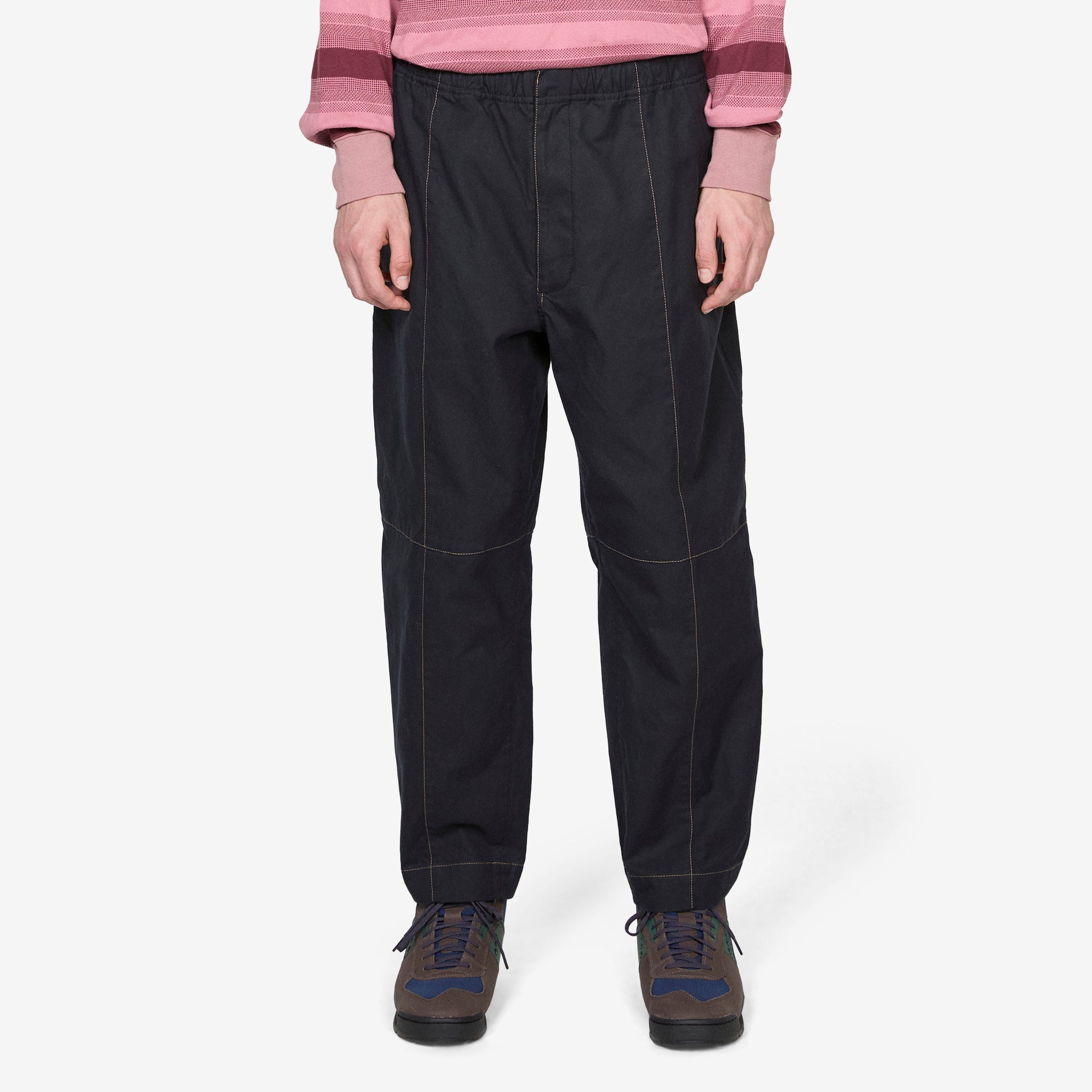 Kim Easy Pant Black from Pilgrim Surf Supply. Relaxed tapered pants cut with contrasting panels and bold stitching. Constructed from durable high-density duck fabric, inspired by German military jackets. Internal drawcord at the waistband allows for adjustable comfort. Fabric softens over time with wear.