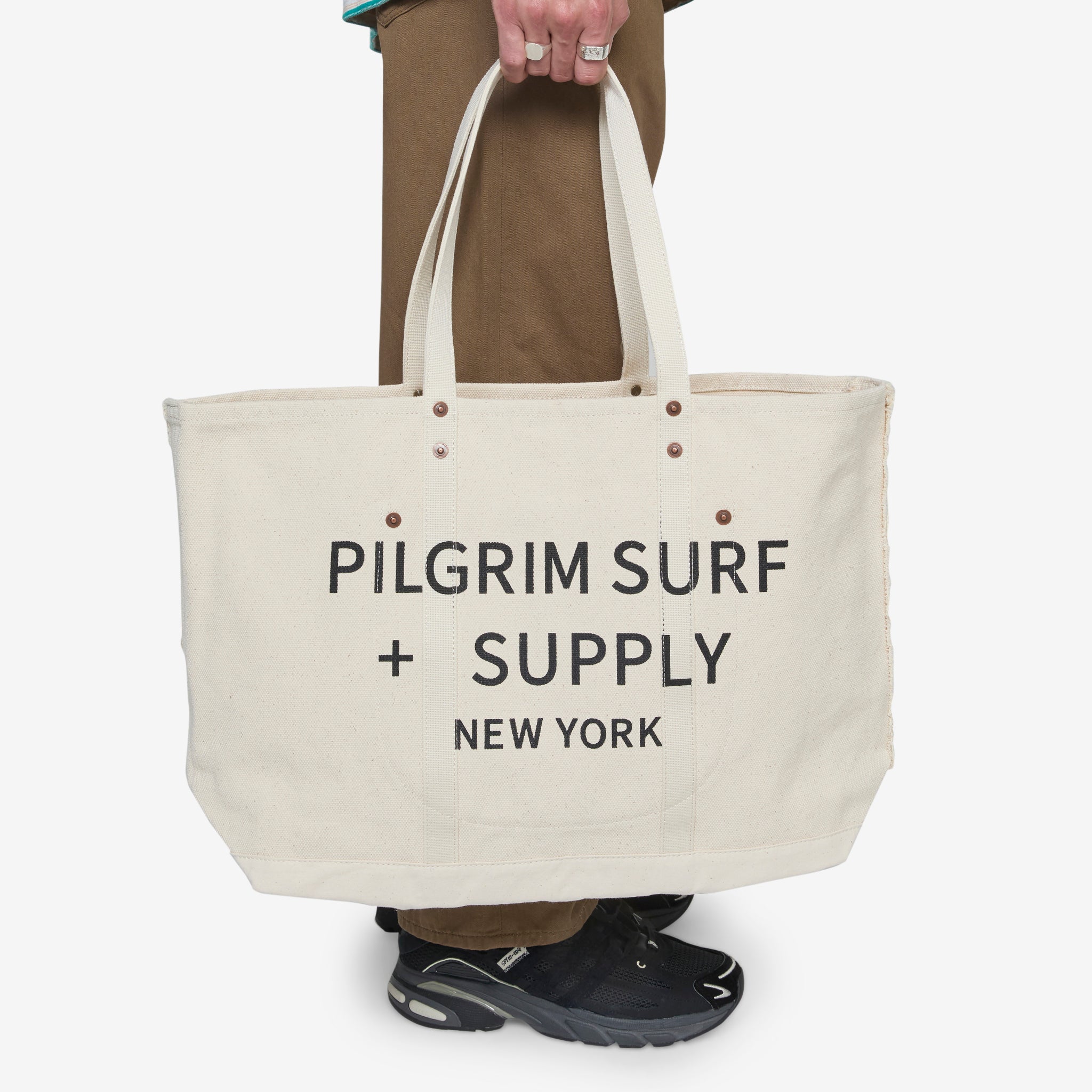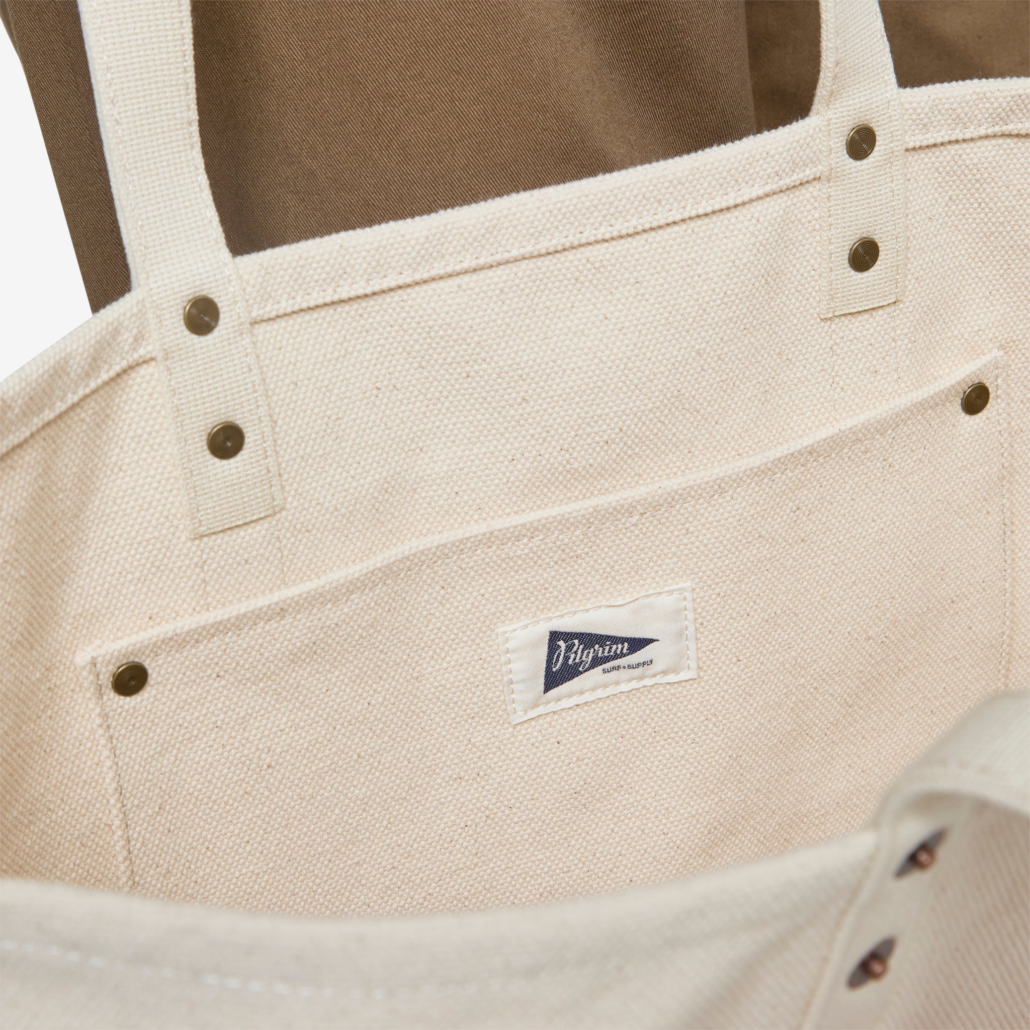 Pilgrim Gear Tote Bag in Natural from Pilgrim Surf Supply. Durable hold-all tote bag with two strap handles and riveted construction for heavy use. Crafted from hardy duck canvas and finished with printed branding at the front.