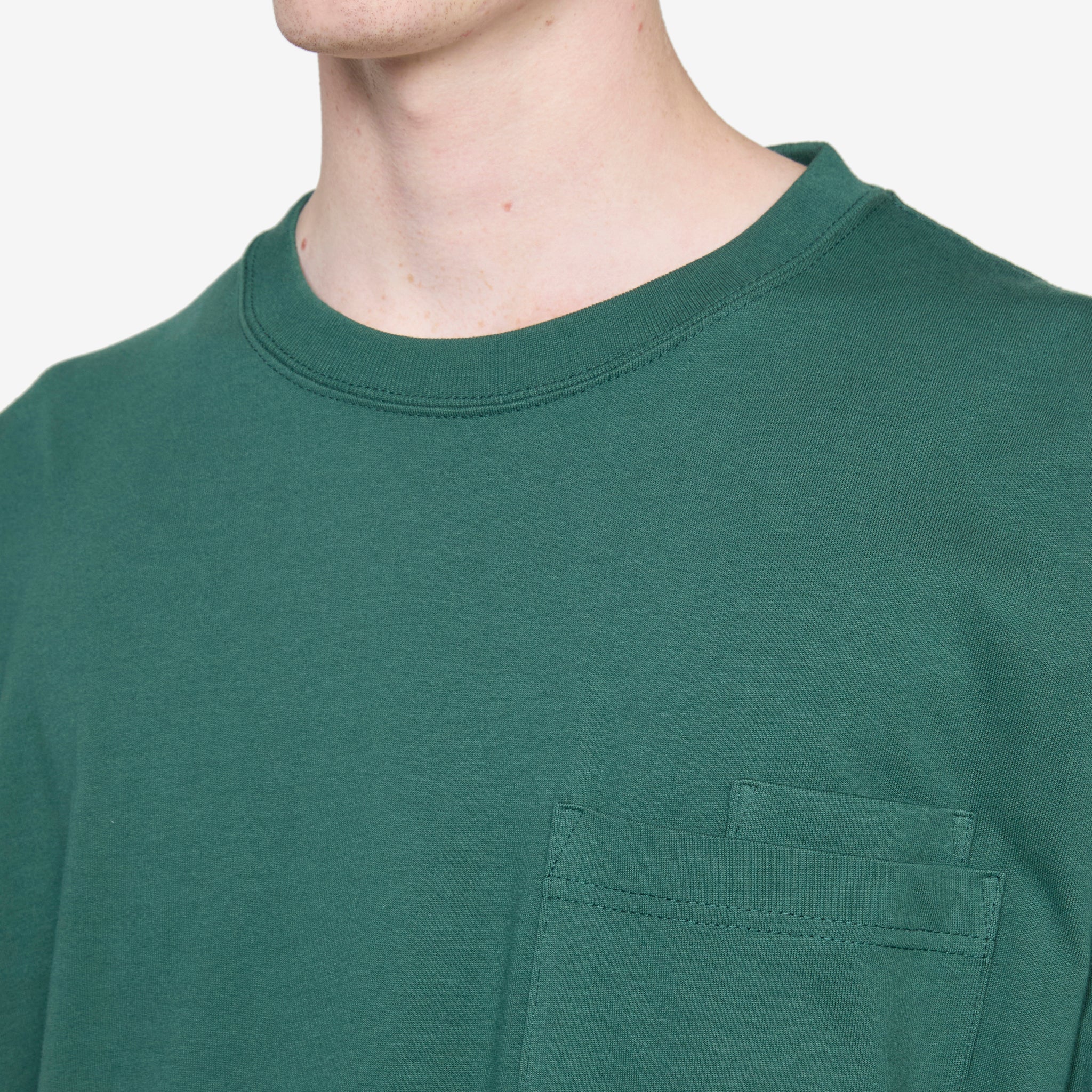 Stanley Utility T-Shirt in Green from Pilgrim Surf Supply. Relaxed fit t-shirt with a ribbed crew neckline and dropped shoulders. Crafted from a dense 30/2 jersey material with combed yarn for durability and shape retention. Finished with a layered chest pocket featuring an interior vertical eyewear pocket.