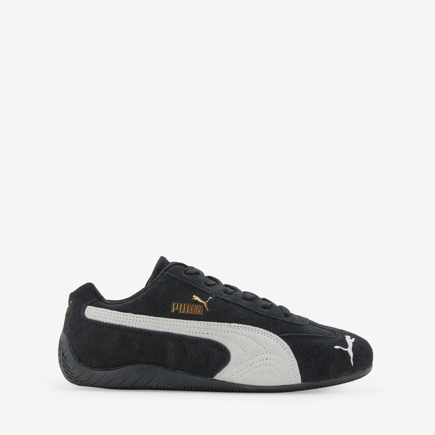 Men's Speedcat OG in PUMA Black and PUMA White from Puma. Inspired by the speed of the race track with a race-shoe inspired silhouette. Features a suede upper with a signature PUMA Formstrip and embroidered branding at the toe. IMEVA midsole provides lightweight cushioning whilst the rubber outsole offers durable traction.