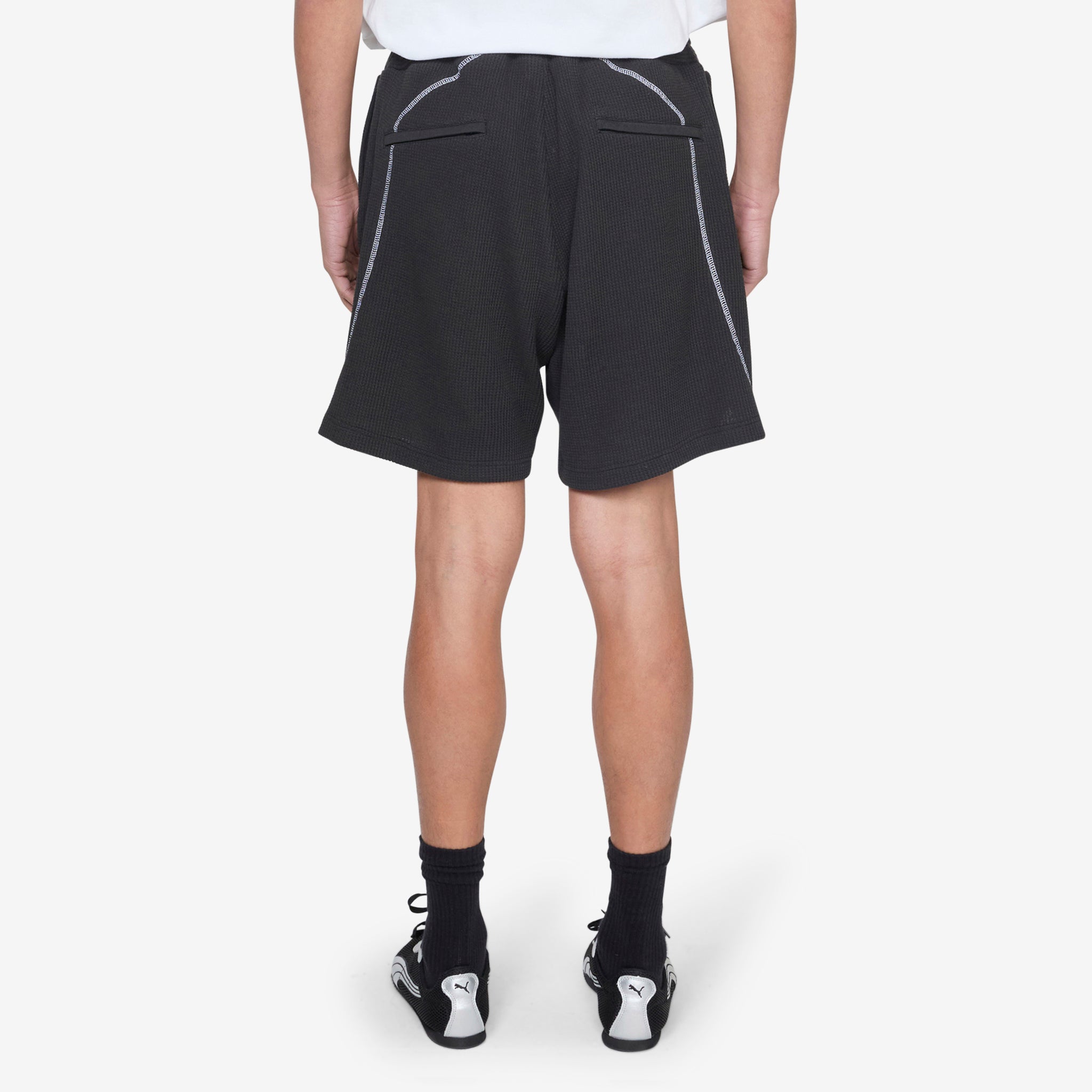Fabien Waffle Shorts in Black from CABARET POVAL. Regular fit shorts with an elasticated drawstring waistband, side pockets and rear welt pockets. Crafted from cosy waffle cotton and finished with contrast stitch detailing at the front and back.