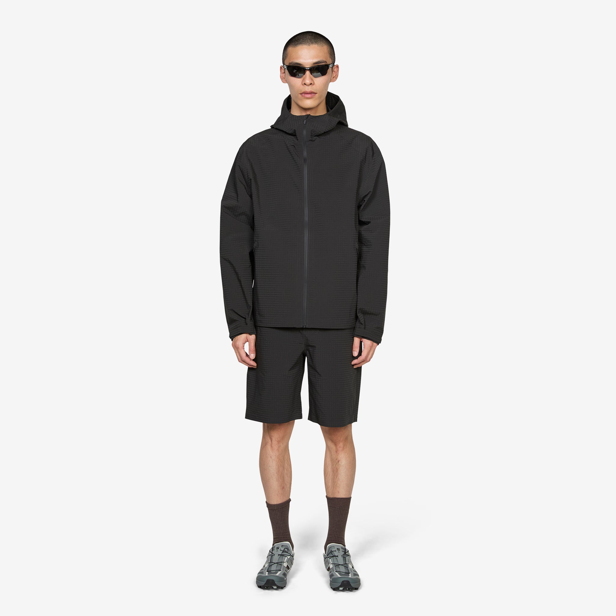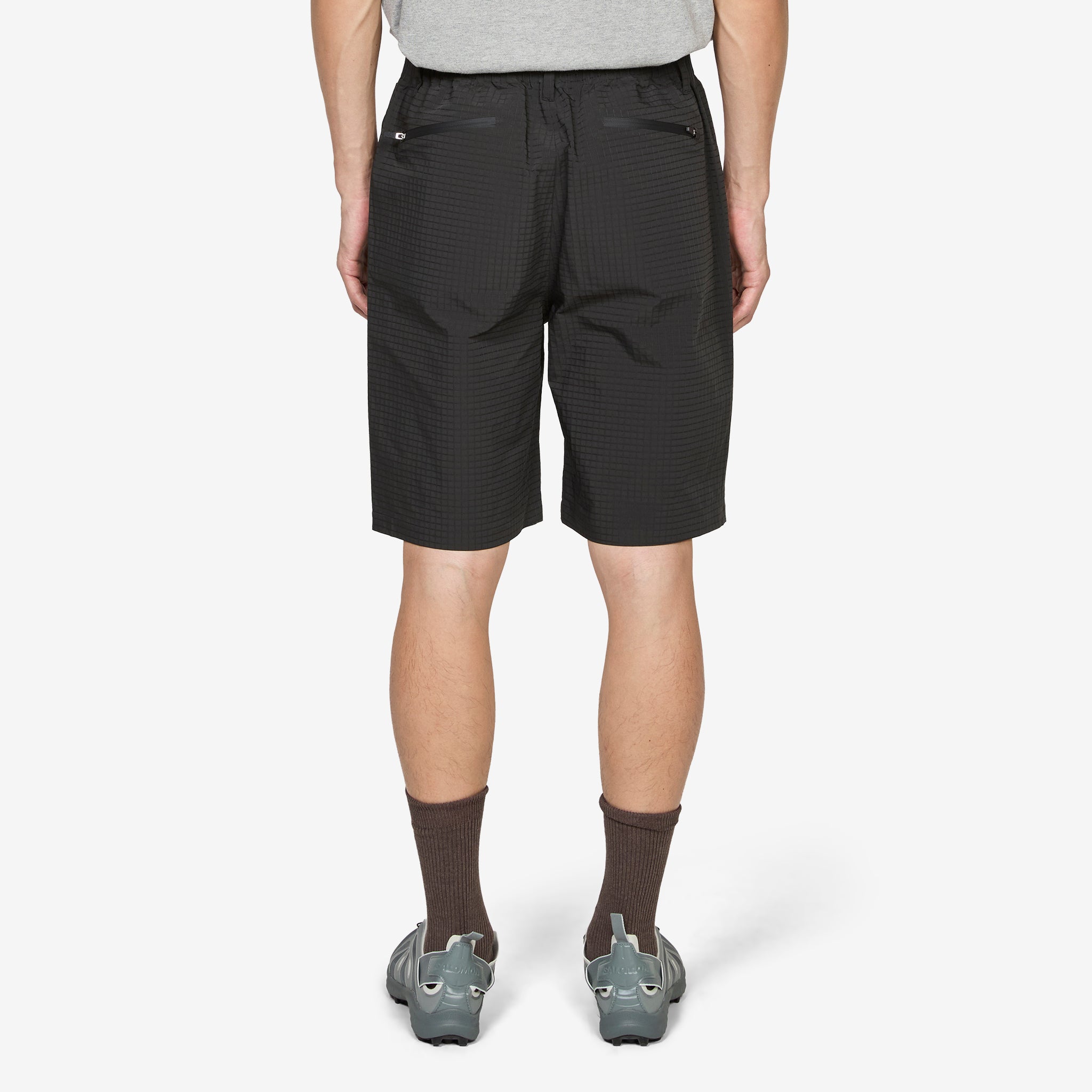 Waypoint Ripstop Shorts in Charcoal Black from Hiking Patrol. Regular fit shorts with a straight-leg silhouette, zip fly with metal snap closure, and elasticated belt loop waistband. Crafted from a lightweight water-resistant jacquard ripstop nylon fabric in an unlined construction. Finished with zip-closure side and rear pockets.