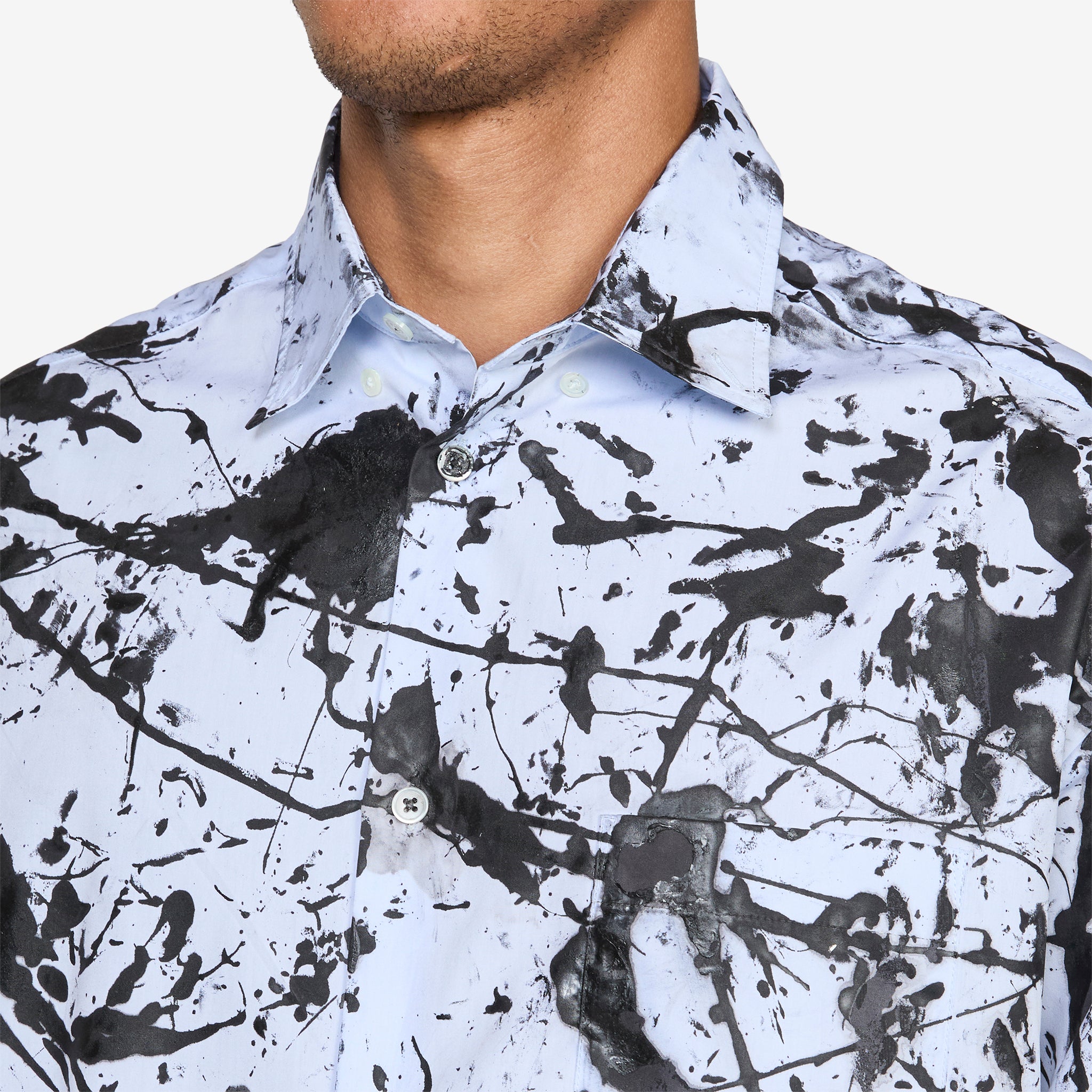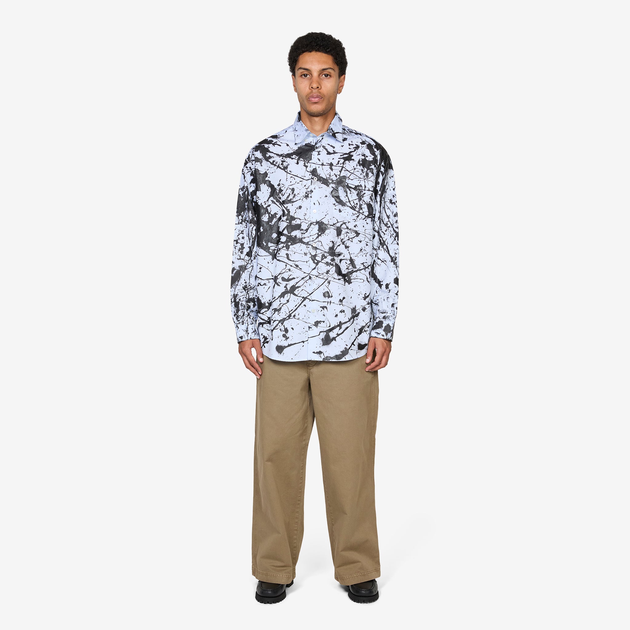 Button Down Shirt in Hand-Painted from Sky High Farm Workwear. Oversized fit shirt with a classic collar, full button closure, curved hem and flap-closure chest pocket. Crafted from organic cotton and ECO-DYE treated to reduce water and carbon usage by up to 30%. Finished with hand painted details all-over.