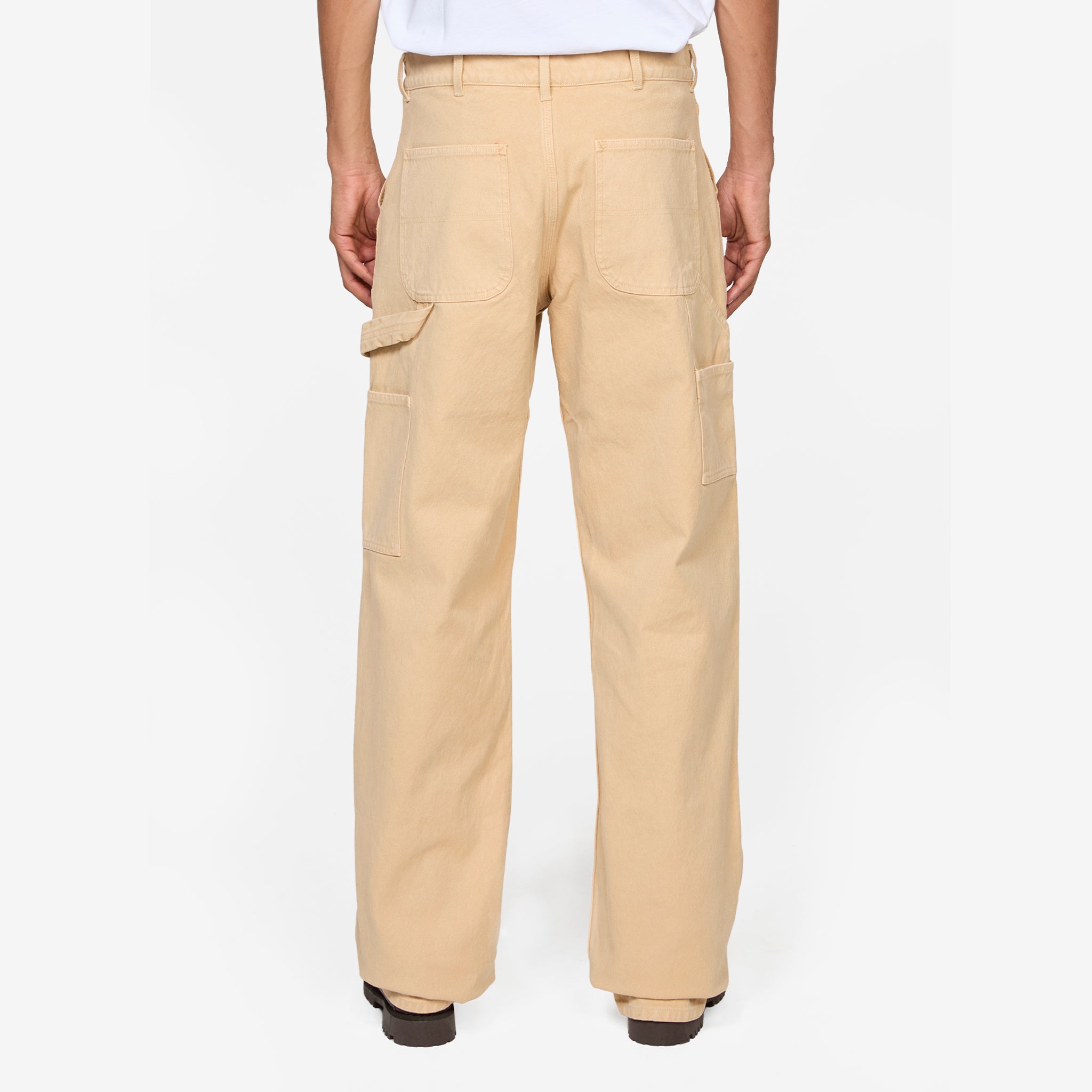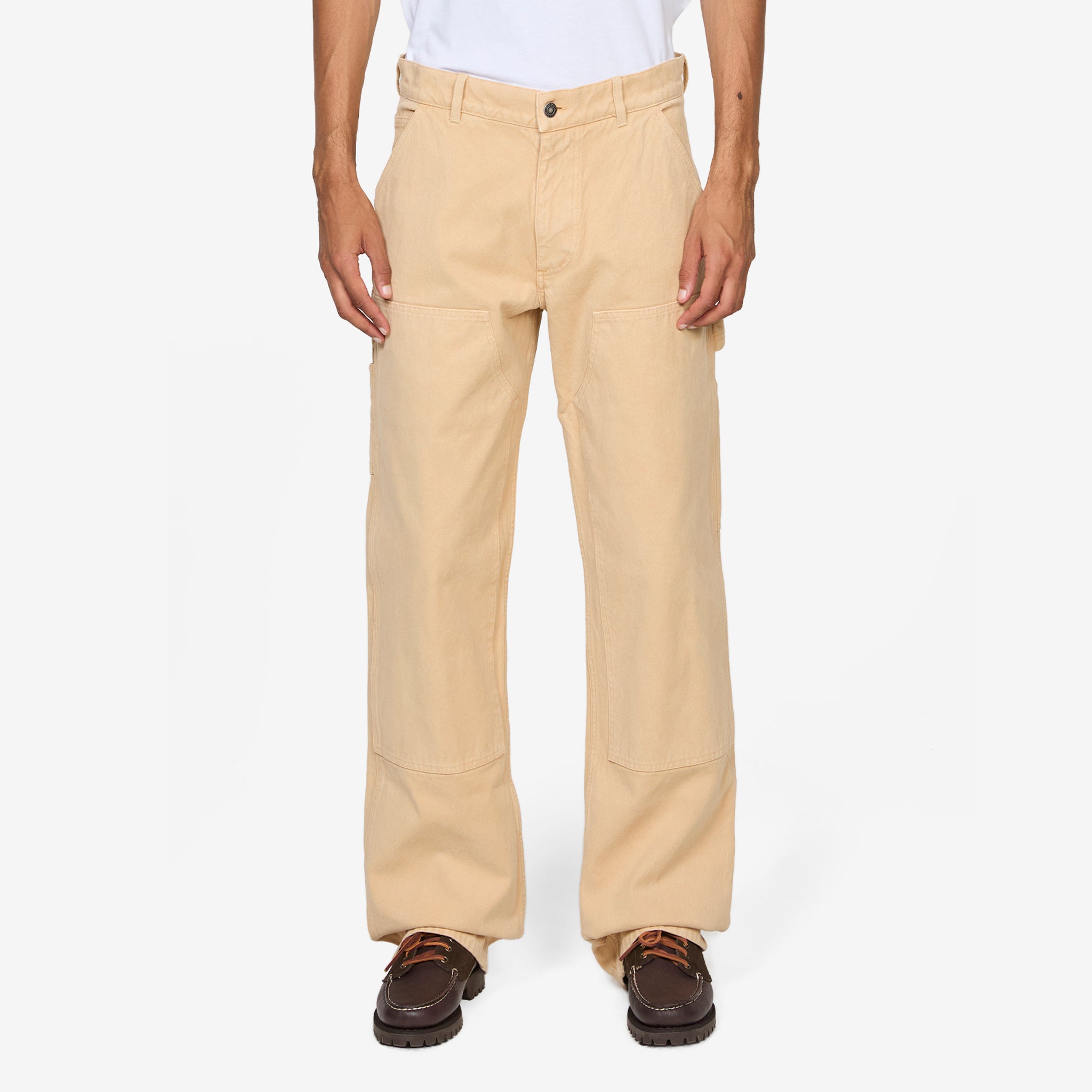 Canvas Double Knee Pants in Beige from Sky High Farm Workwear. Relaxed fit pants with a belt loop waistband, 5-pocket styling and carpenter-style utitlity details at the thighs. Crafted from a durable canvas cotton blend with double-knee reinforcements. Finished with tonal embroidery at the coin pocket.