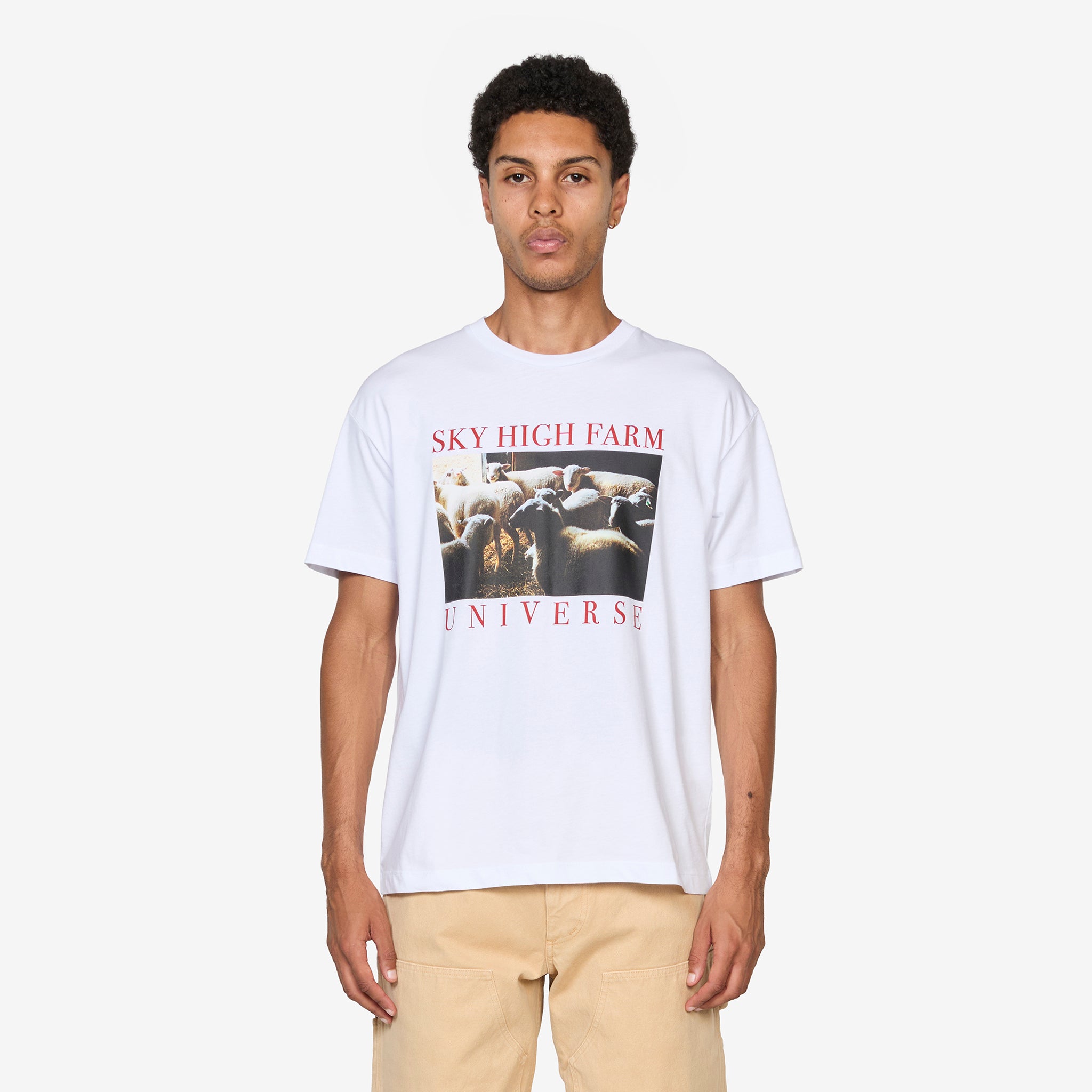 Sheep T-Shirt in White from Sky High Farm Workwear. Relaxed, boxy-fit t-shirt with a ribbed crew neckline. Crafted from regeneratively farmed cotton and finished with printed artwork by Jake Booth across the chest.