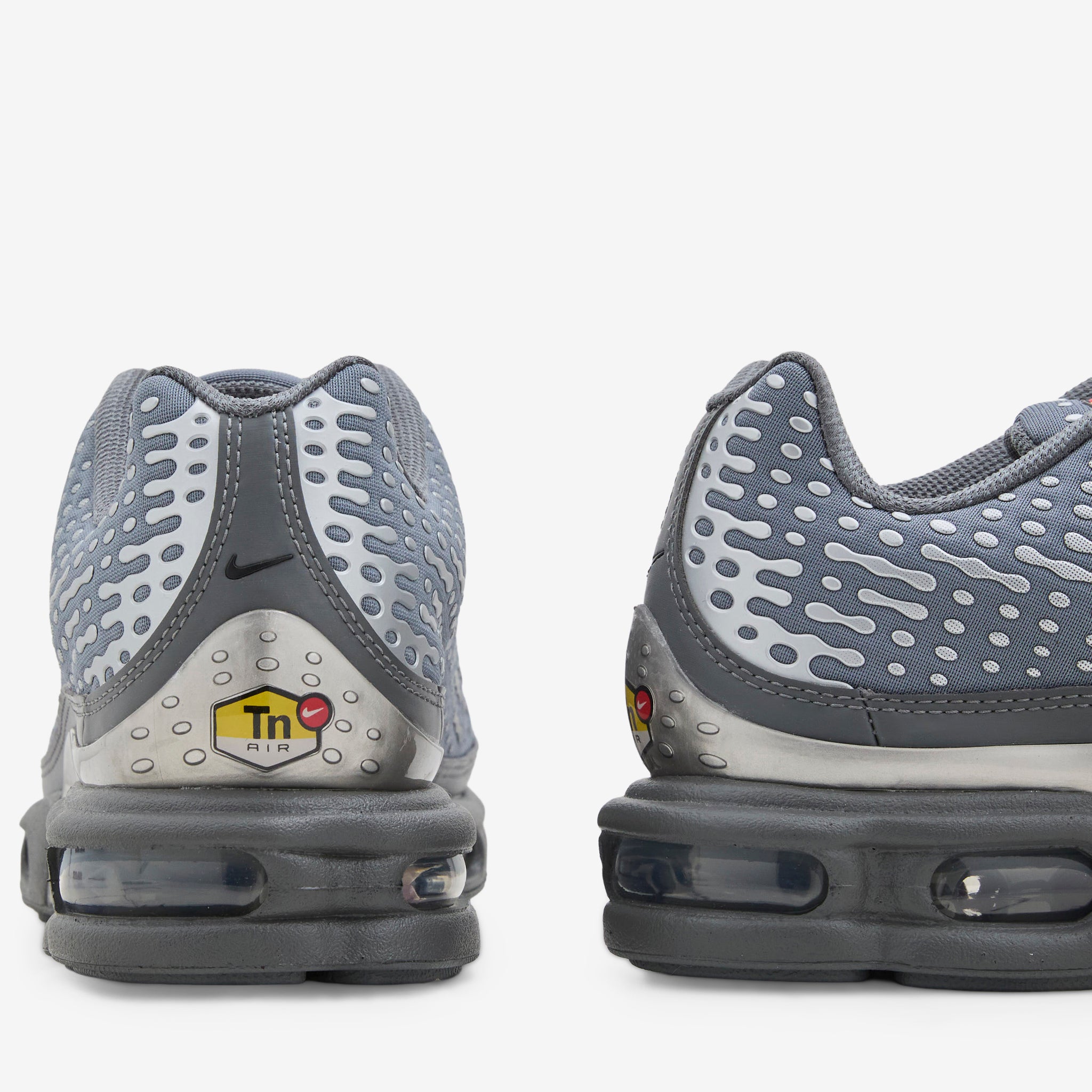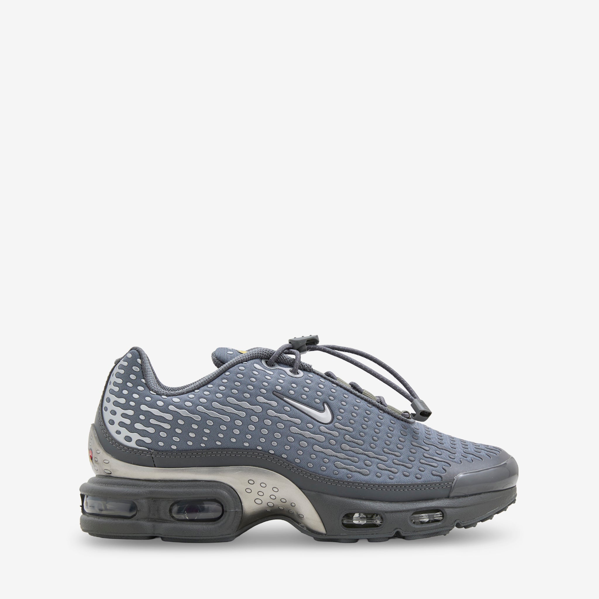 Men's Air Max Plus VII in Smoke Grey, Metallic Silver and Iron Grey from Nike. Returning 20 years after its 2005 debut, the Air Max Plus VII returns with a ripple overlay mesh upper, toggle lace closure and TPU toecap. Midsole shank and visible tuned Nike Air cushioning provide all day support. FInished with Tuned branding at the tongue and a rubber outsole for traction.