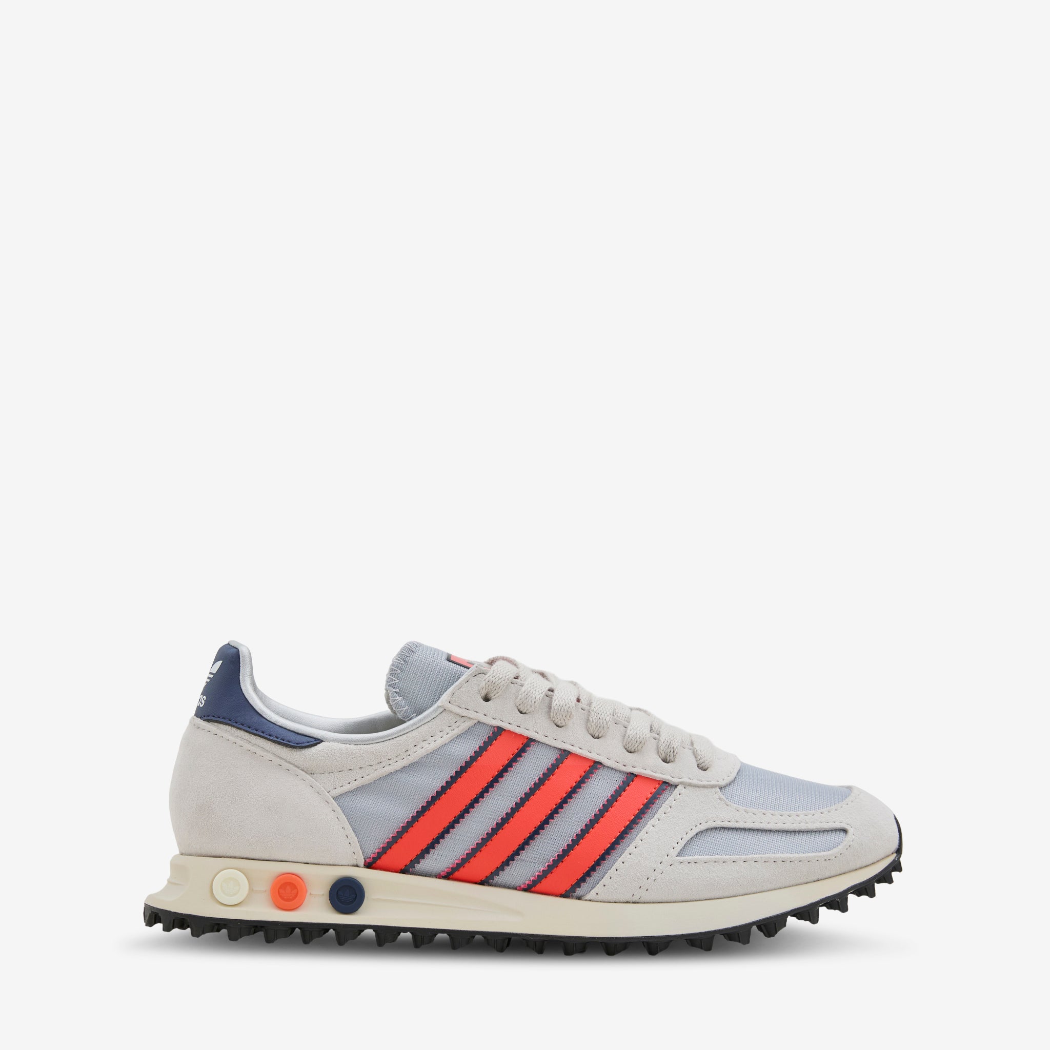 Men's LA Trainer OG in Silver Metallic and Dark Blue from adidas Originals. Soft nylon upper with premium suede overlays. Reshaped midsole with iconic heel plugs and rubber outsole provide traction and support. Finished with serrated leather 3-Stripes and adidas branding.