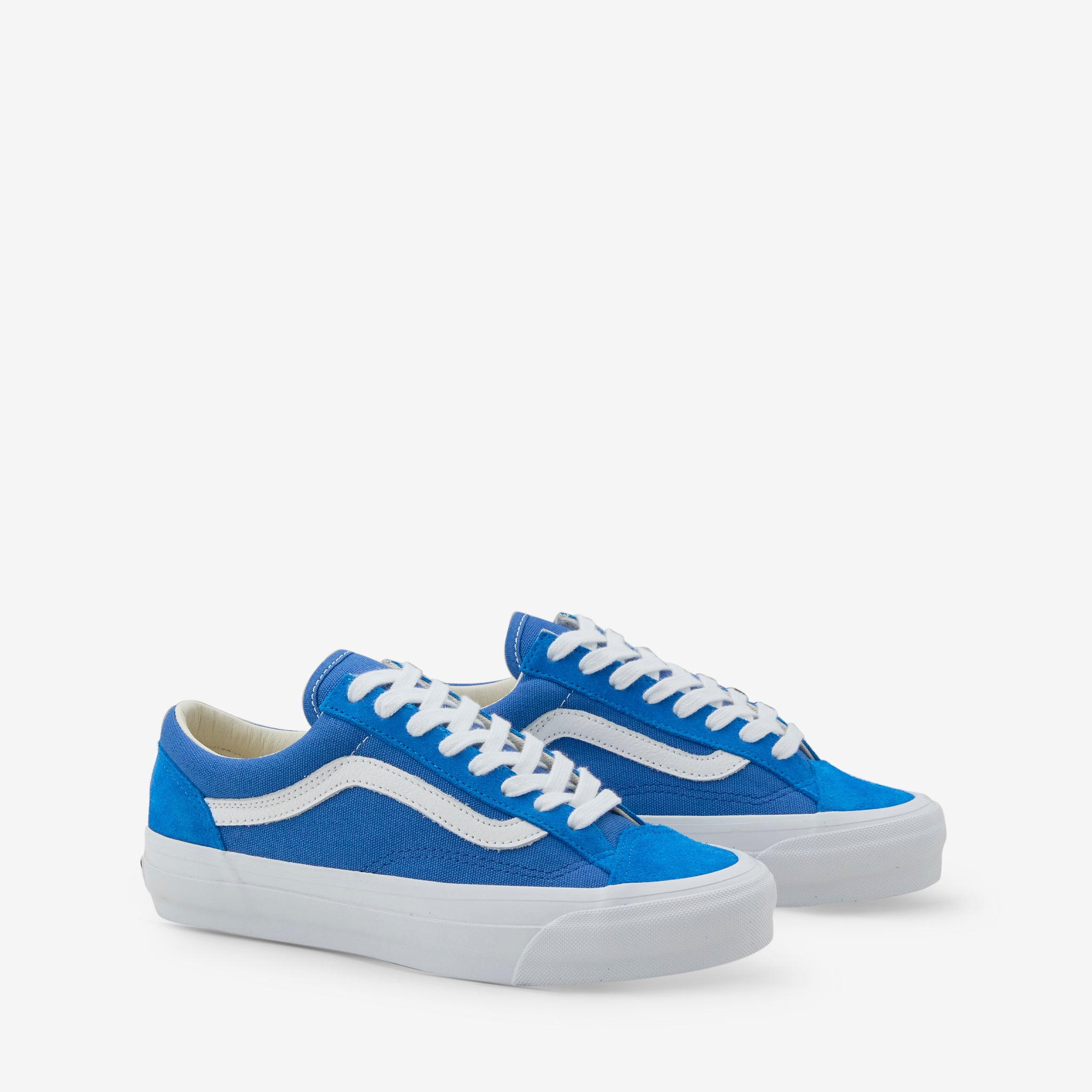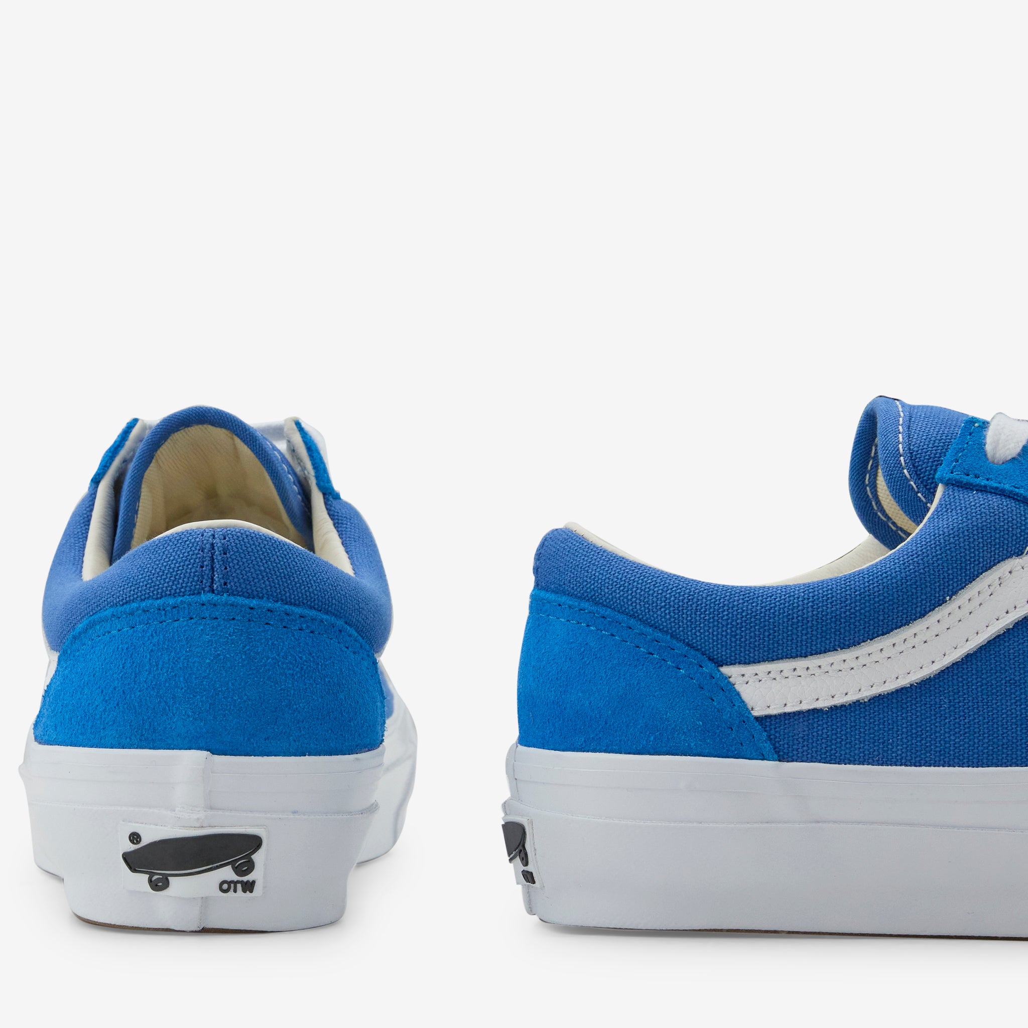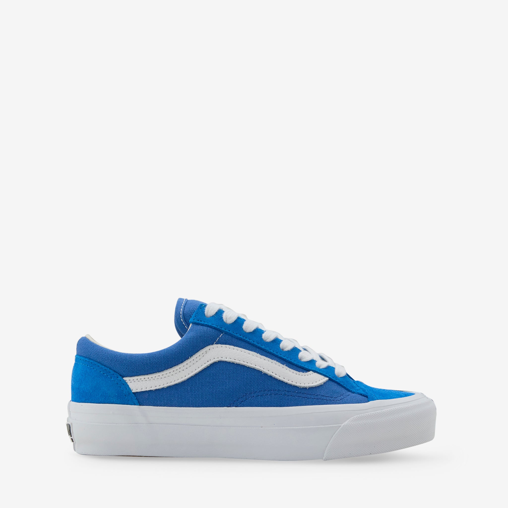 Men's Old Skool 36 in Blue and White froVans. A re-issue of the classic Style 36 from 1977. Features the signature Sidestripe™  canvas upper with a full grain leather collar lining. The Sola Foam ADC provides comfort for all-day wearability.