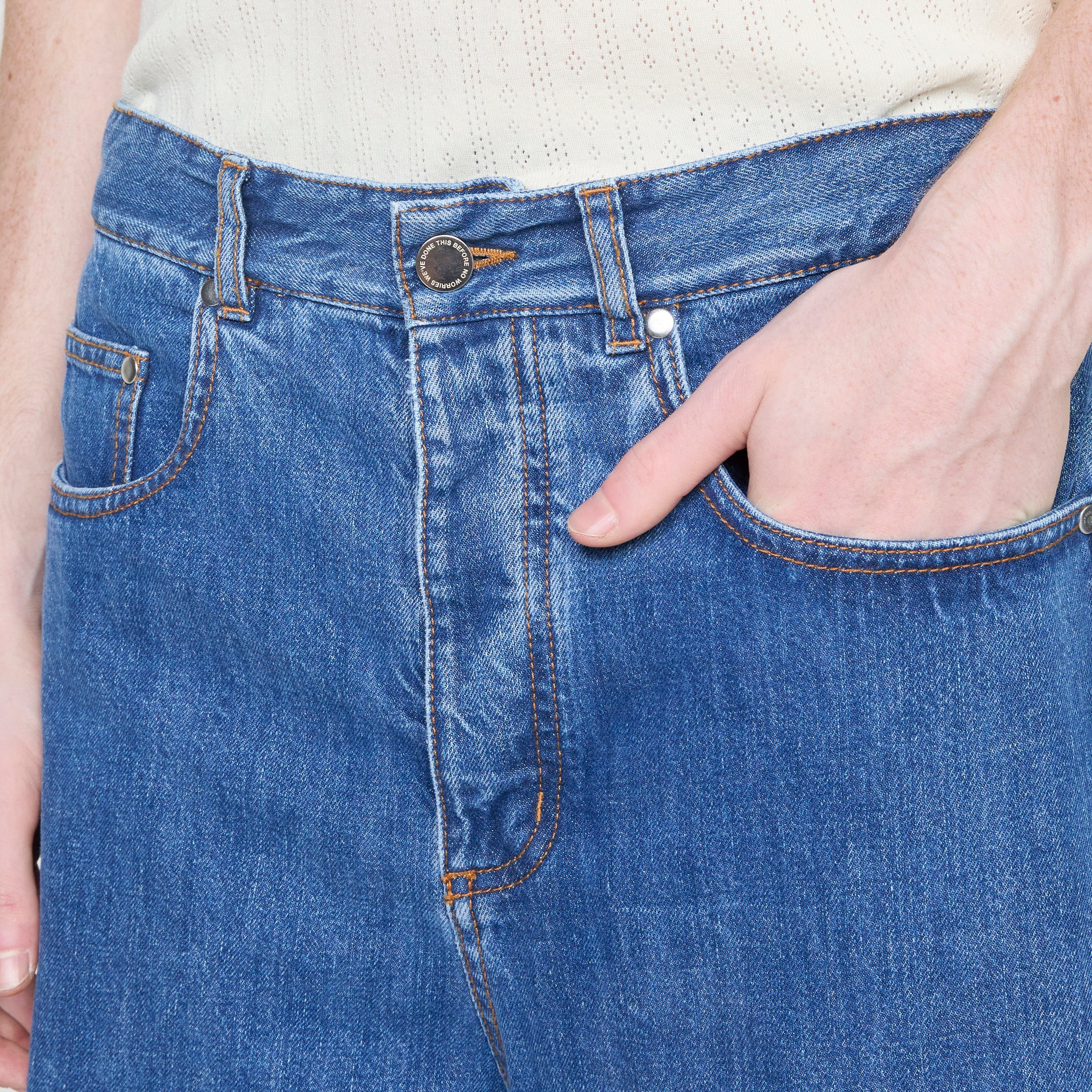 Unisex Kandan Jeans in Light Selvedge Denim from A Kind of Guise. Made from heavy selvedge denim with a dense weave and robust structure. Made with a unique 'O' shape due to darts on the shins, five pockets, selvedge seam at the back.