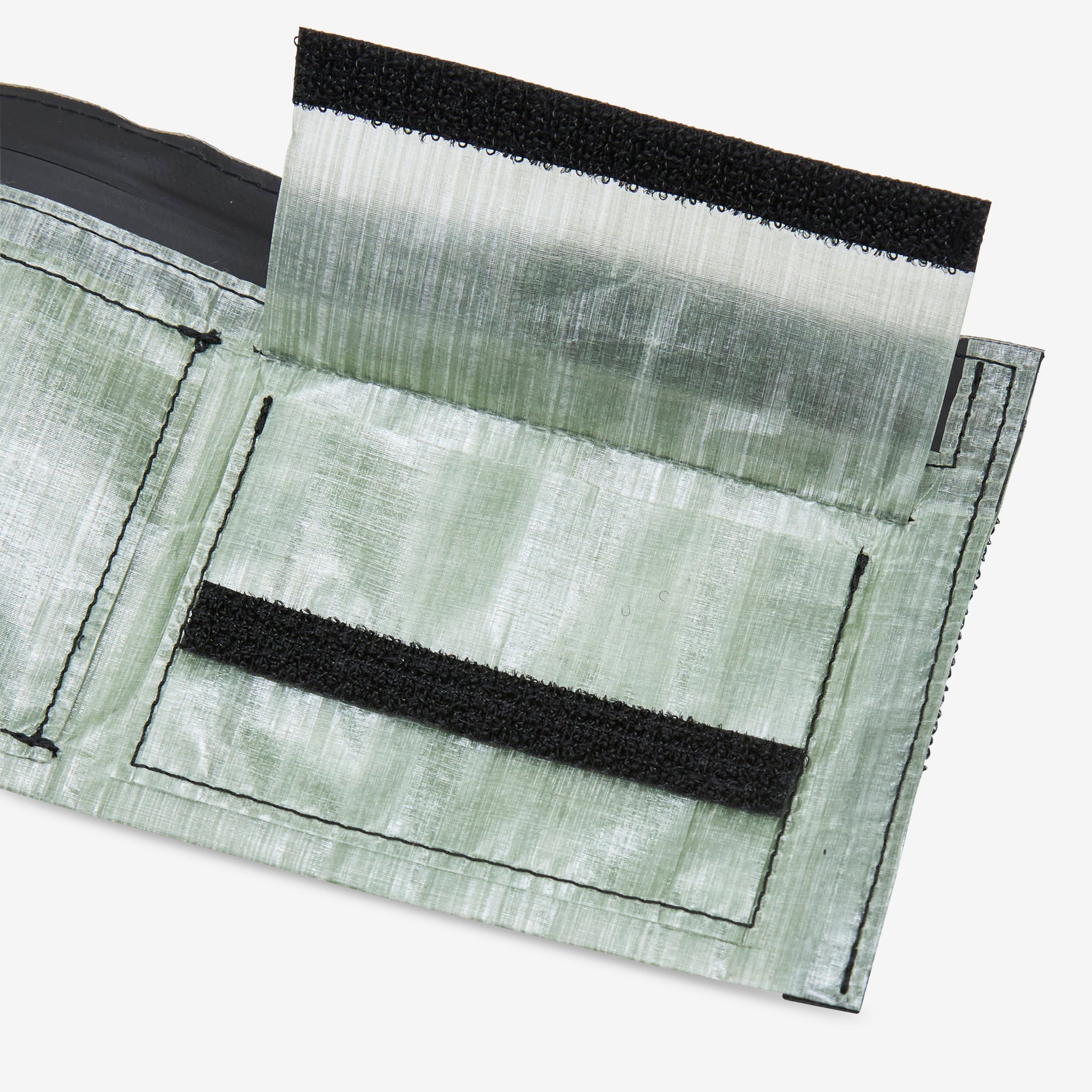 UL Wallet With Dyneema® in Green from and wander. Ultra-lightweight bifold wallet made from DSM’s Dyneema composite fabric, a UV-laminated polyethylene used in high-performance racing sails. Tear-resistant, highly waterproof, and weighs just 20g. Features include a zipped bill sleeve, coin pocket, removable card holder, and printed logo at the front.