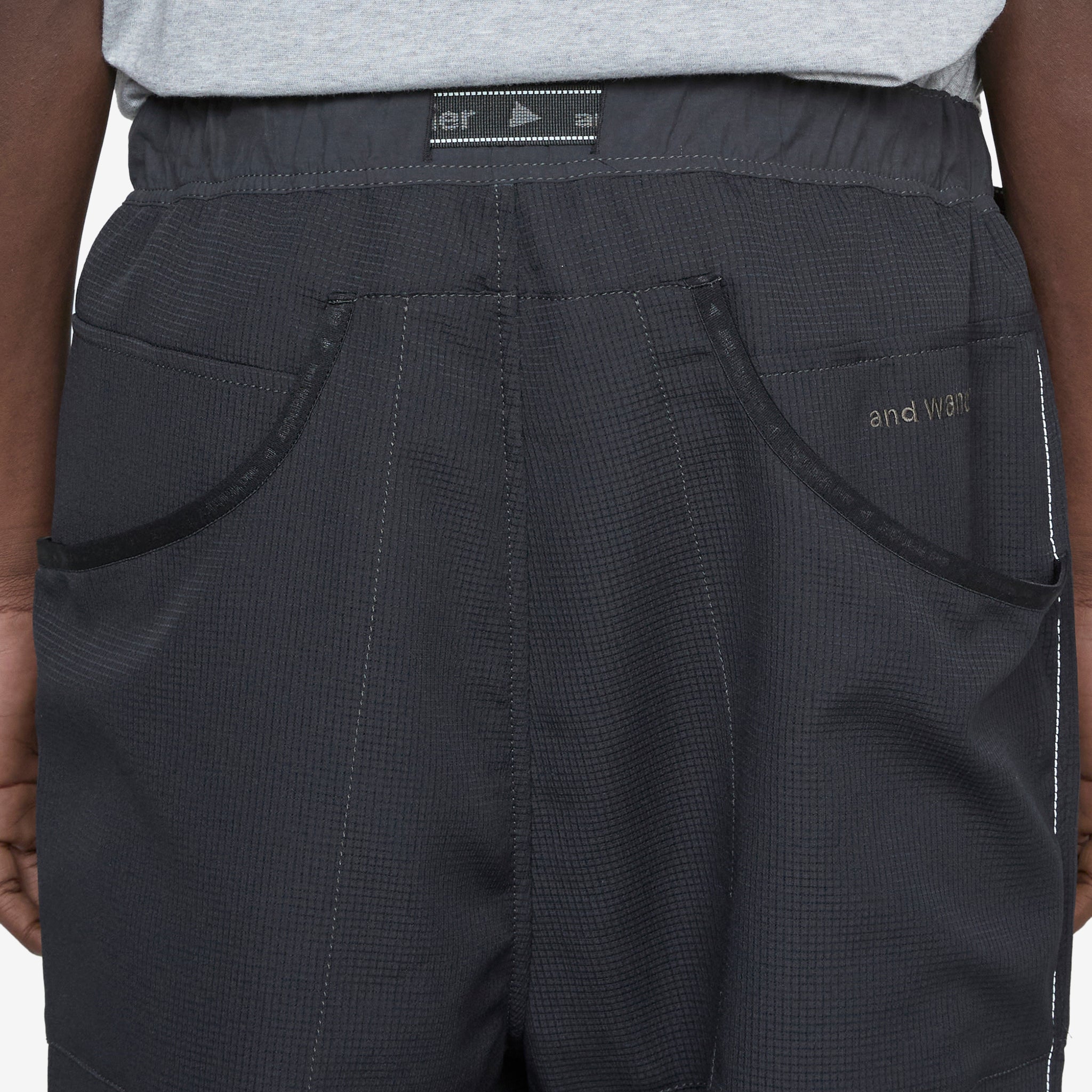 Men's Vent Pant in Black from and wander. Relaxed fit pants with an elasticated waistband with an integrated belt and drawstring adjustable elasticated hems. Crafted from polyester with ventilation all-over and a waffle texture to minimise contact with the skin. 6 pocket styling. Finished with embroidered branding on the back pocket.