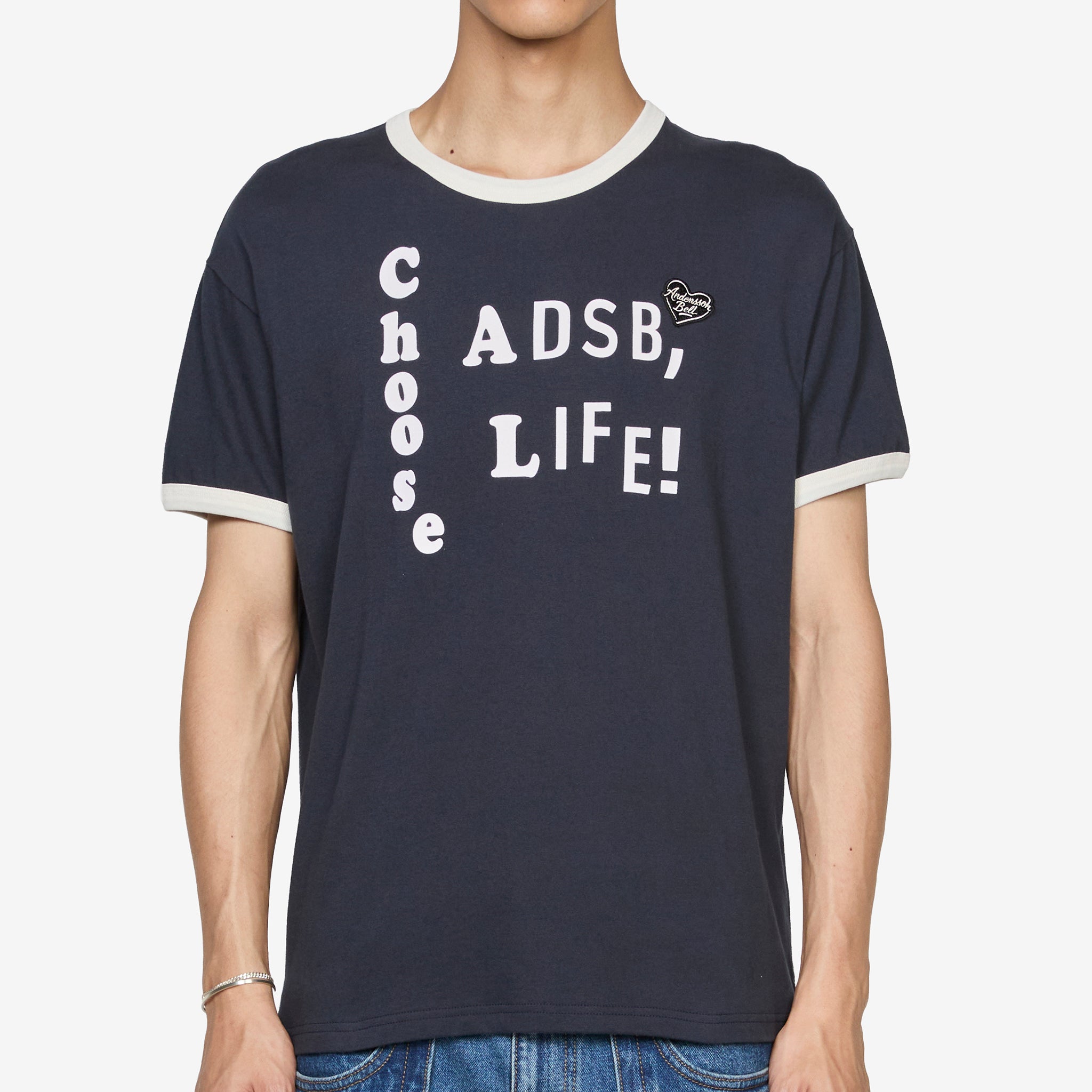 ADSB Flocking Ringer T-Shirt in Navy from Andersson Bell. Regular fit t-shirt with a crew neckline and ringer-style contrast ribbed trims. Crafted from cotton and finished with printed and embroidered brand details at the chest.