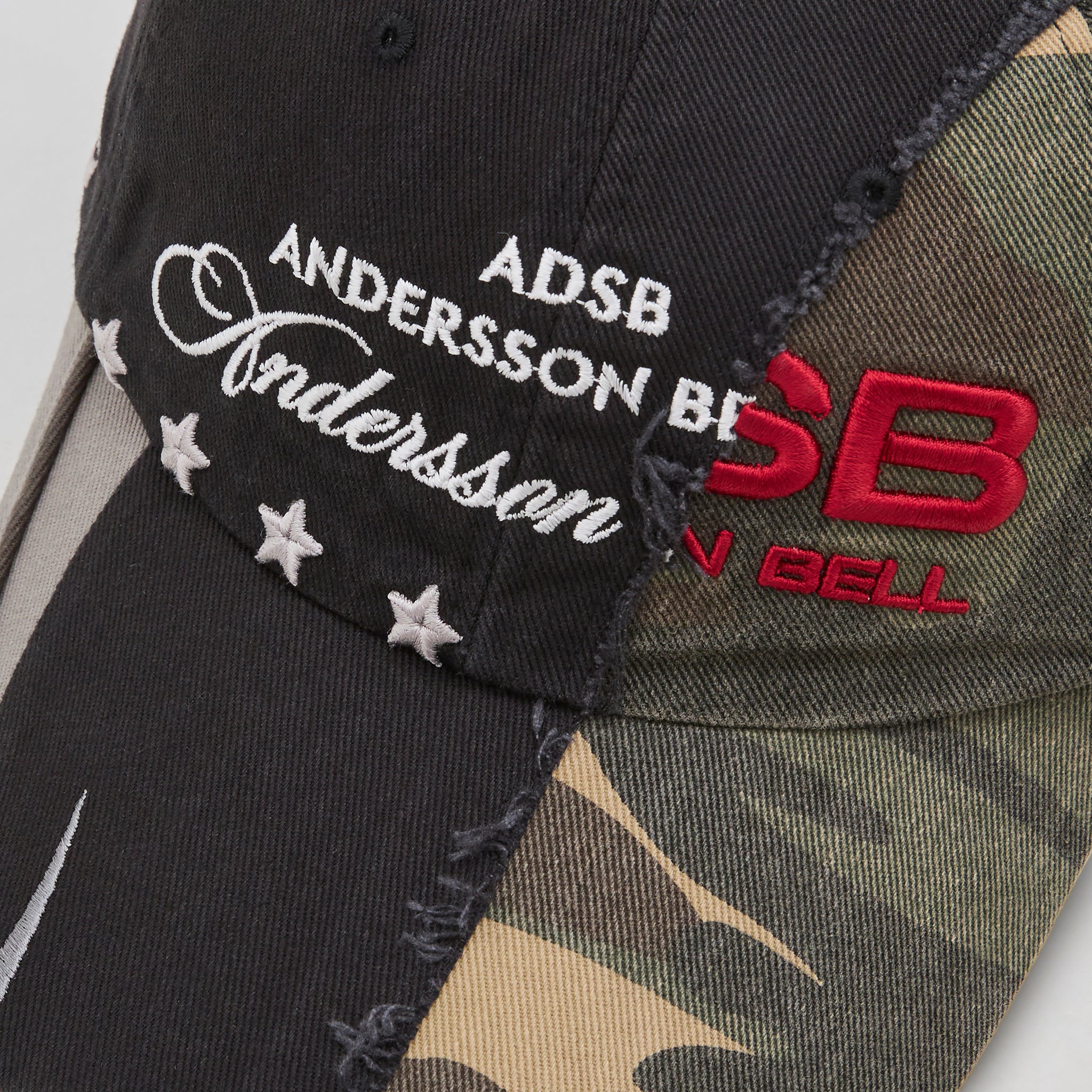 Camouflage Split Panelled Cap in Black and Khaki from Andersson Bell. 6-panel cap with embroidered ventilating eyelets and an adjustable self fabric backstrap. Crafted in an intricate double design, with contrasting panels and distressed seam detailing. Finished with embroidered branding and details throughout.