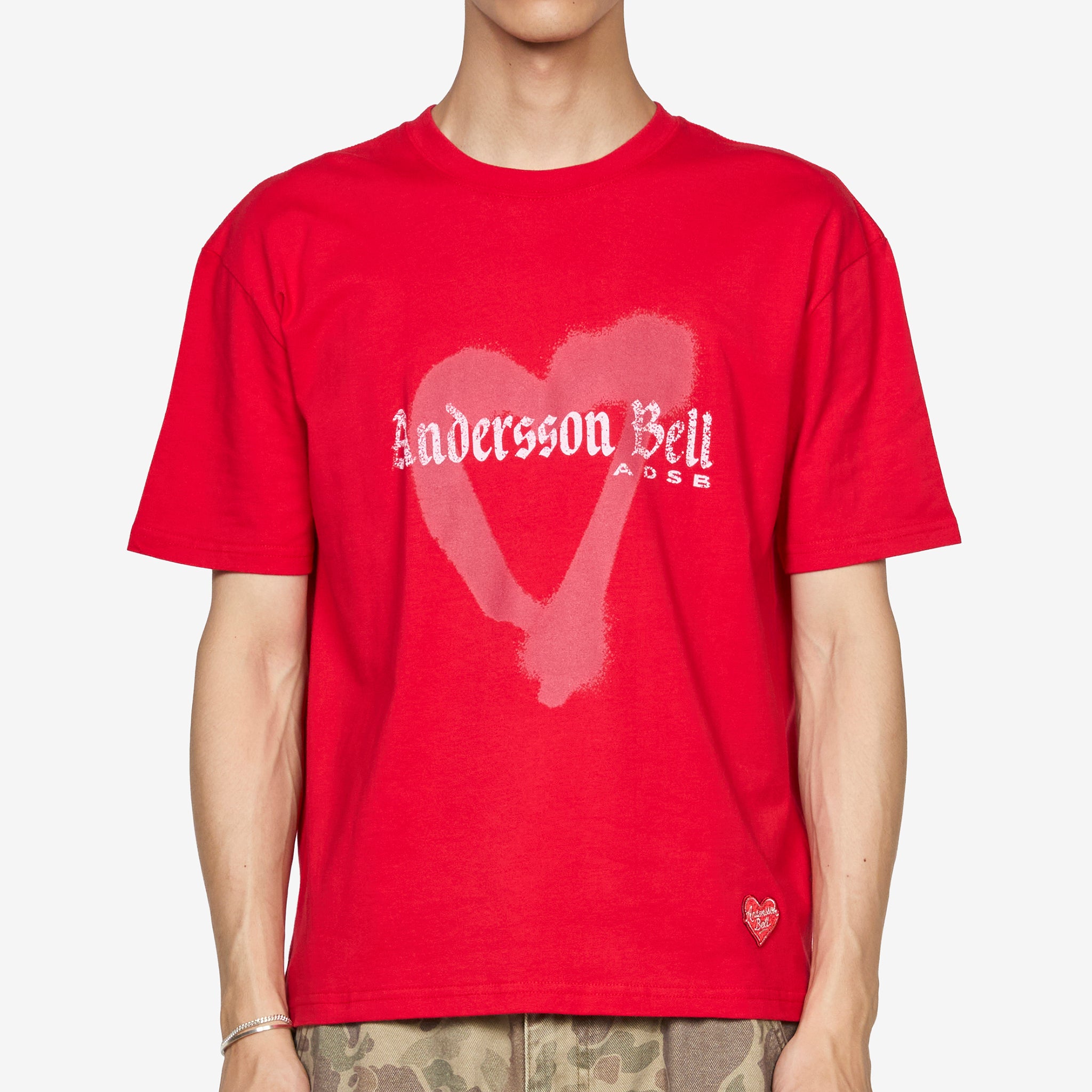 Heart T-Shirt in Red from Andersson Bell. Regular fit t-shirt with a ribbed crew neckline. Crafted from single cotton and finished with printed branding across the body and a woven patch at the left hem.