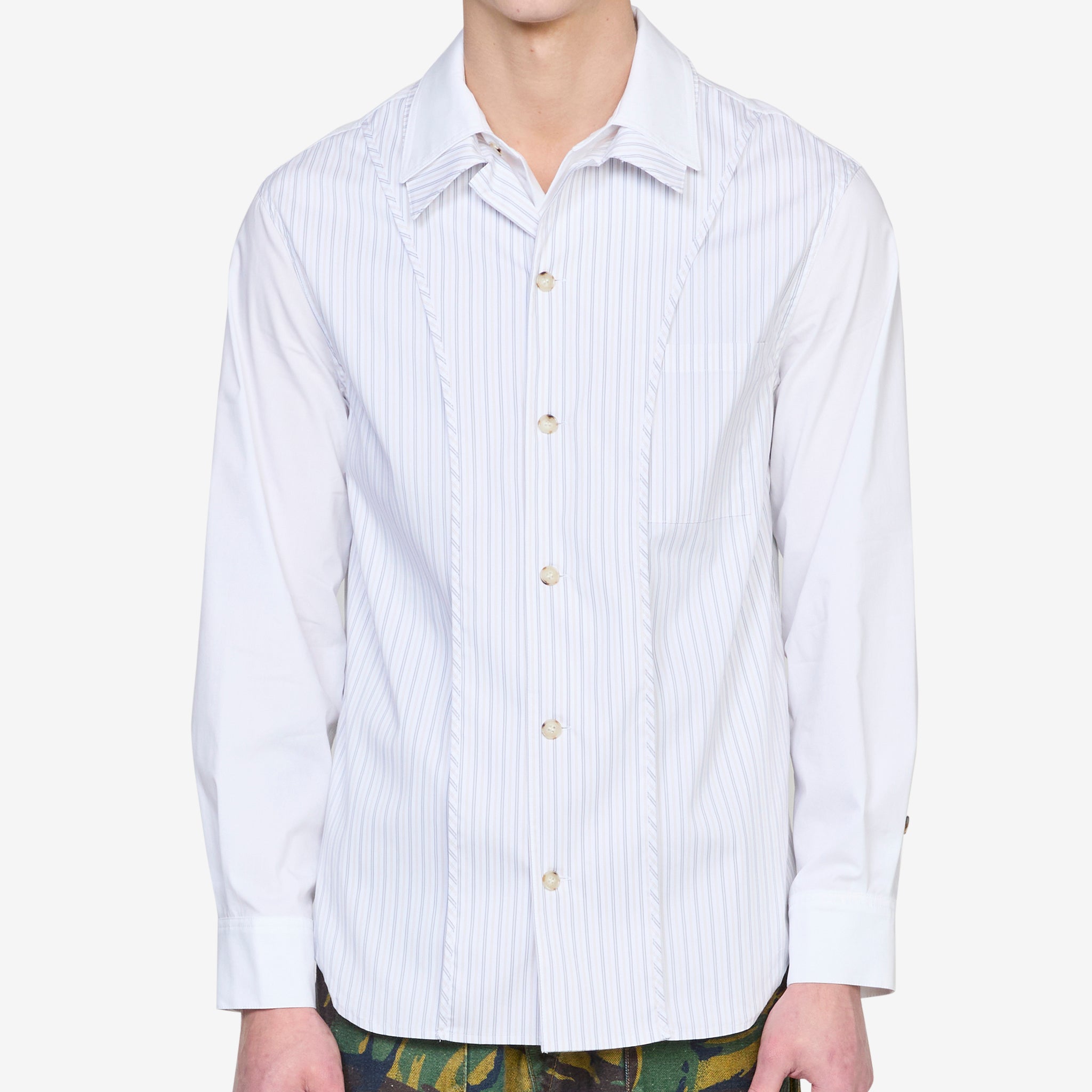 Open Collar Layered Shirt in White from Andersson Bell. Relaxed fit shirt with a layered spread collar, button-front closure and a curved shirttail hem. Crafted from a striped cotton blend with a layered placket and collar below. Finished with a patch pocket at the chest.