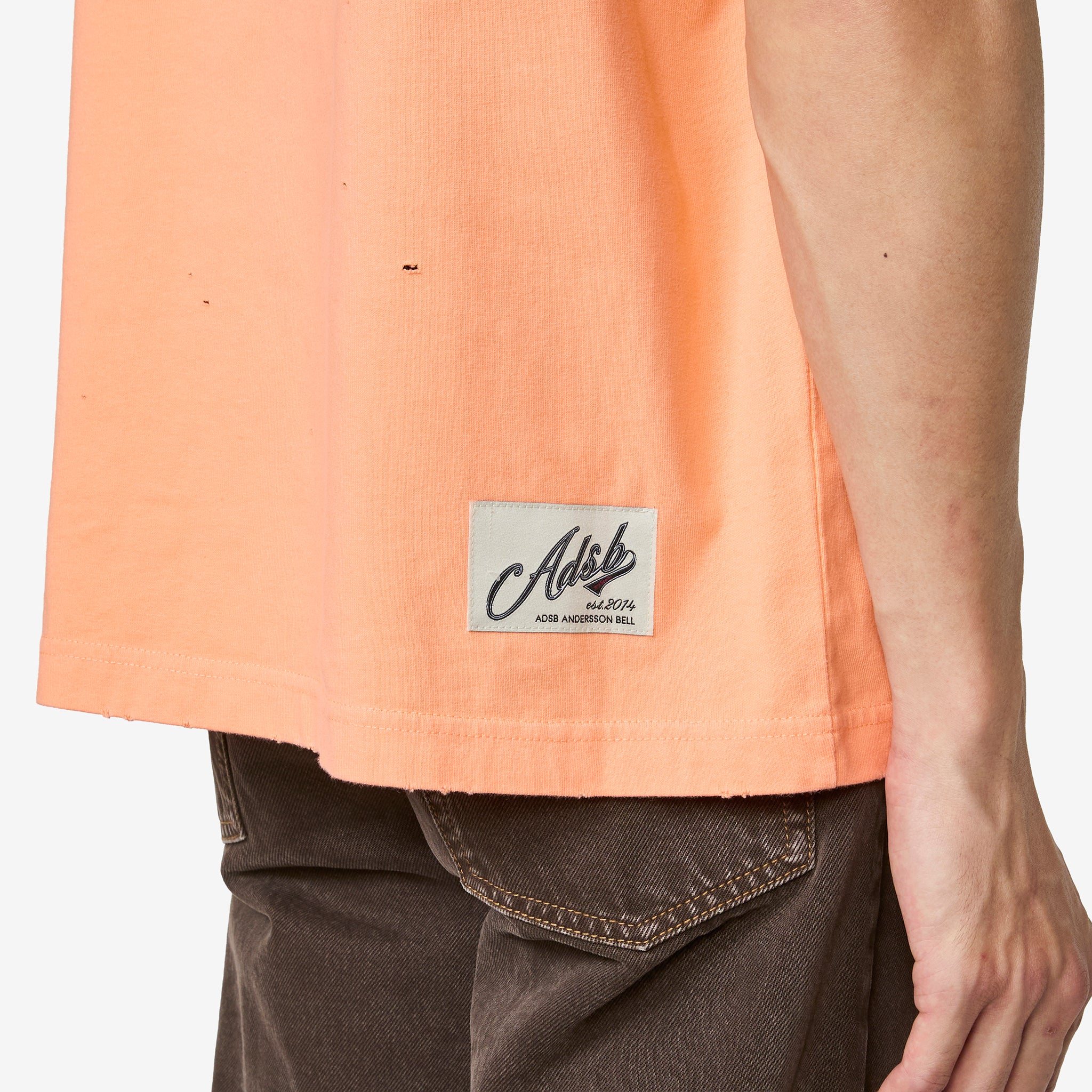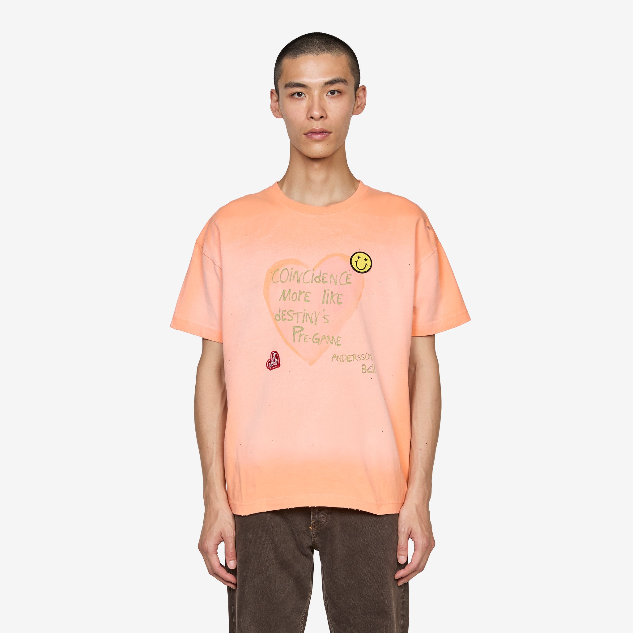 Spray Washed Heart Message T-Shirt in Orange from Andersson Bell. Relaxed fit t-shirt with a ribbed crew neckline. Crafted from a spray-washed cotton with hand-distressed hole details throughout. Finished with printed and embroidered brand details at the chest.