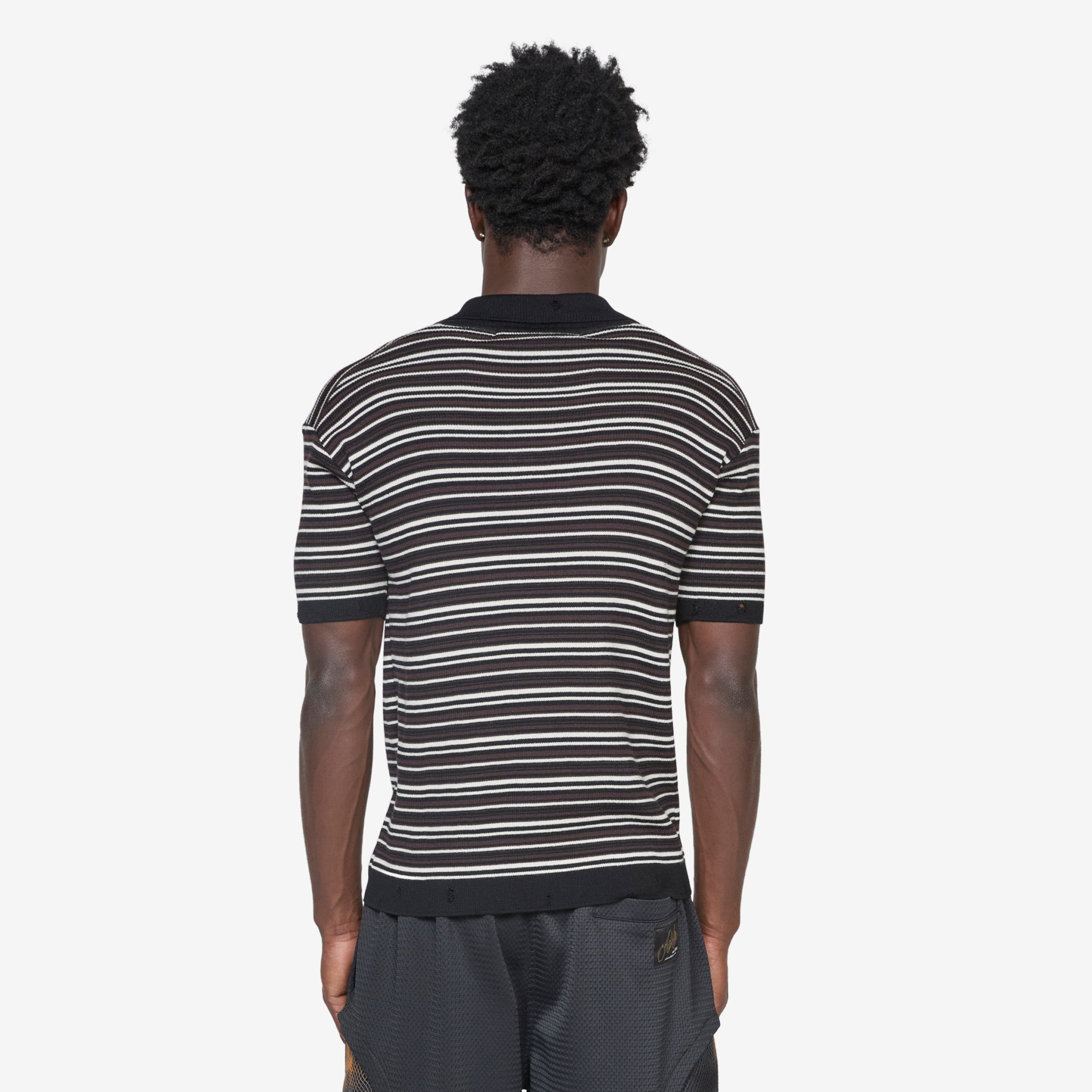 Stripe Polo Sweater in Black & Brown from Andersson Bell. Cut with a slightly cropped silhouette and slim fit. Horizontal stripes in black, brown and white, polo-collar with 3-button closure with ribbed cuffs, hem and collar. Branded badge on the right chest. Finished with distressing at the collar.
