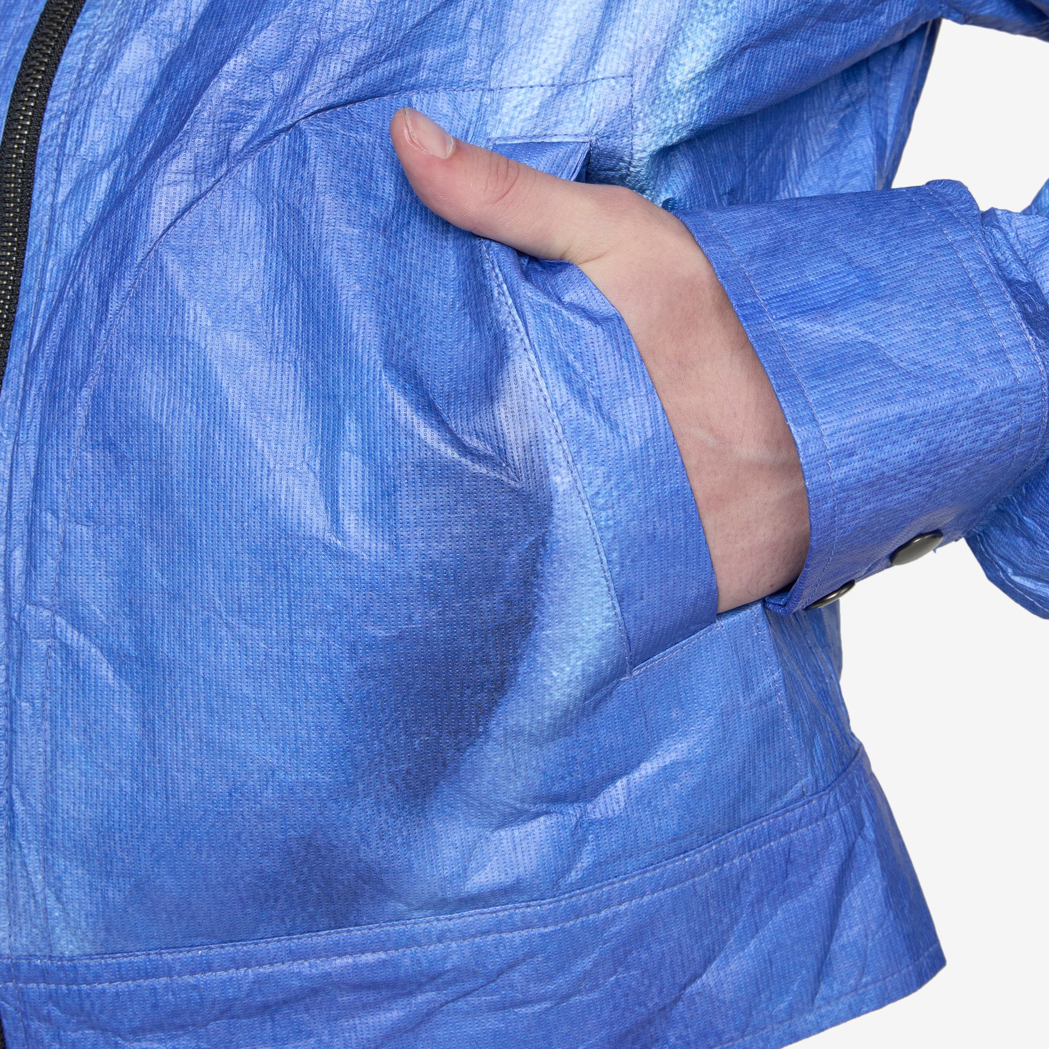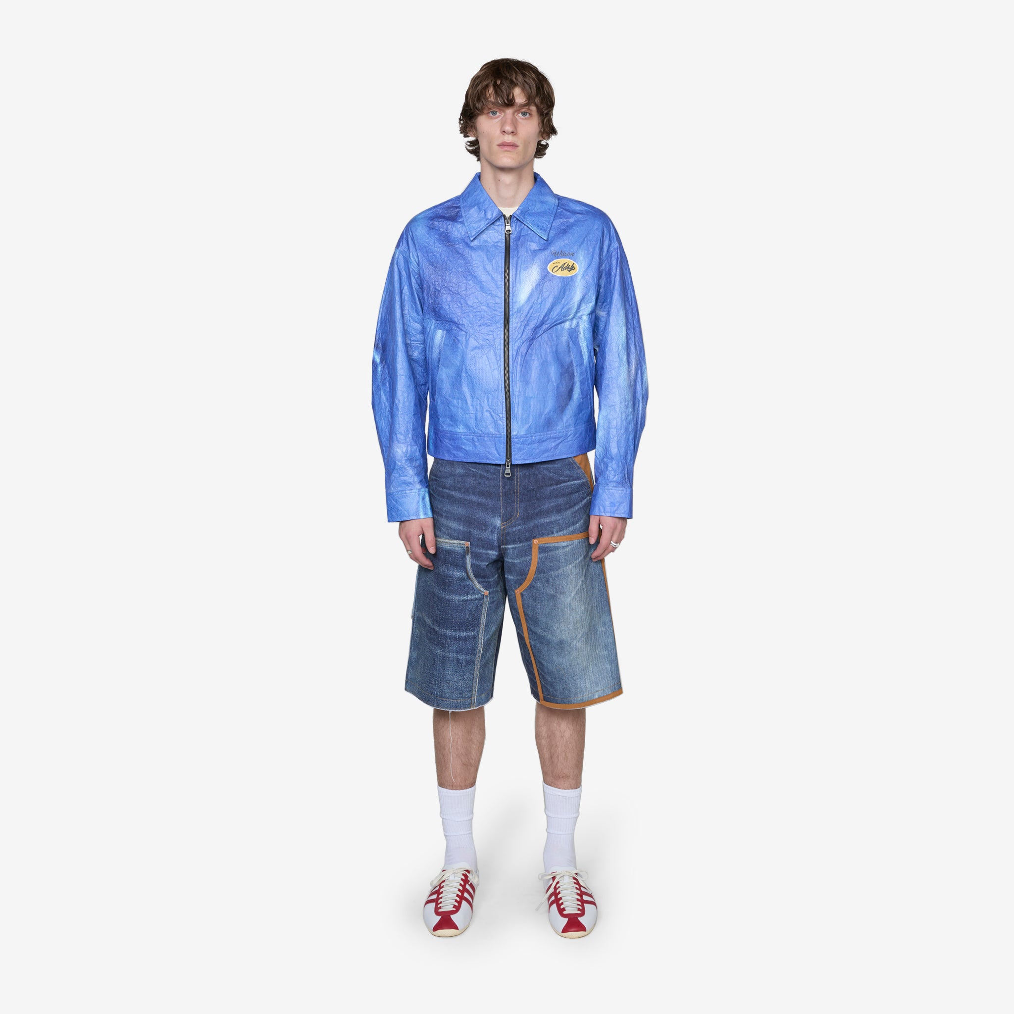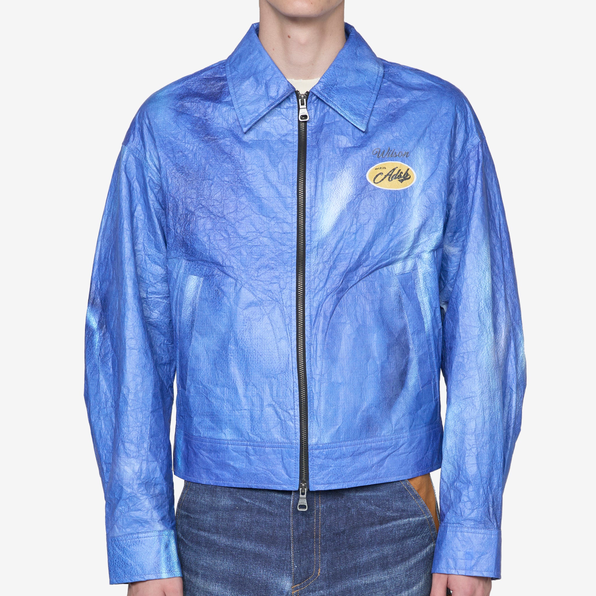 Wilson Printed Tyvek Jacket in Blue from Andersson Bell. Boxy fit jacket with a spread collar, two-way zip closure, two side pockets and snap-closure adjustable cuffs. Crafted from Tyvek, a durable and lightweight high-density polyethylene fabric. Finished with printed graphics on the chest and back and a branded jacron at the rear hem.