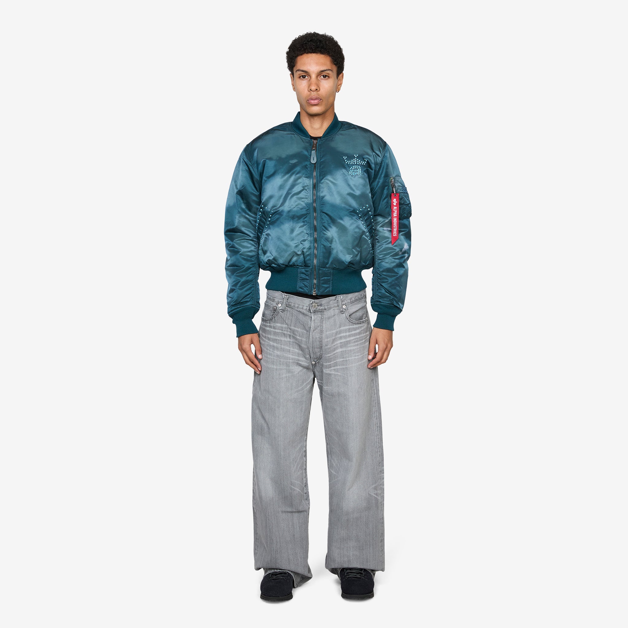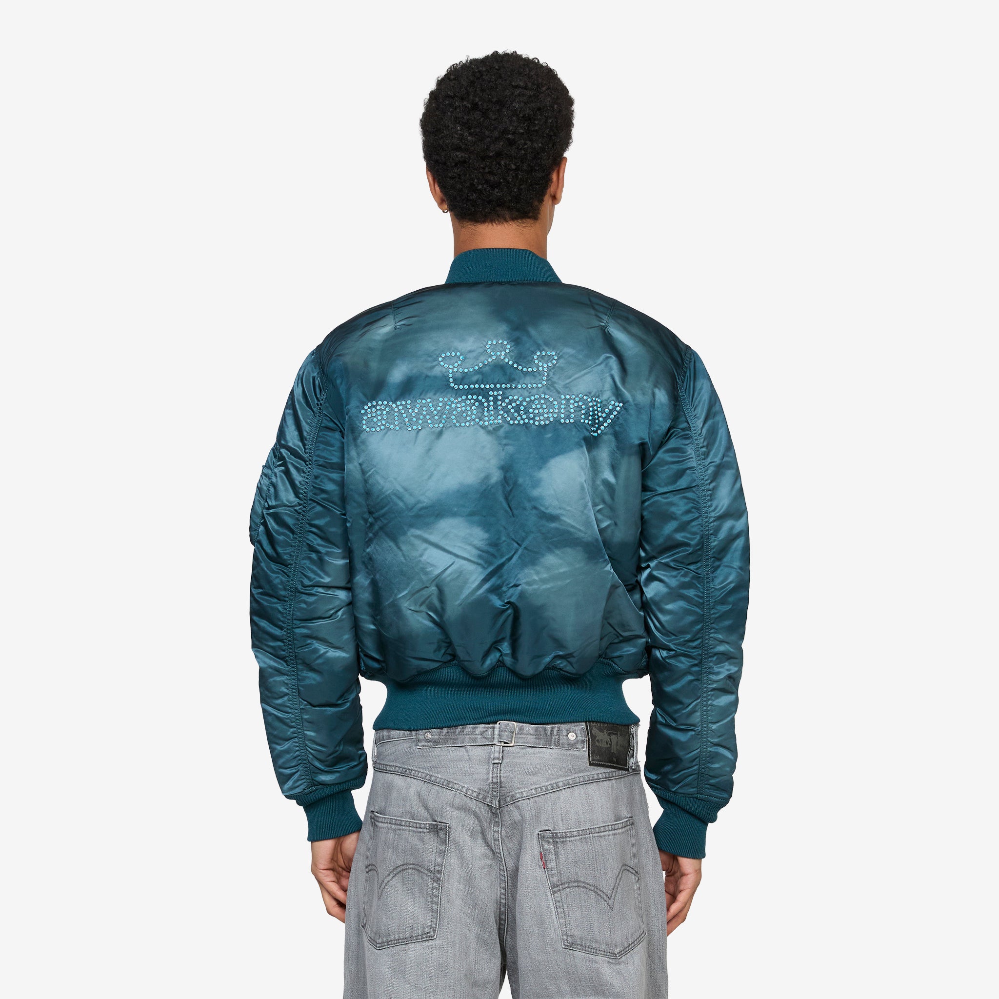Alpha M1 Jacket Navy from Awake NY. Awake NY reworks the classic MA-1 flight jacket with Alpha Industries in a custom overdyed teal nylon. Hand-applied turquoise studs form the crown and wordmark logo, adding bold contrast to the washed finish. Complete with dual-entry pockets, utility sleeve pocket, and ribbed trims.
