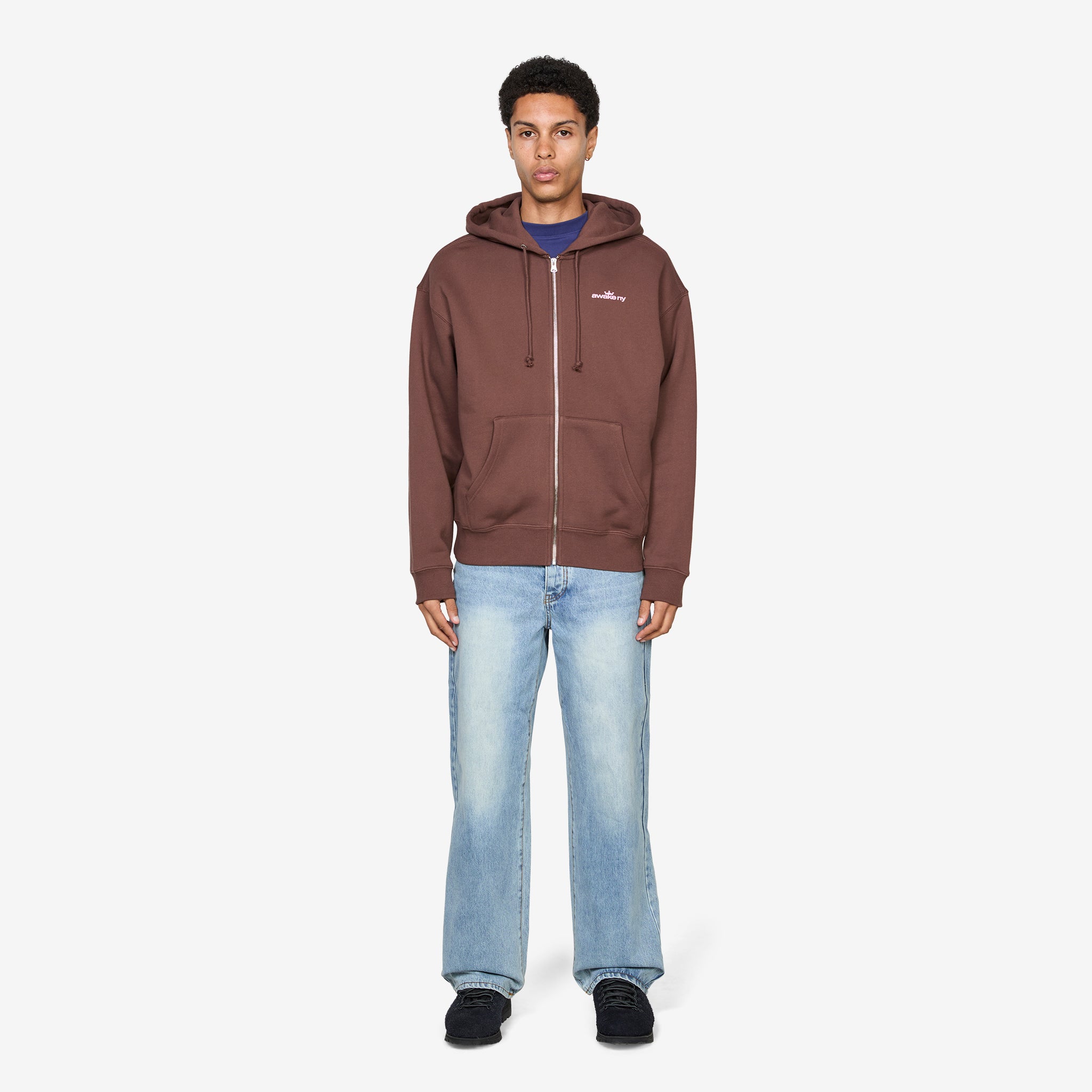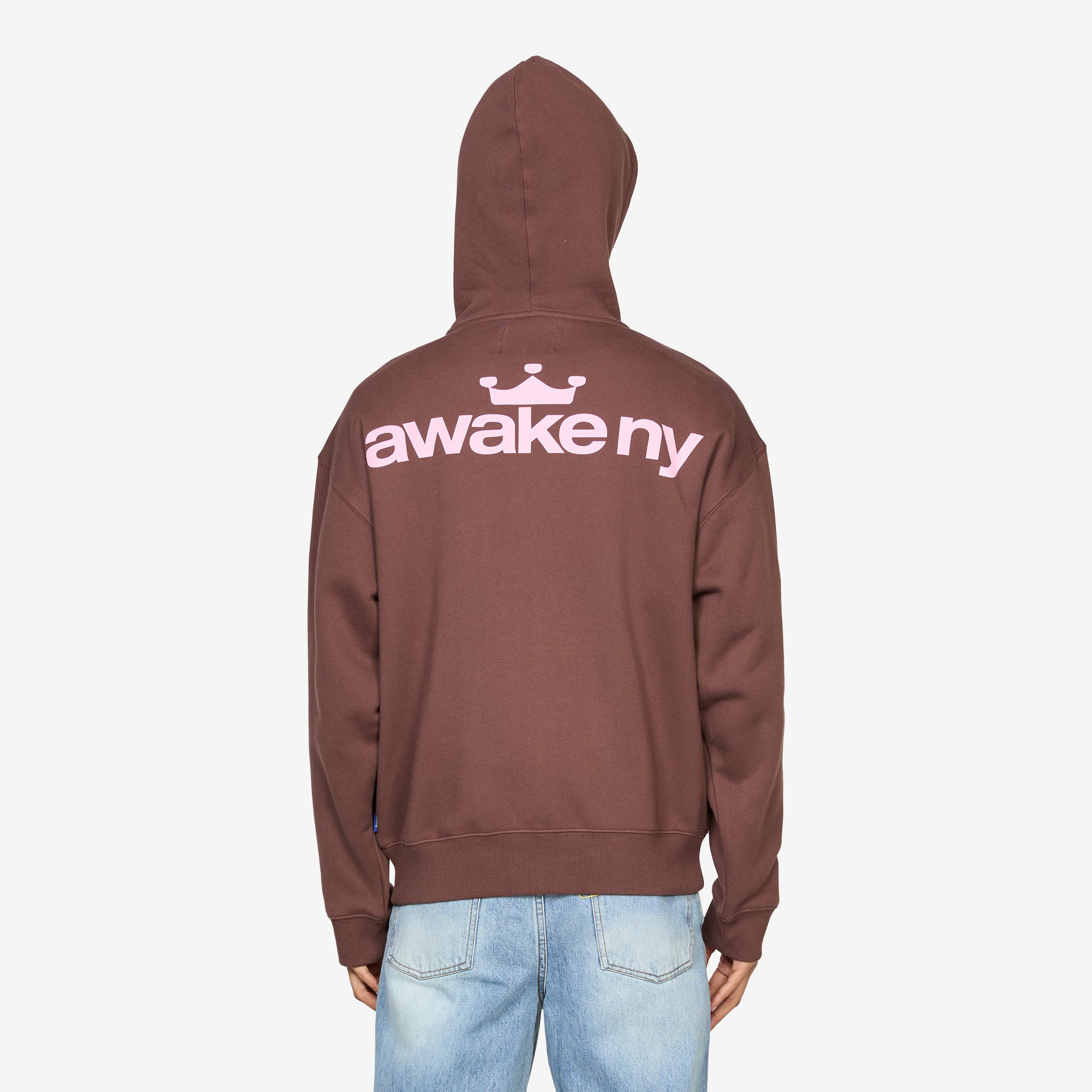 Crown Logo Full-Zip Hoodie Brown from Awake NY. Relaxed fit hoodie with a full zip front, ribbed trims, and kangaroo pockets. Crafted from washed cotton for a soft, lived‑in feel, and finished with bold printed graphics across the chest and back.