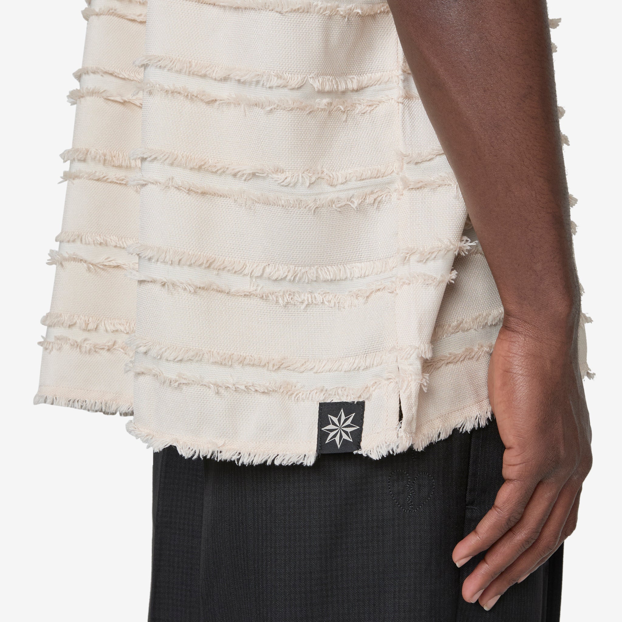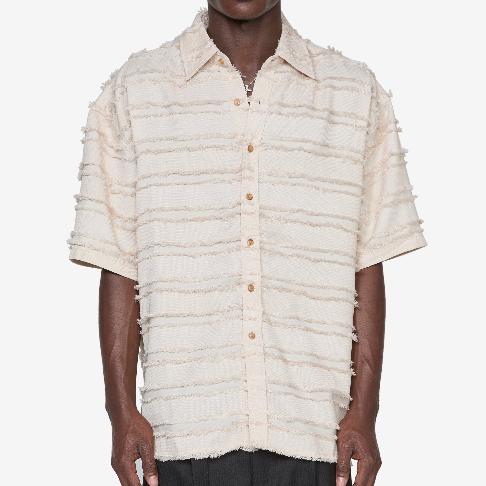 Boxy Short Sleeve Shirt in Bone from Beach Brains. Relaxed fit short sleeve shirt with a spread collar, button closure and dropped shoulders. Crafted from a lightweight polyester with frayed panel details throughout.
