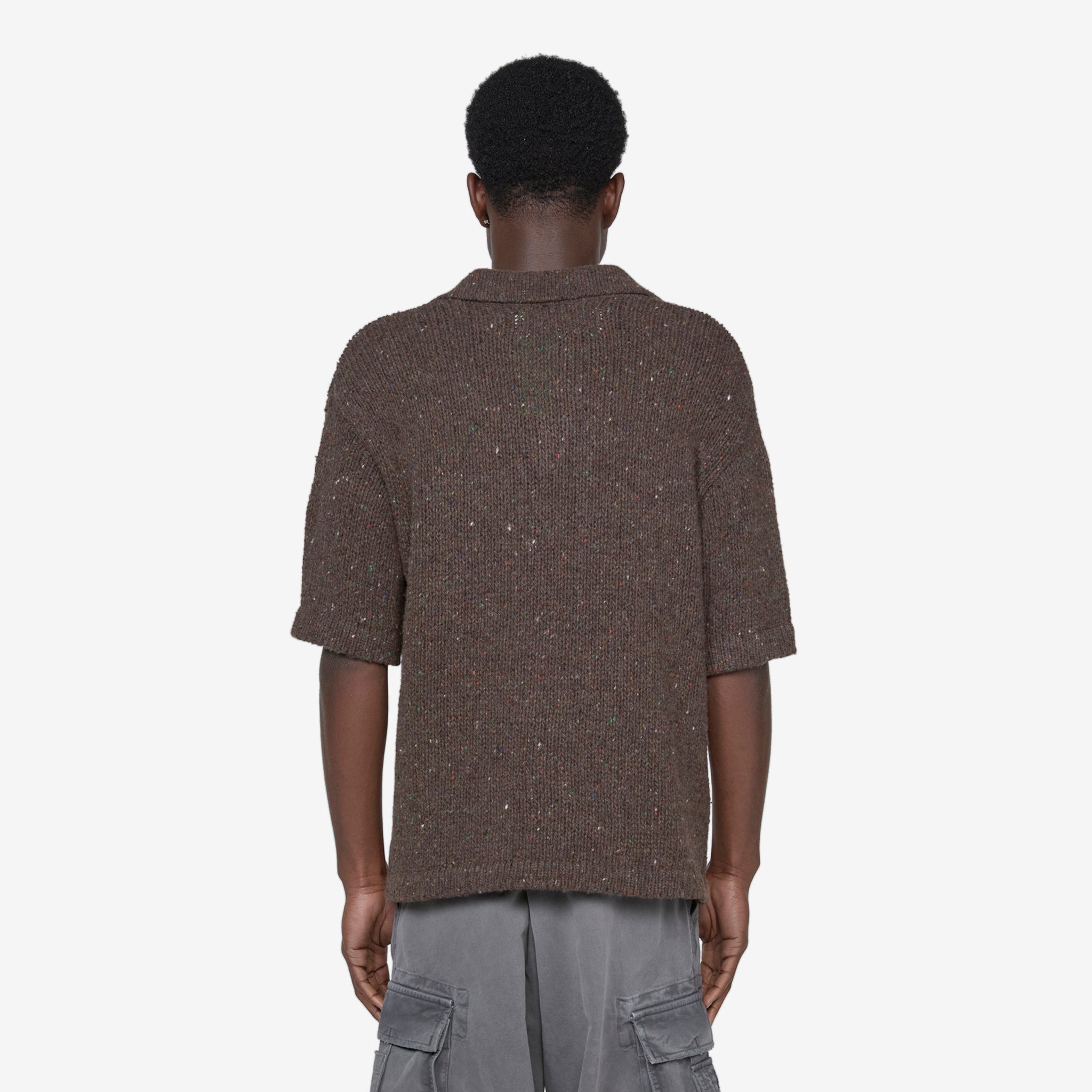 Unisex California Wool Knit Polo in Dark Brown from ERL. Boxy fit short-sleeve knitted polo shirt featuring an open collar and ribbed trims. Crafted from a wool blend for optimal weight and a soft finish. Finished with 'ERL' embroidered patch pocket on the front.