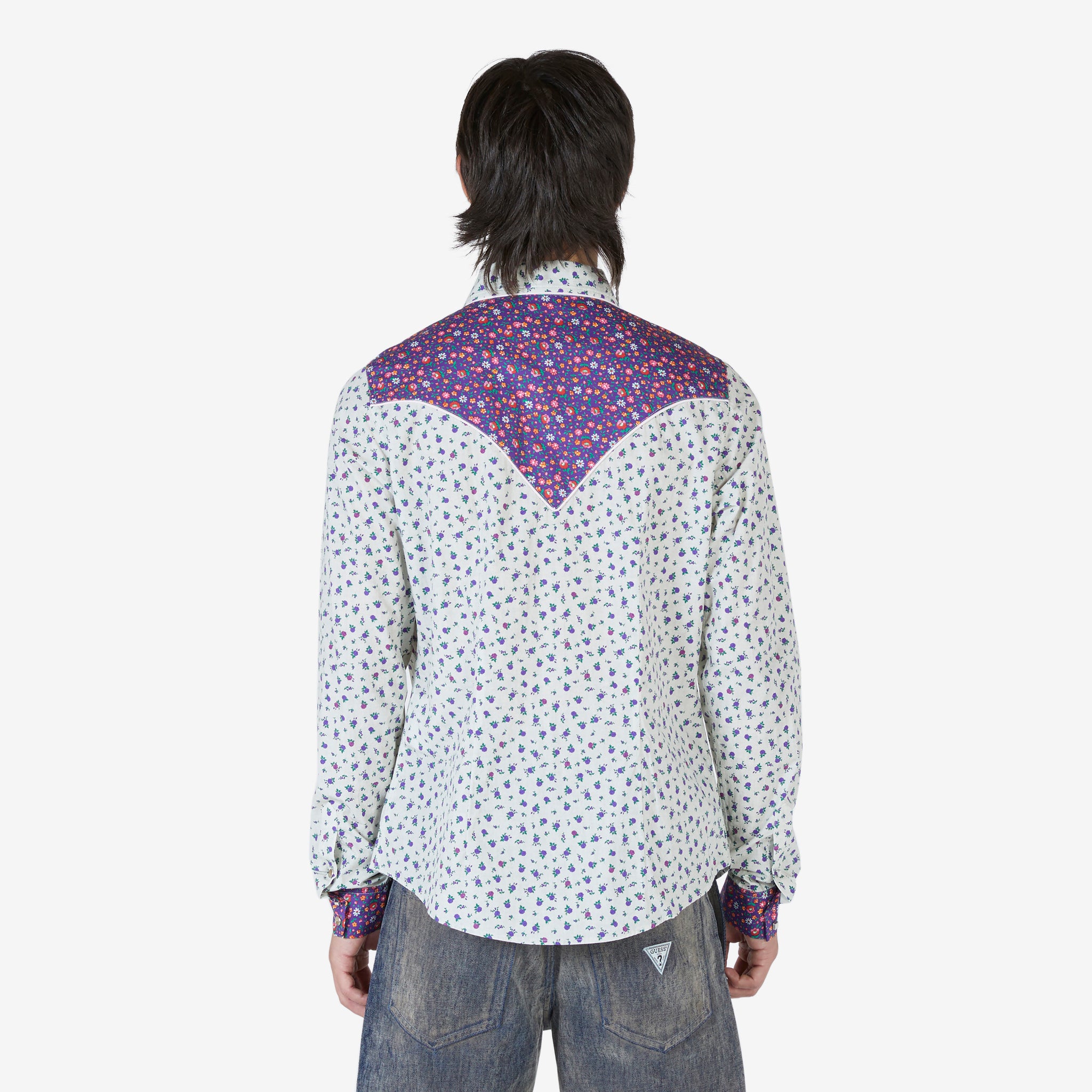 Unisex Western overshirt in white multi from ERL. Relaxed fit, longsleeve shirt with a curved hem and full marble button closure. Crafted from cotton with an all-over flower pattern. Features two single point pockets on the chest.