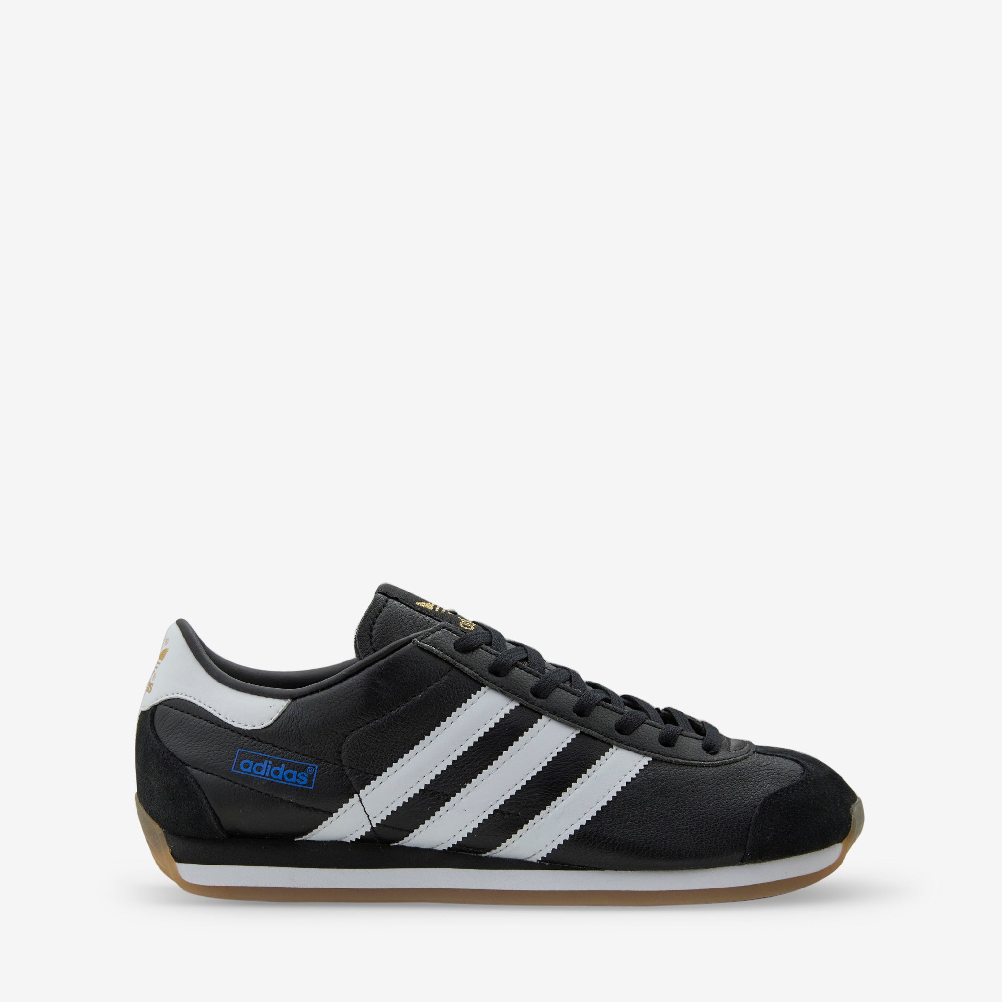Men's Country Japan in Core Black, Cloud White and Blue from Adidas Originals. Premium leather and suede upper with contrasting 3-Stripes for a vintage look. EVA midsole and a semi-translucent gum rubber outsole for all-day comfort and durability.