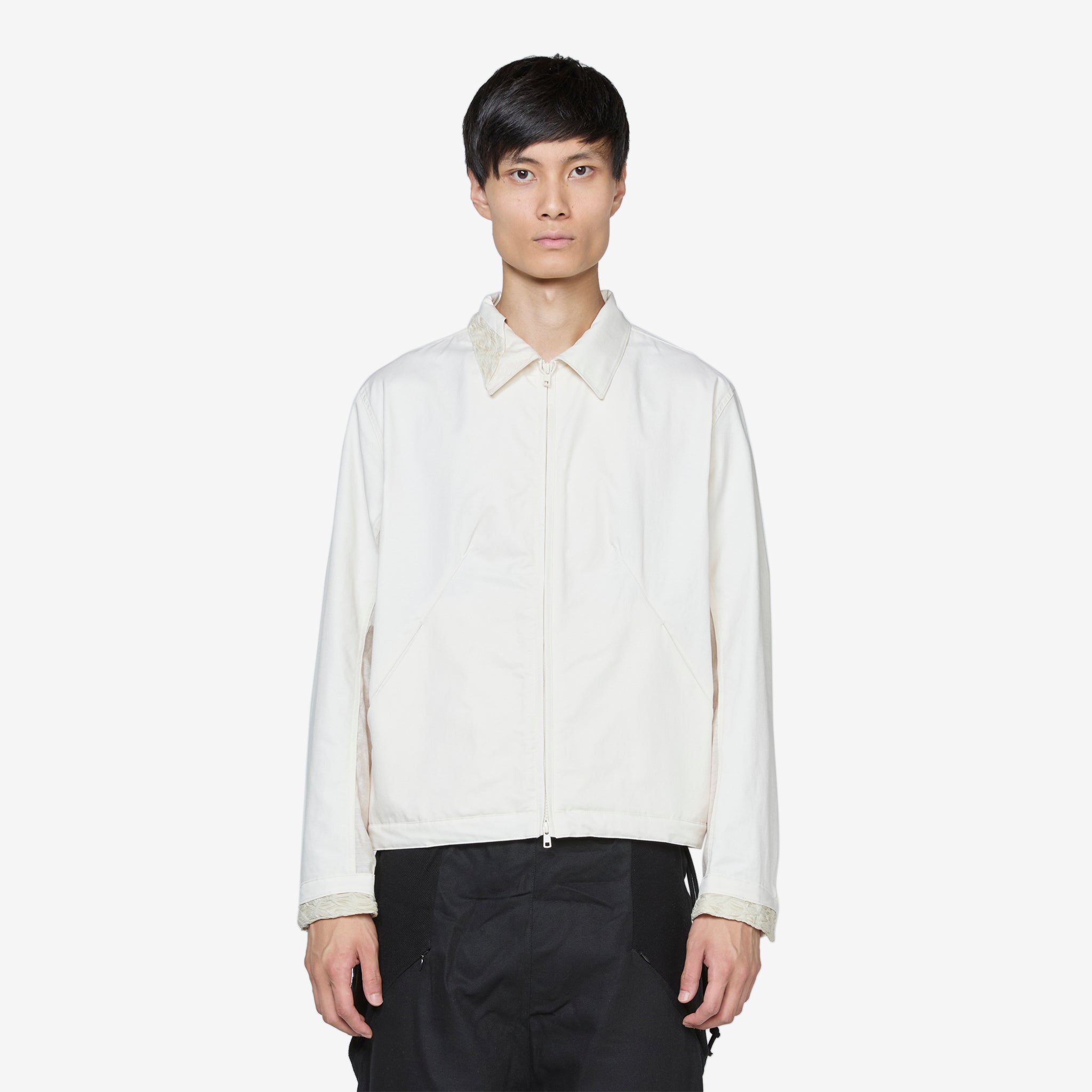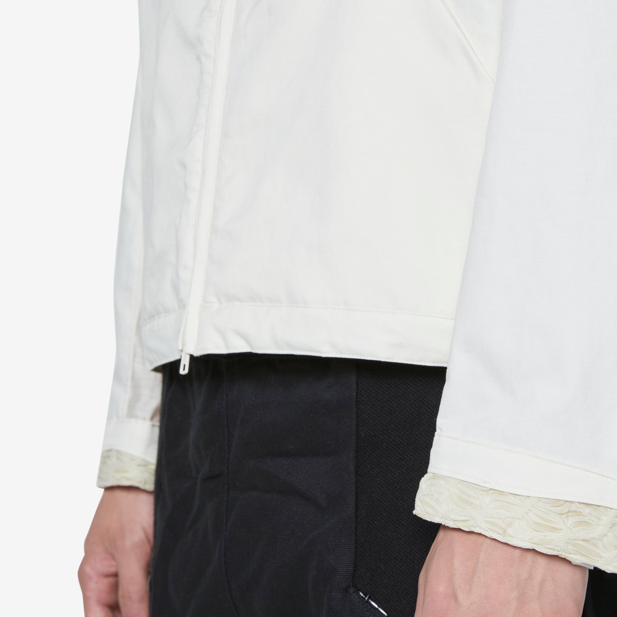 Men's Ep.5 05 Jacket in Ivory from XLIM. Regular fit jacket with YKK 2-way zip closure and snap adjustable cuffs. Crafted from a waterproof crinkle fabric developed in-house. Features panelled detailing on the collar, back and cuffs.