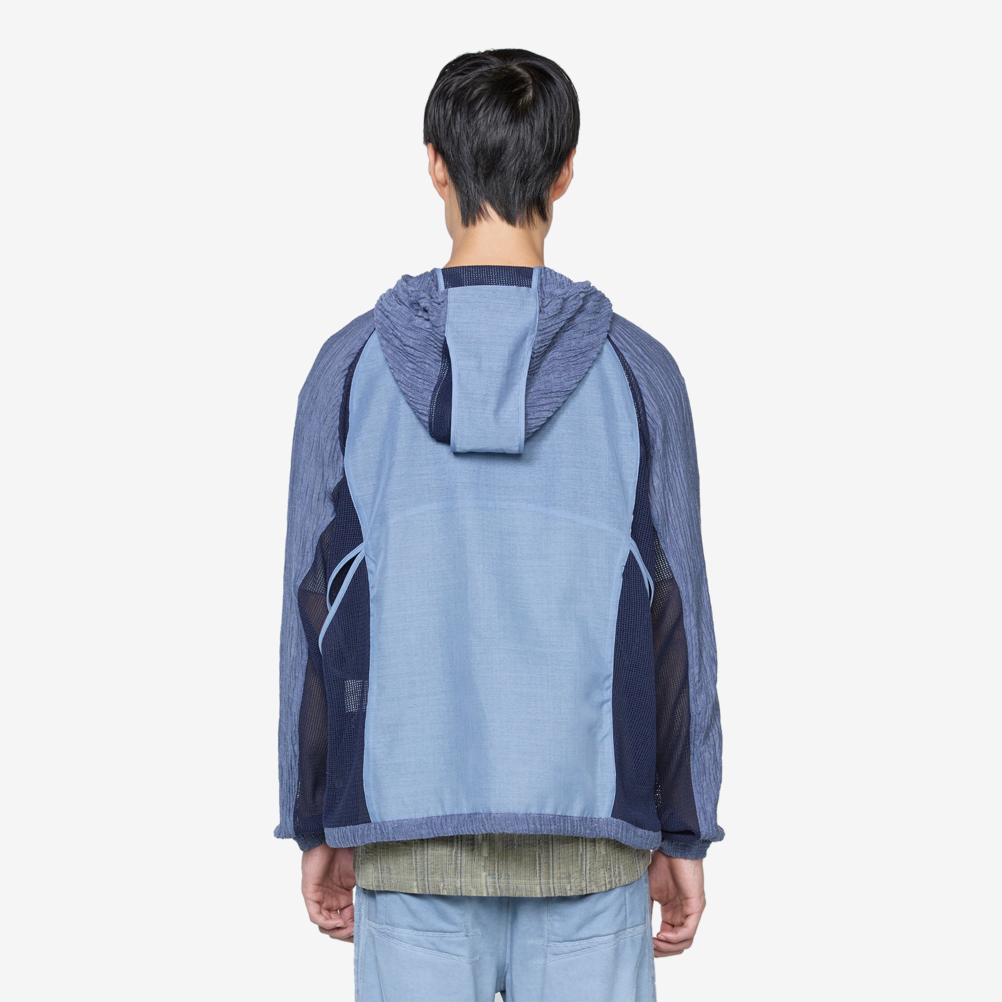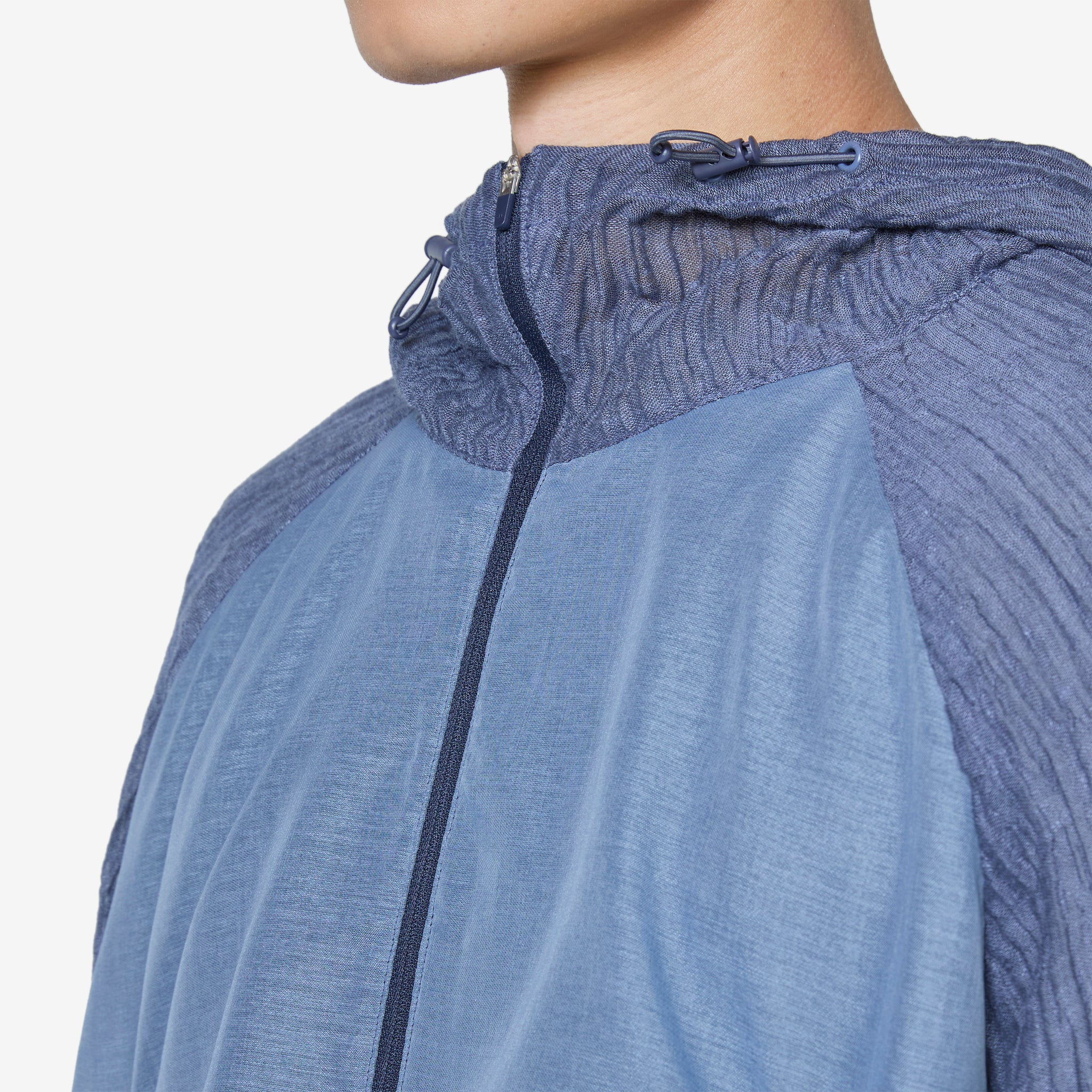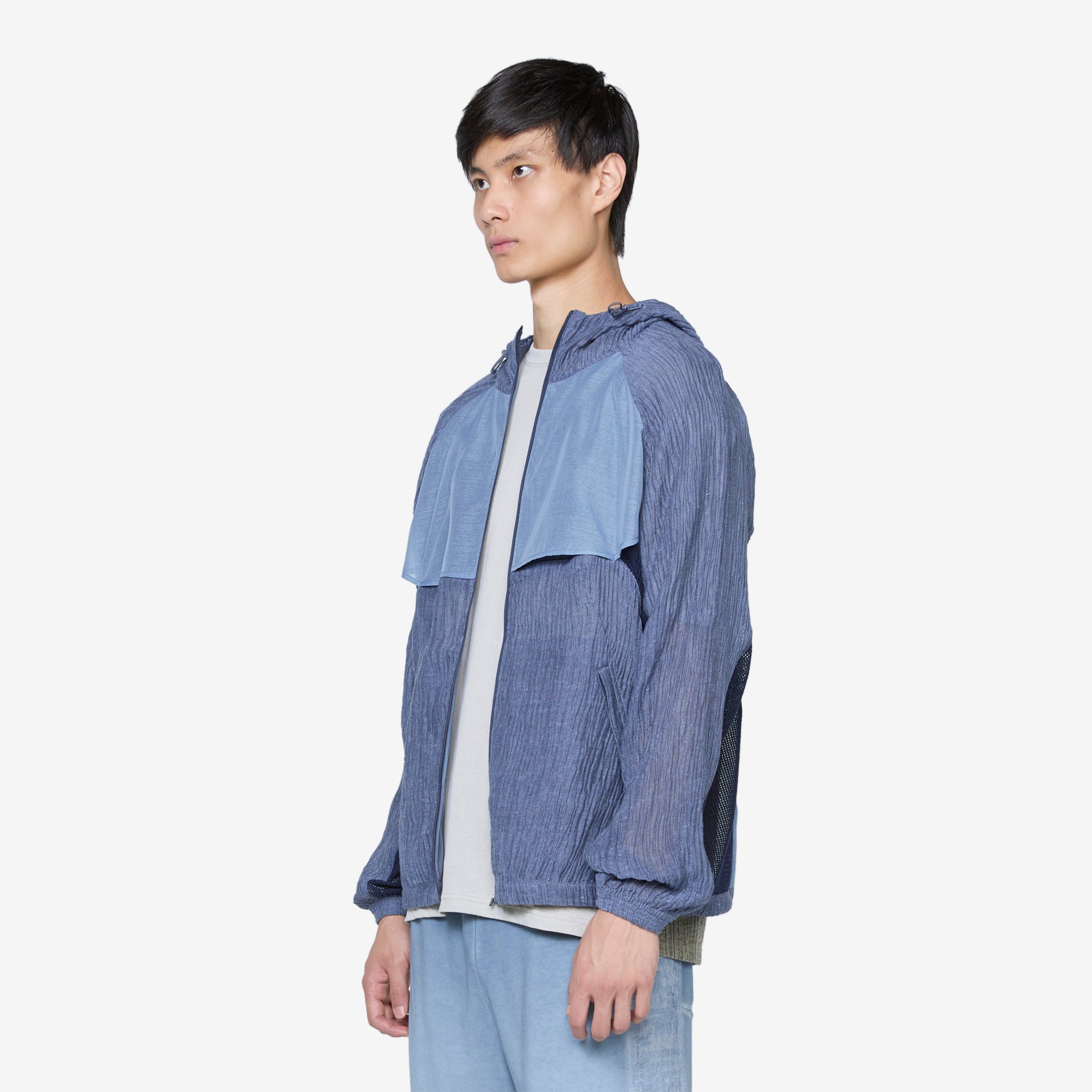 Men's Ep.5 08 Jacket in Blue from XLIM. Regular fit jacket with a full-zip closure, a funnel neck, adjustable drawstring hood, elasticated cuffs and adjustable hem. Panelled mixed textile construction with darts on the front. Finished with two angled welt pockets with zip closure on the front.