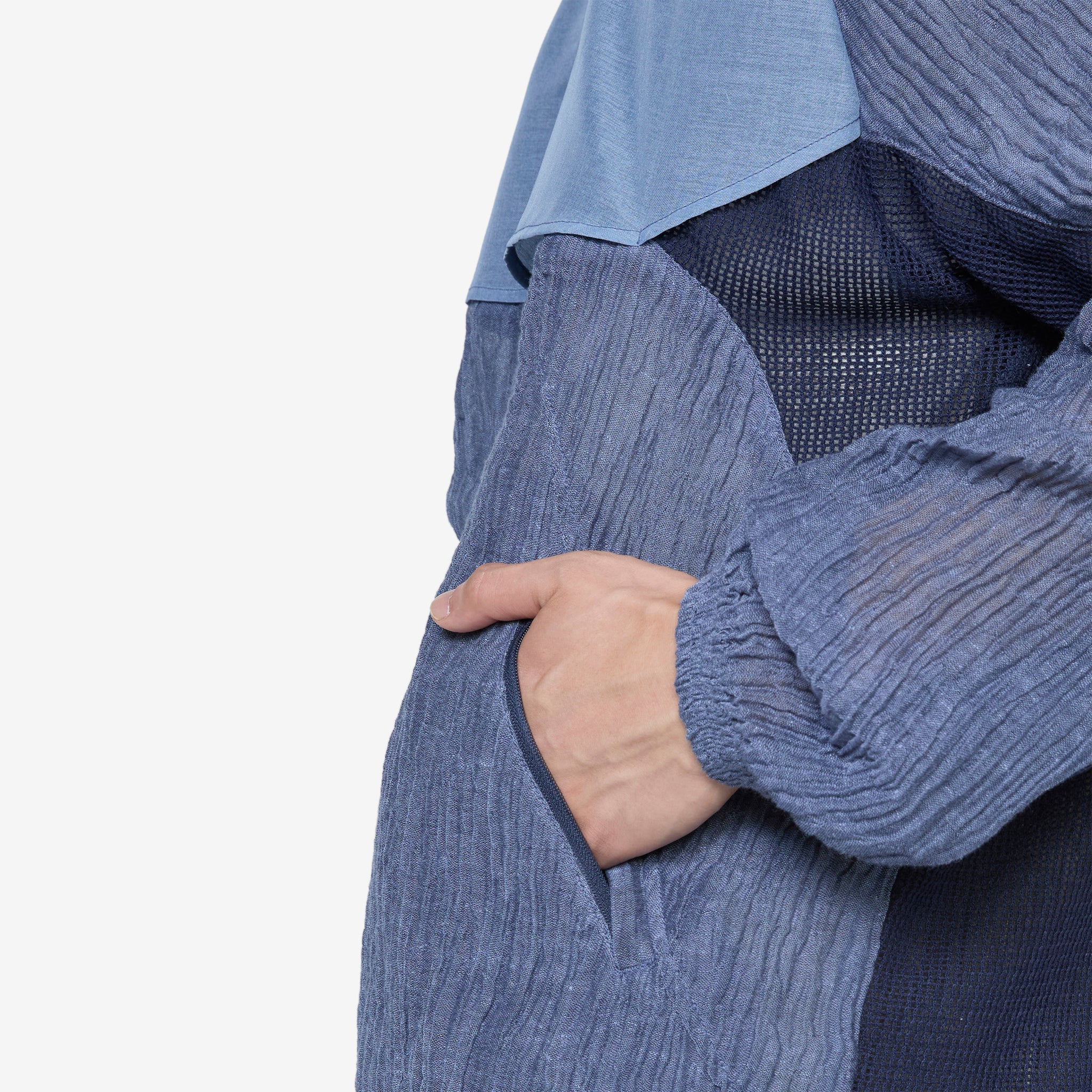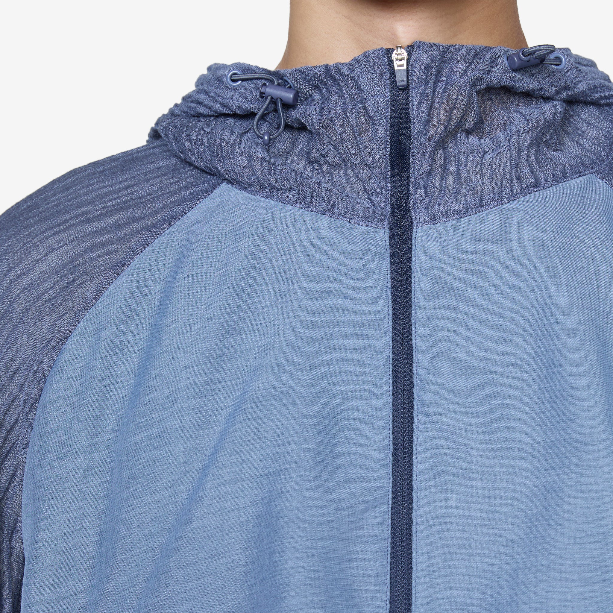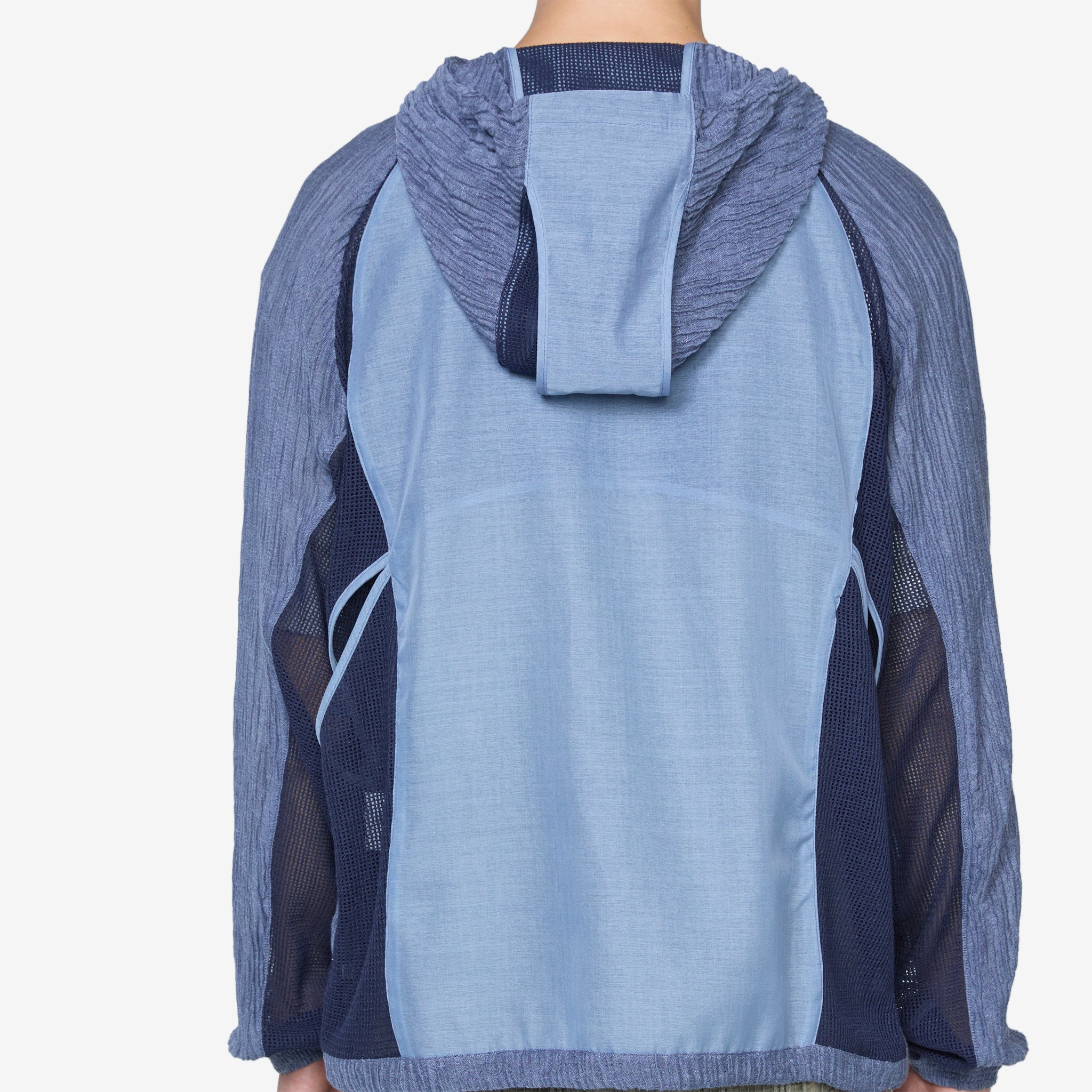Men's Ep.5 08 Jacket in Blue from XLIM. Regular fit jacket with a full-zip closure, a funnel neck, adjustable drawstring hood, elasticated cuffs and adjustable hem. Panelled mixed textile construction with darts on the front. Finished with two angled welt pockets with zip closure on the front.
