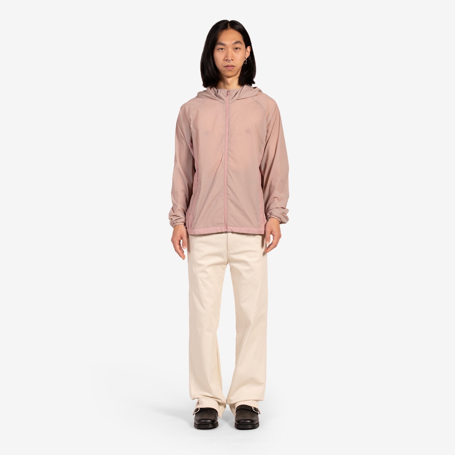 Ep.3 Synopsis 03 Jacket in Pink from XLIM. Crafted from a lightweight polyurethane blend for a translucent finish with a water-resistant coating. Features lace panelling with panelling, a stowaway hood with velcro closure and drawcords in the hem.